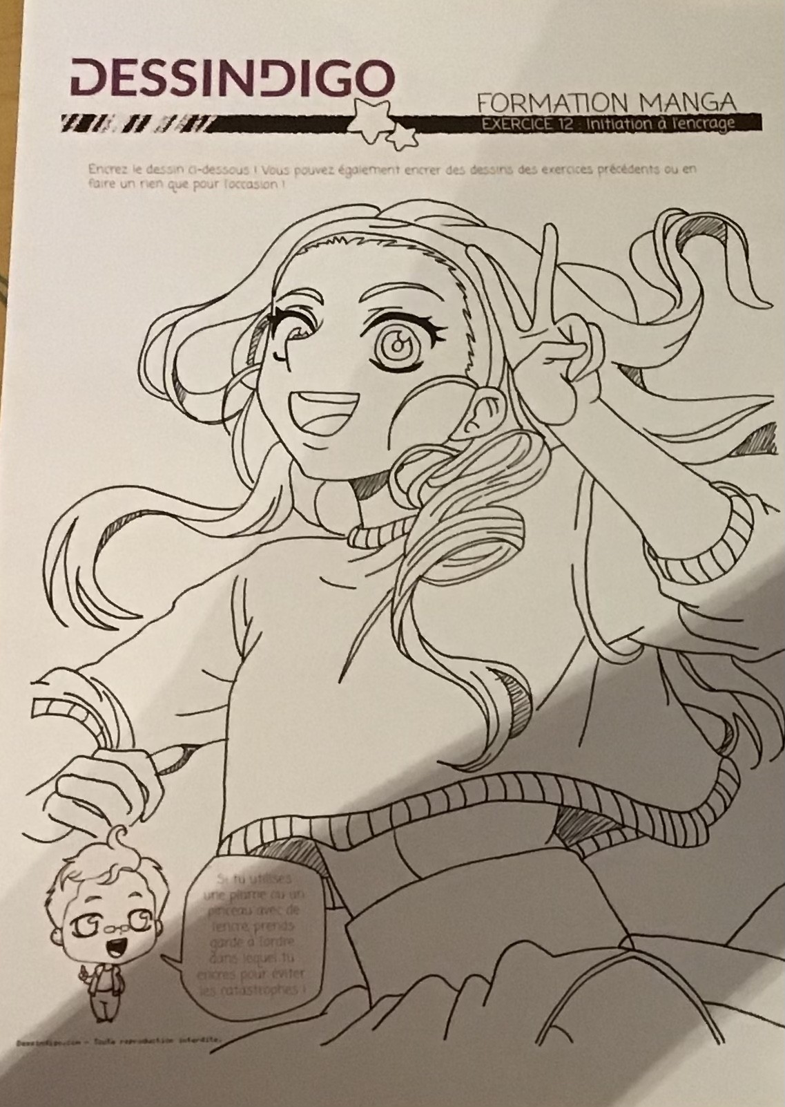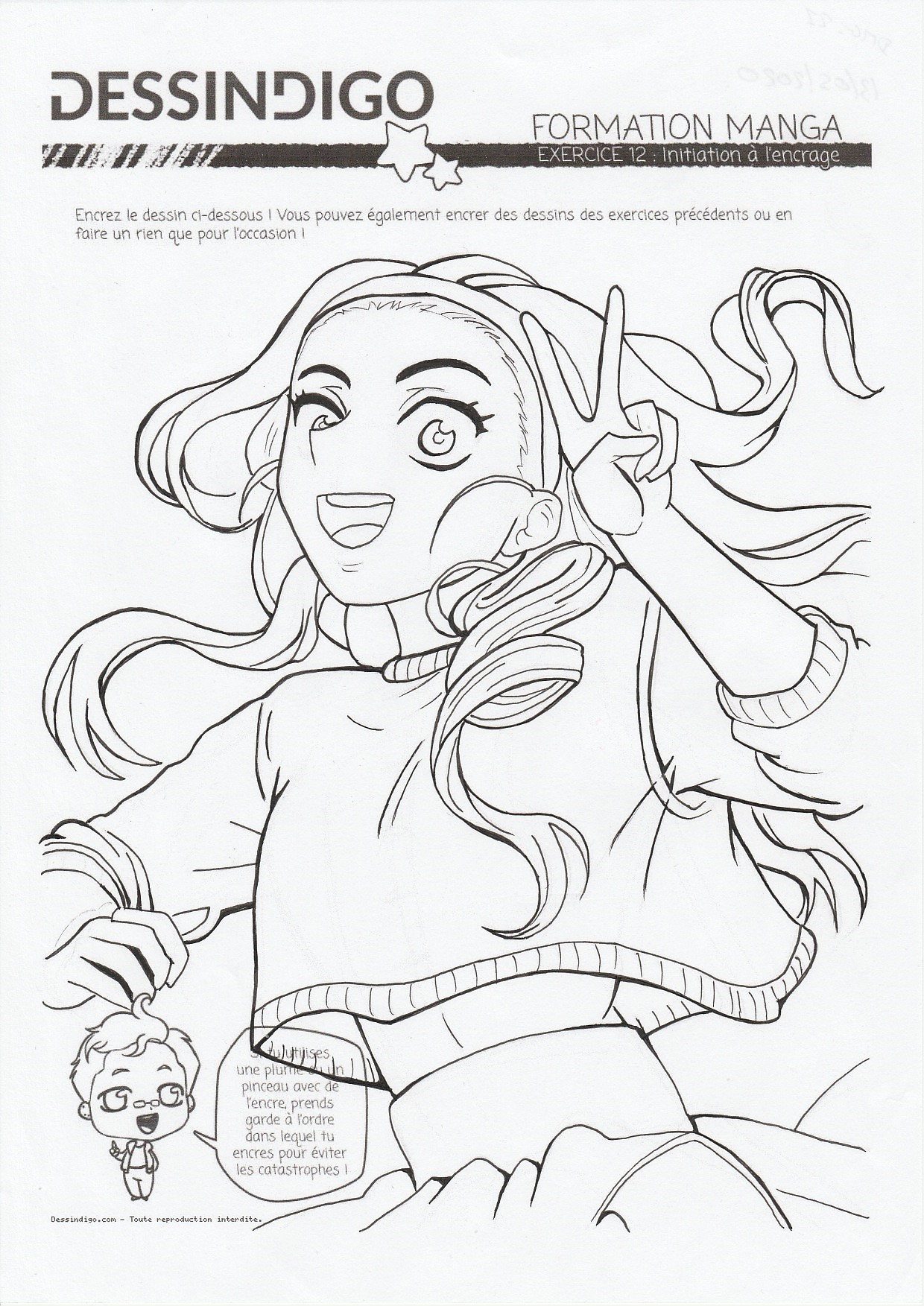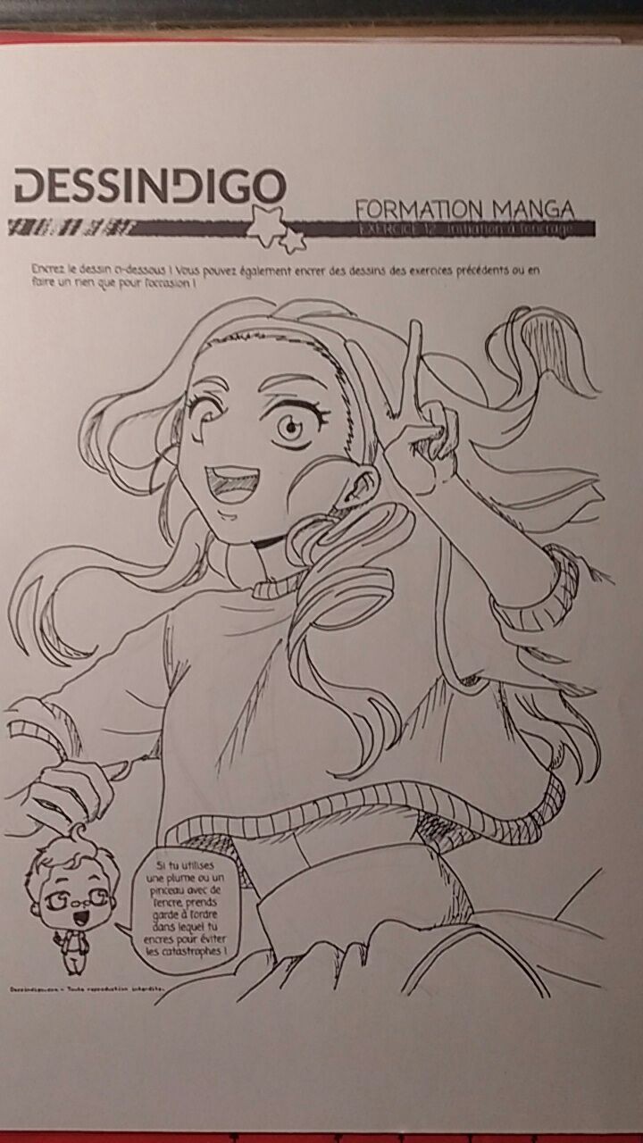 Si tu ne suis pas ce que tu as fait en-dessous, du coup, c'est problématique. N'hésite pas à t'entrainer, ça prend un peu de temps avant qu'on se sente à l'aise et qu'on arrive à faire des jolis traits. Prends ton temps, n'essaye pas d'aller trop vite et suis bien ton dessin en-dessous. Tu vas probablement bouger certaines choses malgré toi (sur les cheveux par exemple), parce que tu es partie sur une courbe légèrement différente qui décale un peu la mèche, etc. Mais globalement, le but du jeu c'est de bien suivre le croquis de base ^^