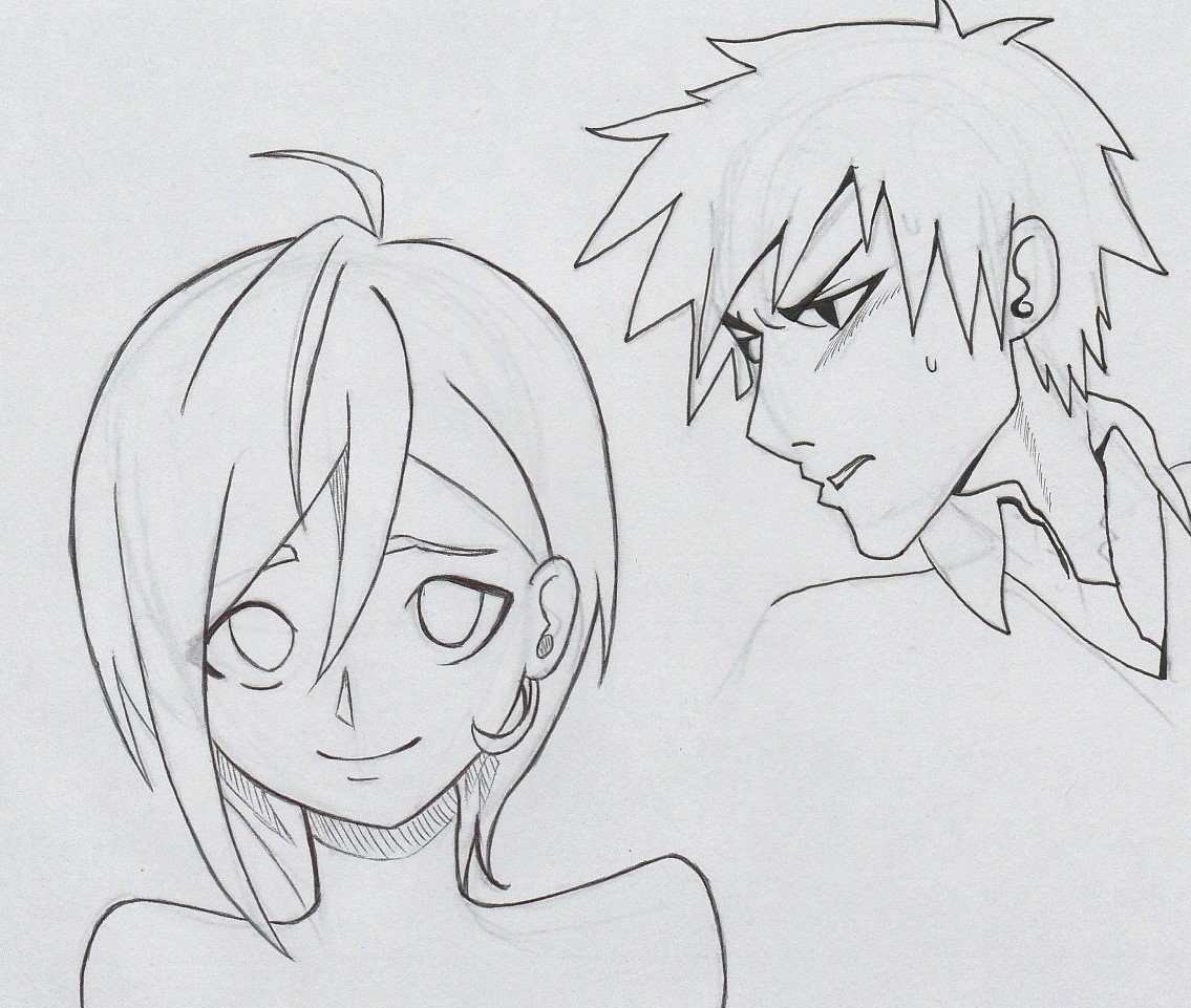 Same kind of comment for the brunette. Also, don't necessarily try to do your filling of the hair in the direction of the strands; you can experiment by keeping your hatching in the same direction as those on the body.