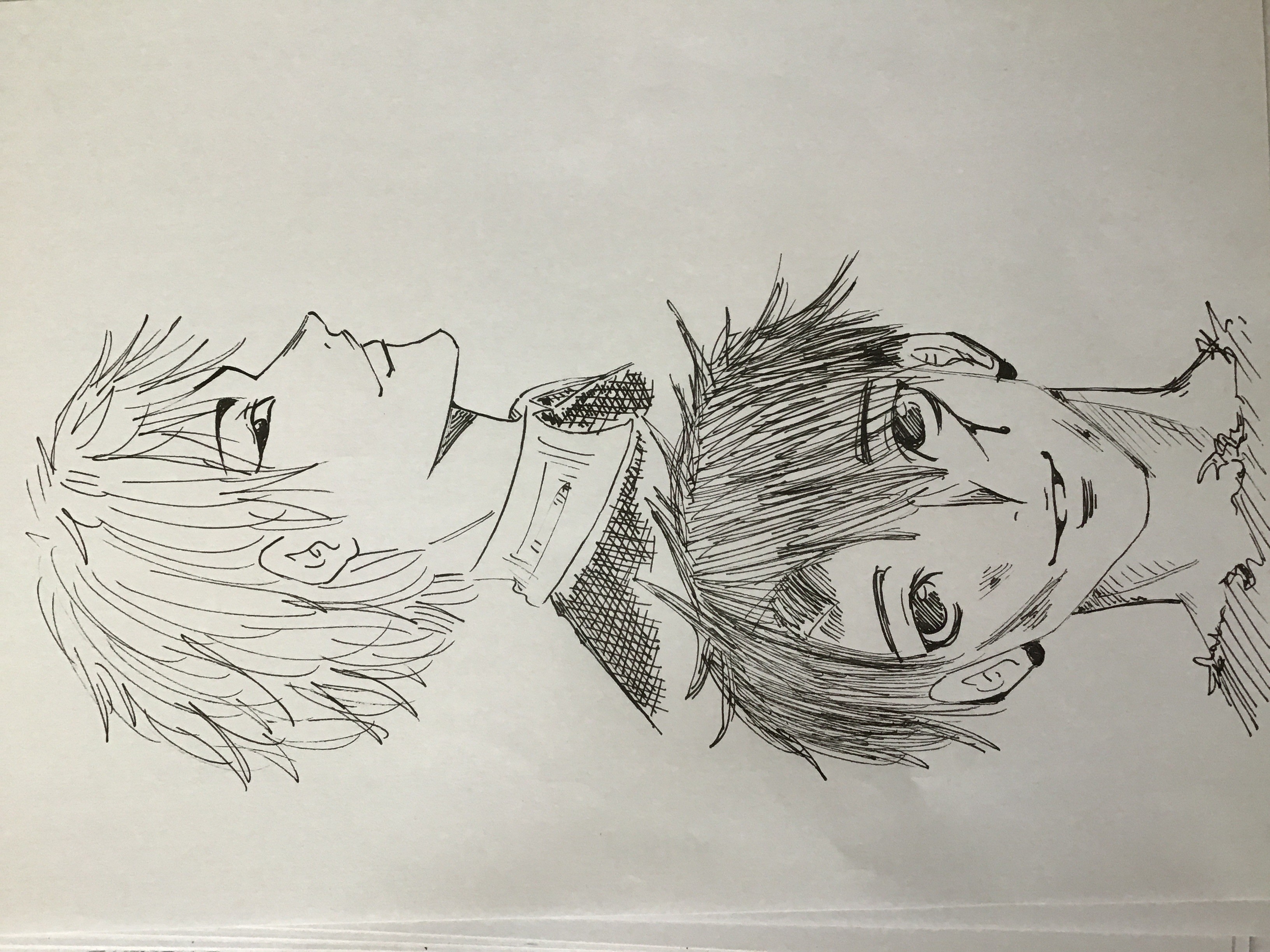 I really like the inking of the faces, it looks very good. However, I think the hair needs some work. On the blond, the strands are too uniform everywhere, and it looks a bit crude compared to his face which is treated with a certain finesse. Moreover, I notice that you add some shadows on the skin, but none on the hair. It could be light and focused on certain specific areas (like towards the nape, for example).