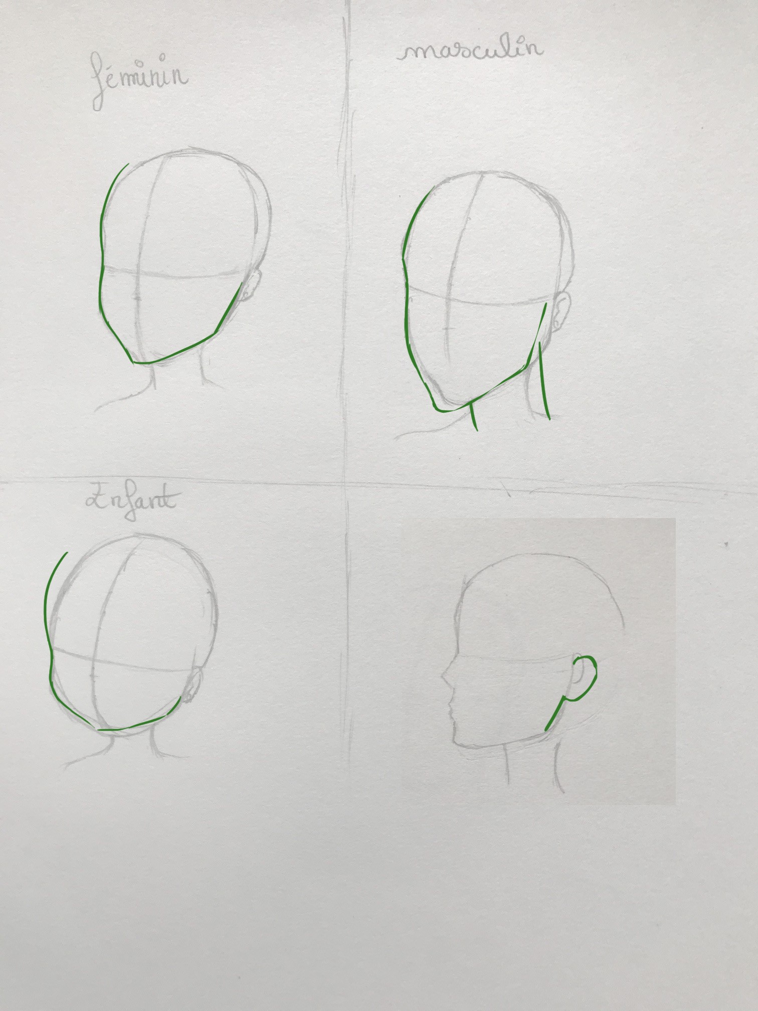 Sur le 3/4 tu as trop marqué la différence de taille entre les deux yeux (même si on le verra dans les cours suivants ;p). Le creux entre le front et la joue est l'endroit où se positionne les yeux, du coup on voit que chez toi, il est placé trop haut et ça manque un peu de front aussi. Mais le reste fonctionne bien ;p