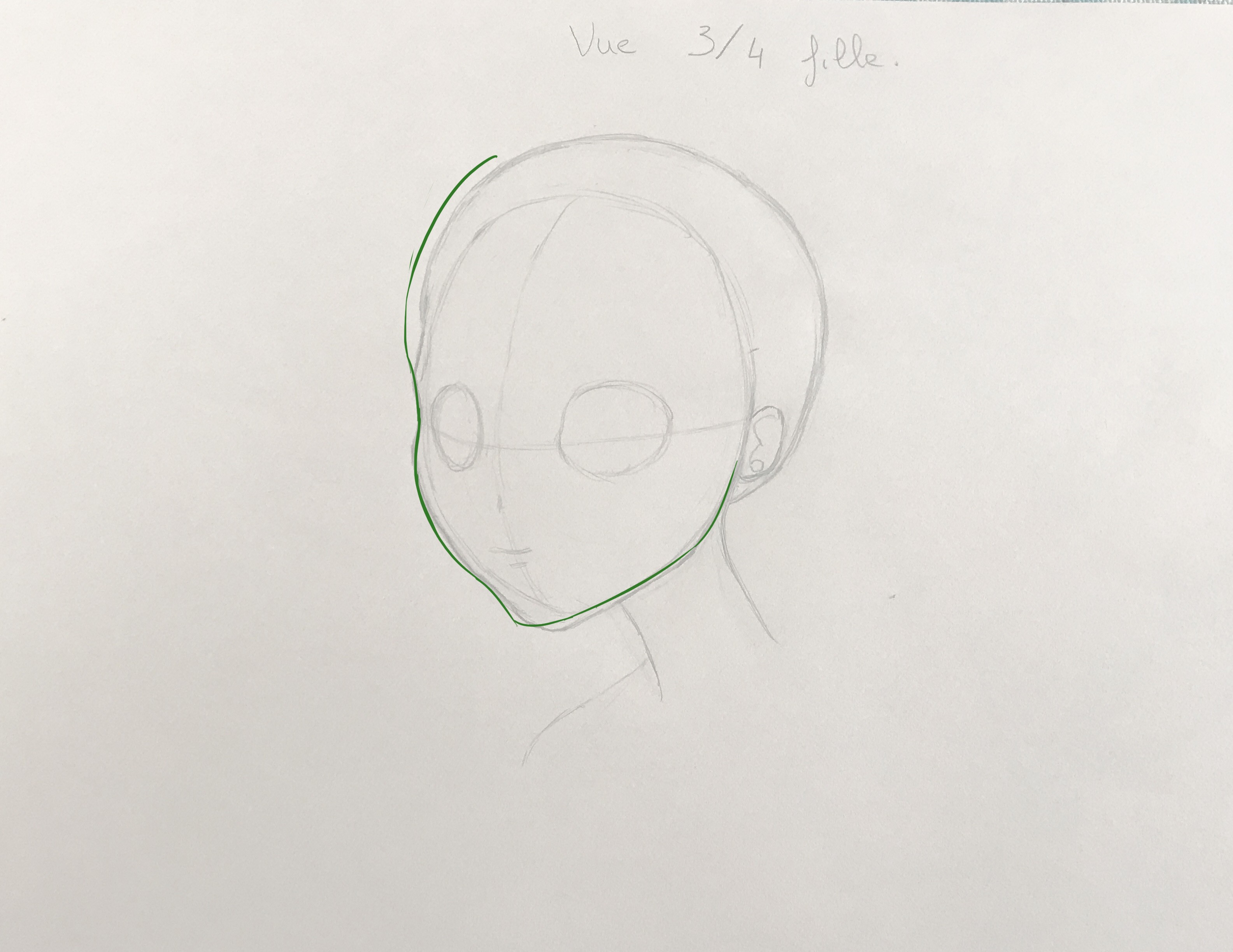 In the 3/4 view, you have overly emphasized the size difference between the two eyes (even though we will cover this in the following lessons ;p). The hollow between the forehead and the cheek is where the eyes are positioned, so it appears that in your case, it is placed too high and there is also a lack of forehead. But the rest works well ;p