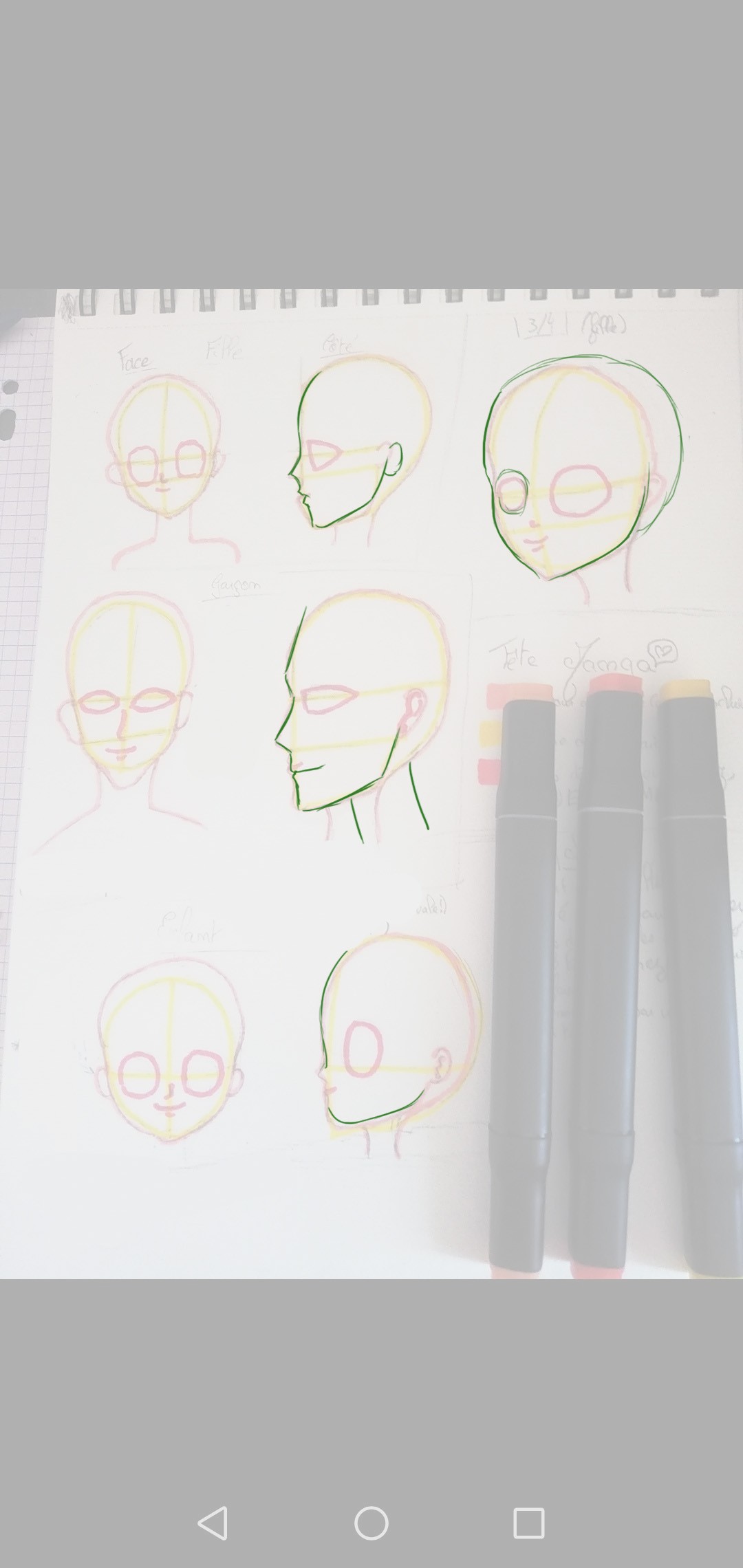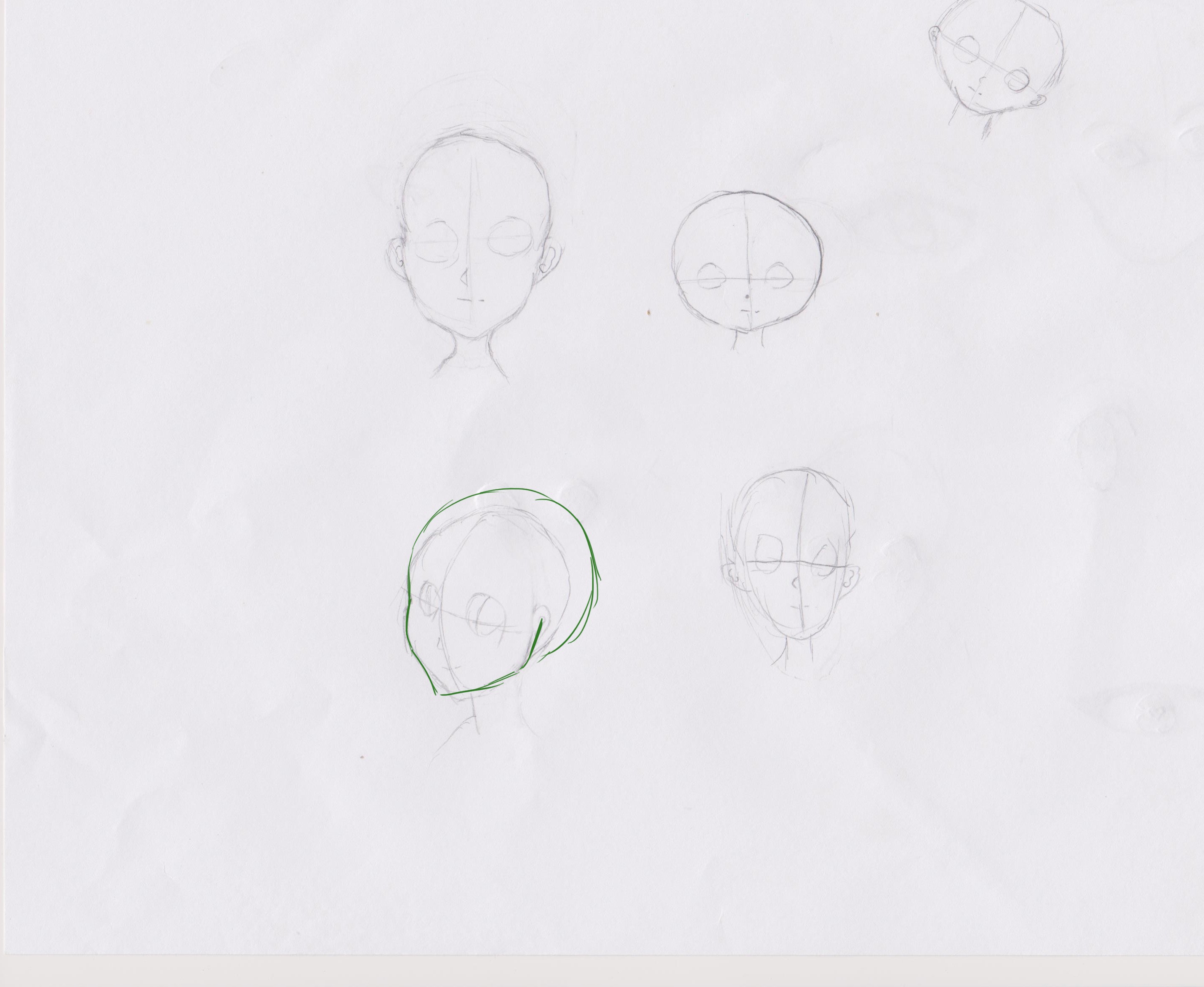 Je t'ai joint une mini-correction de certains visages, je te laisse repasser sur tout ça :3 Essaye aussi d'avoir le même visage sous tous les angles donc toujours la même longueur de menton, une forme similaire de visage, etc.