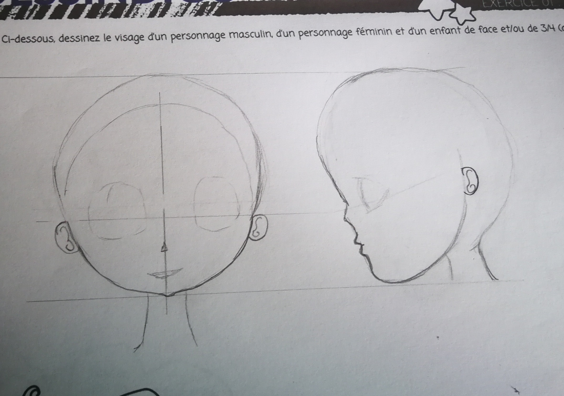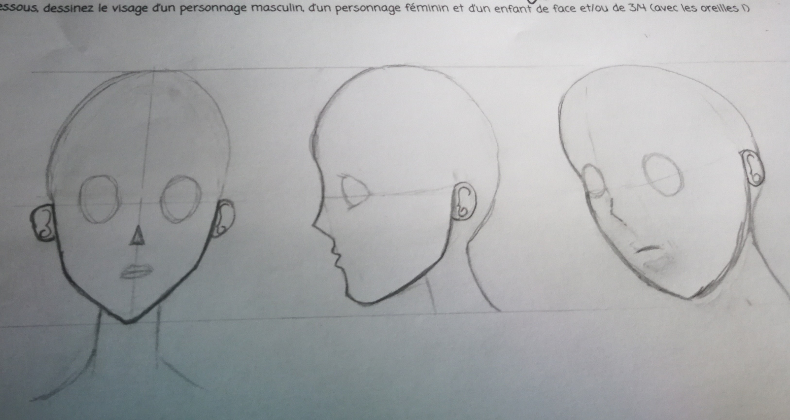 Les visages de face sont impeccables, de 3/4 on est pas mal aussi, mais le front manque de bombé pour l'enfant et la femme (je te laisse voir des commentaires au-dessus qui ont le même souci ^^) par contre de profil, le visage est trop large. Attention aussi, la mâchoire s'arrête devant l'oreille. Les oreilles s'accrochent le long de la ligne de la mâchoire qui remontent "verticalement". Le front de l'homme est top haut et trop bombé aussi et son nez commence un peu bas mais tu pourras retravailler ce dernier point prochainement ^^