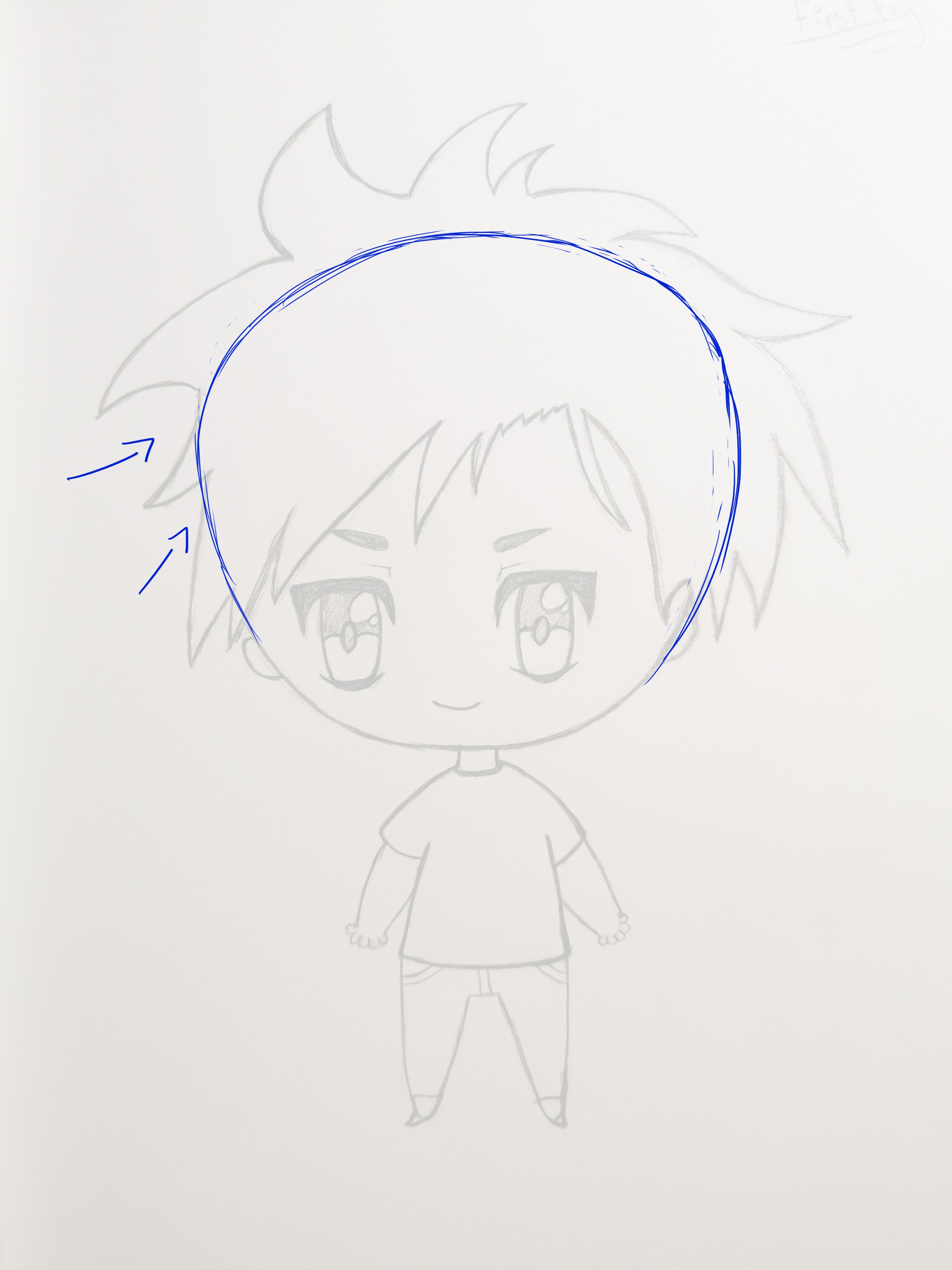 1. attention à la taille des bas (ou des jambes ça dépend). Même si on est sur une version simplifiée mignonne, pour que ça fonctionne, on doit garder certaines proportions générales, notamment celles du corps. Ici les bras sont très courts, ou les jambes très longues. Dans l'idéal, il faut que les bras descendent au moins jusqu'à la taille. Là ton petit chibi ne peut pas mettre les mains dans les poches, ni croiser les bras.