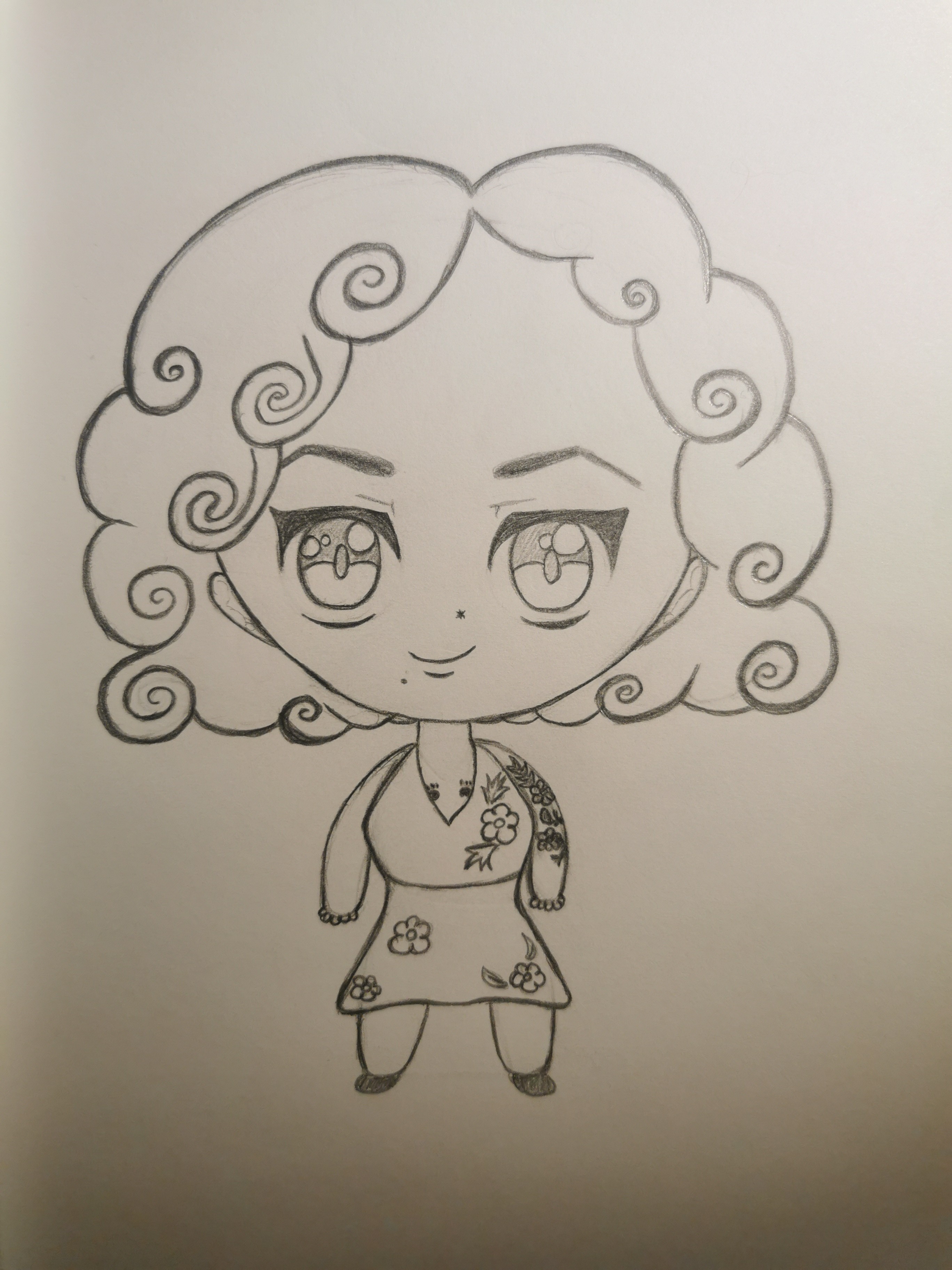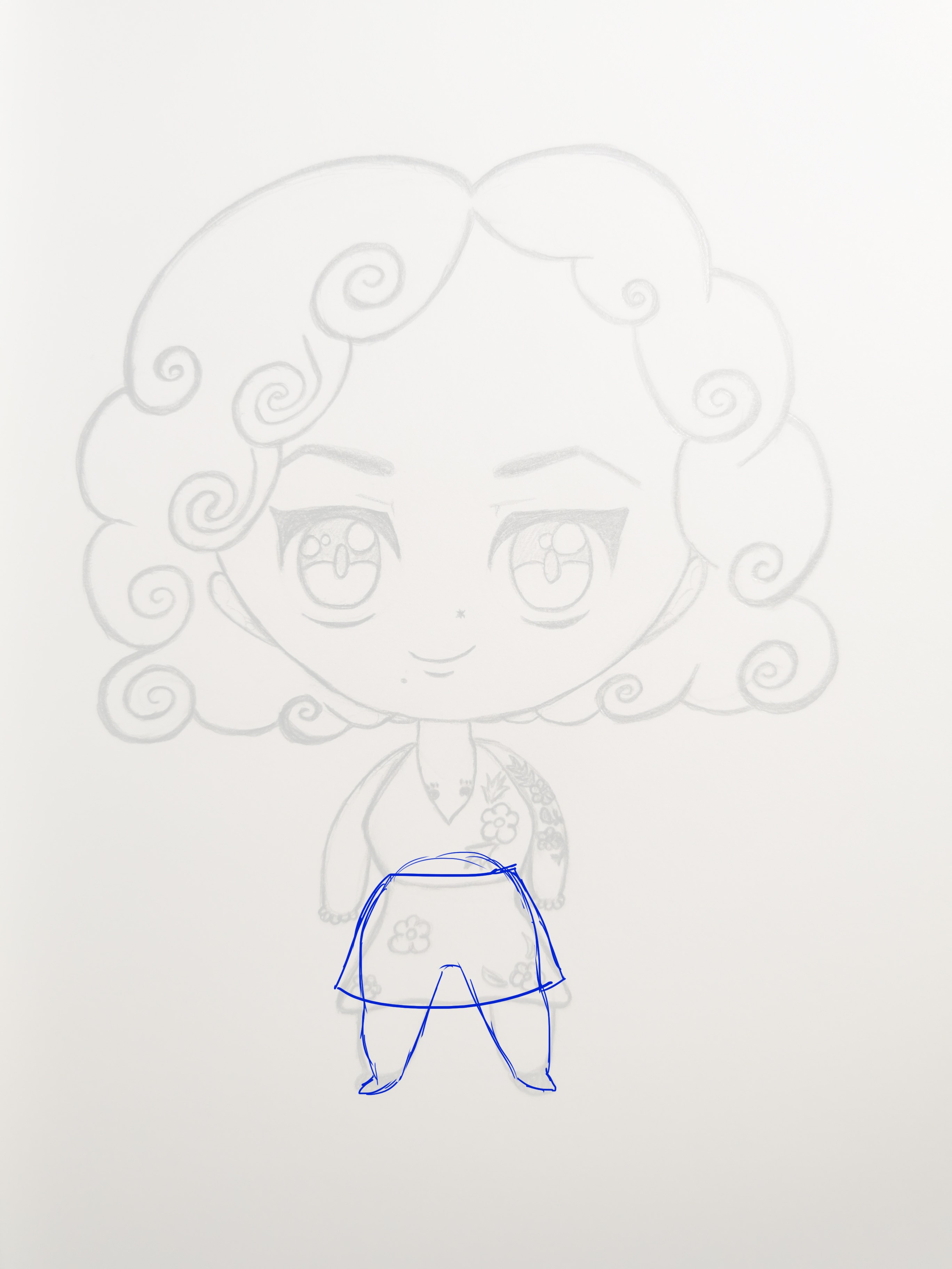 Ici les jambes ont l'air droites et de ne pas vraiment partir du bassin, à moins que le chibi ait les jambes pliées en partie mais ce serait étrange et le dessin de la robe ne serait pas juste non plus. Je te joins une correction pour que tu visualises :)