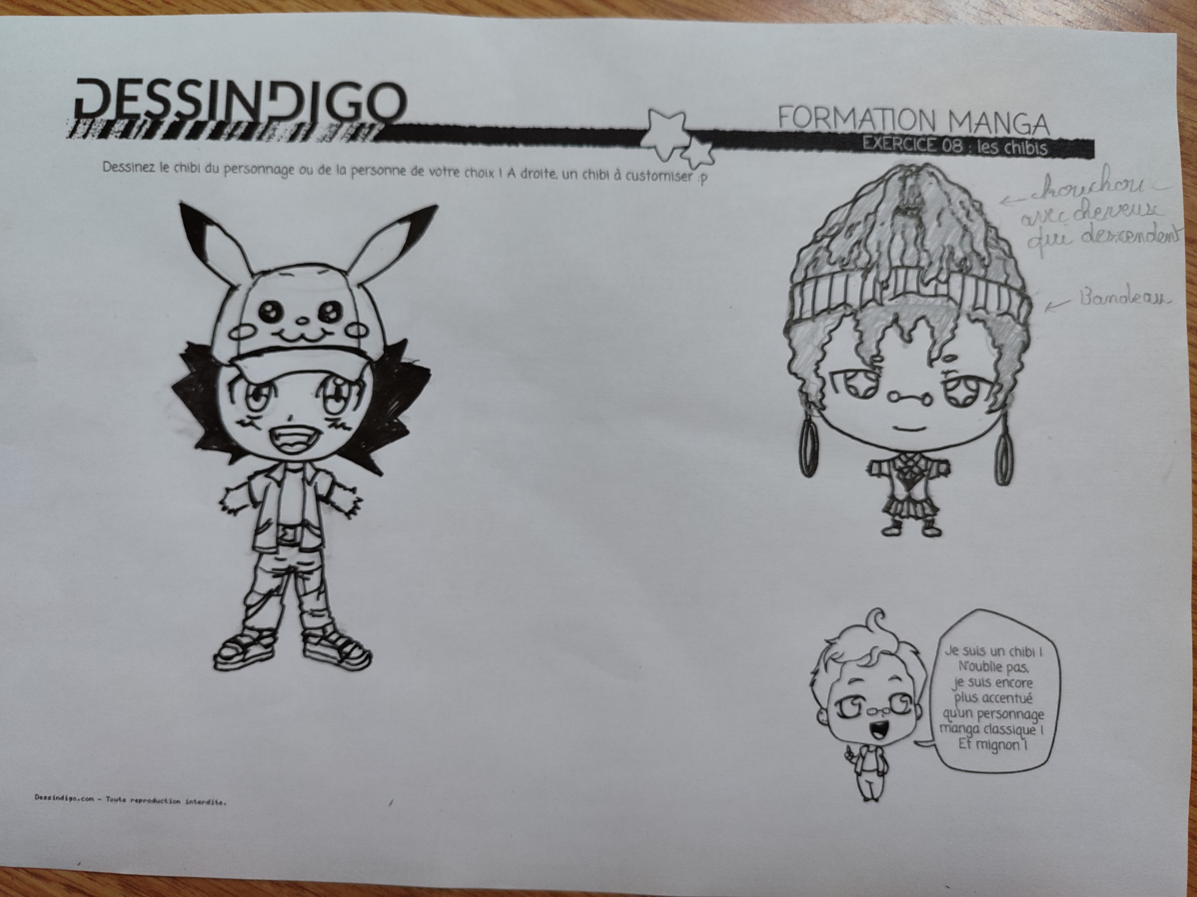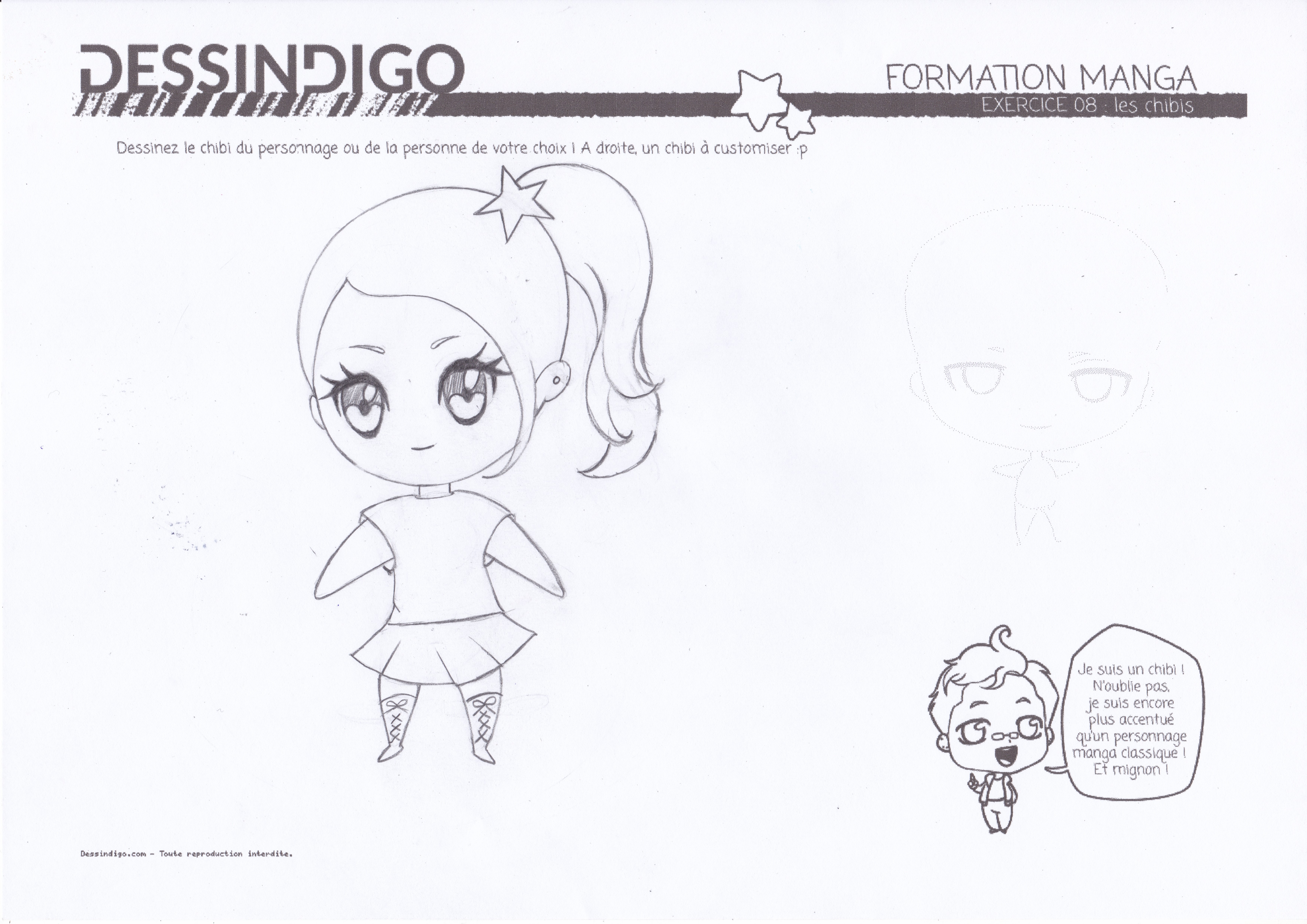 Niveau proportions, en suivant les explications du cours il faudrait que le corps dans sa totalité soit de la même taille que la tête. Ici, tu l'as fait clairement plus grand (d'ailleurs c'est dommage qu'il soit coupé par le bord de la feuille). Mais comme expliqué dans la vidéo, il y a plusieurs façons de faire des chibis! :)
