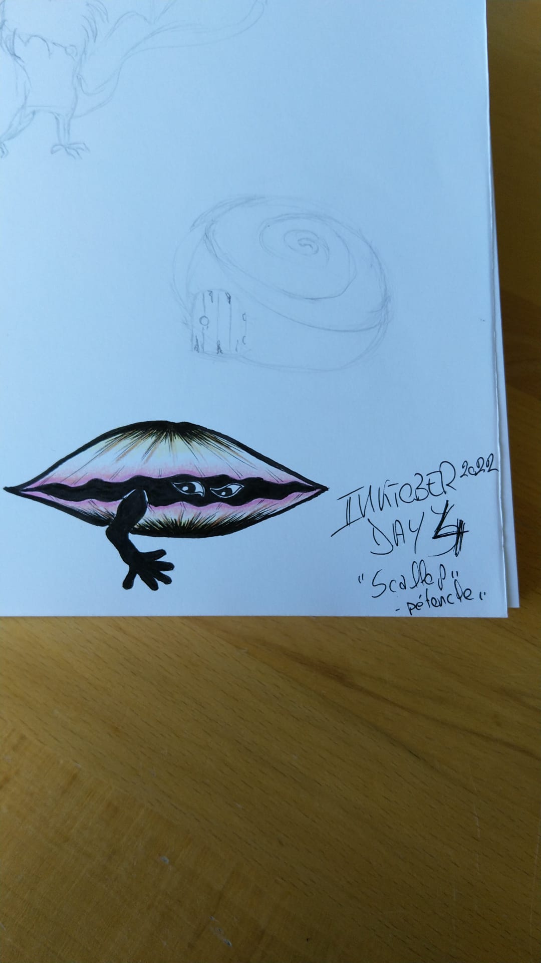 J'ai pensé coquille, et j'ai pensé à la coquille d'escargot, avec une porte, potentiellement la maison de mon batcat ;o) Puis j'ai repensé aux images vues sur les coquilles St-Jacques et jai finalement dessiné ce coquillage, dans l'esprit Halloween, alors j'essaie d'être un peu effrayante 😂