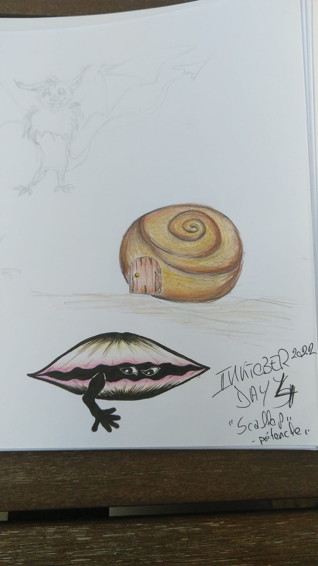 I thought of a shell, and I thought of a snail shell, with a door, potentially the house for my batcat ;o) Then I remembered the images I saw on scallop shells and I finally drew this seashell, in the Halloween spirit, so I'm trying to be a bit spooky 😂