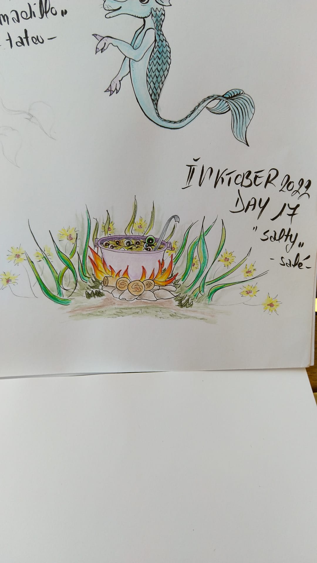 Not knowing that 10 days later the theme would be "the snack" - I don't look at the whole list, I look at the daily theme every day, I find it more interesting to discover each morning the daily theme and rack my brains before taking my pencil....isn't that the purpose of the challenge?!???? -, I had the idea of a cauldron, thinking about "the Smurfs' soup" ;o)
