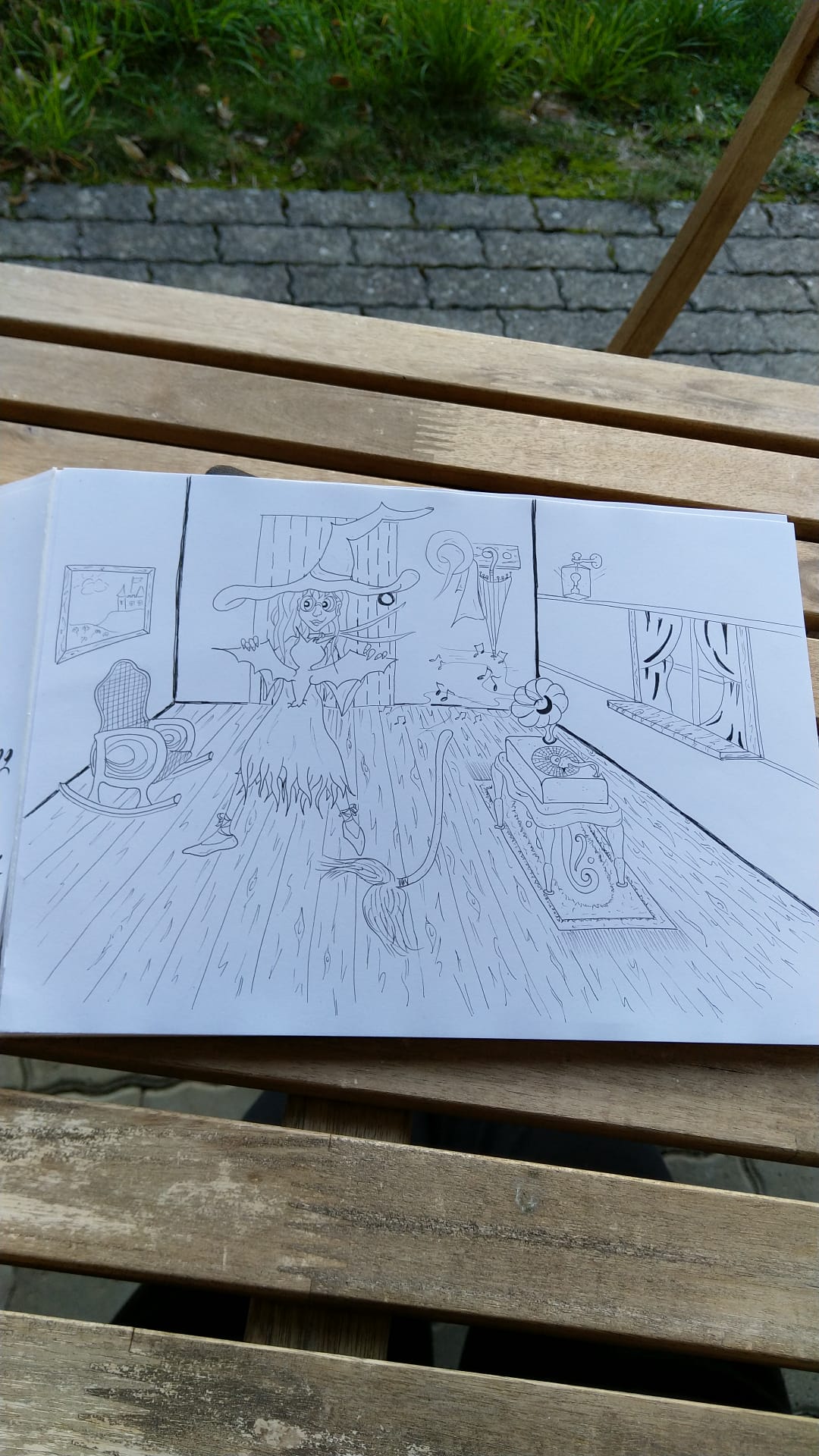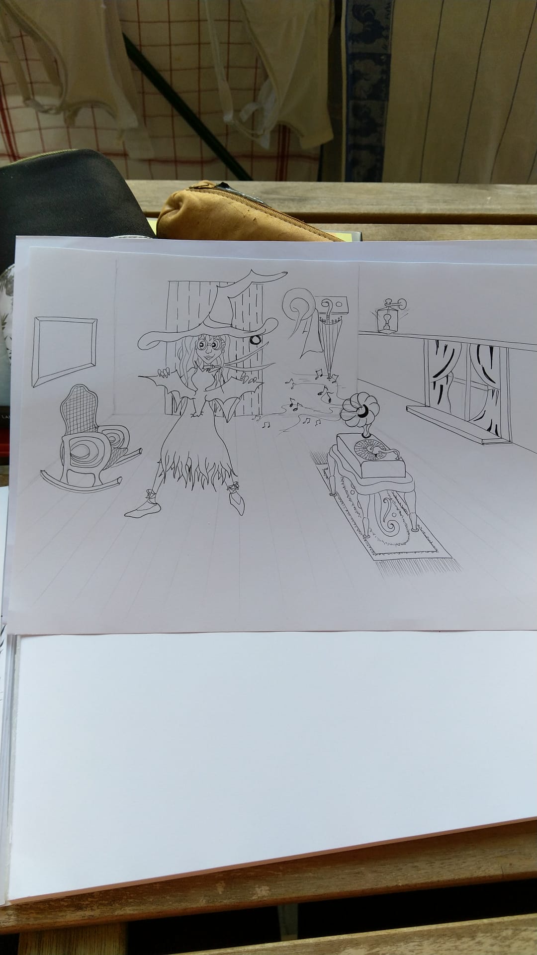 And then, I embark on an integrated concept without realizing it, the perspective of a room, all this freehand, "seeing" the lines on my paper, without drawing them! I start with my little witch, then, the table with the gramophone, and I continue to fill my room: the back wall with the front door of the cottage, the side walls, the window...