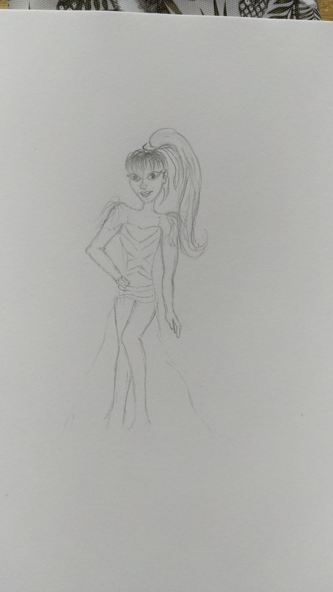 Et là, je m'embarque dans une notion intégrée sans m'en rendre compte, la perspective d'une pièce, tout ça à main levée, en "voyant" les lignes sur ma feuille, sans les dessiner ! Je commence par ma petite sorcière, ensuite, la table avec le gramophone, et je continue à remplir ma pièce : le mur du fond avec la porte d'entrée de la chaumière, les murs de côté, la fenêtre....