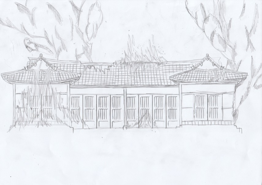 je ne suis un pro de l'arrière plan mais me voila en train de dessiner une maison de style japonaise en ruine ET EN FEU!!