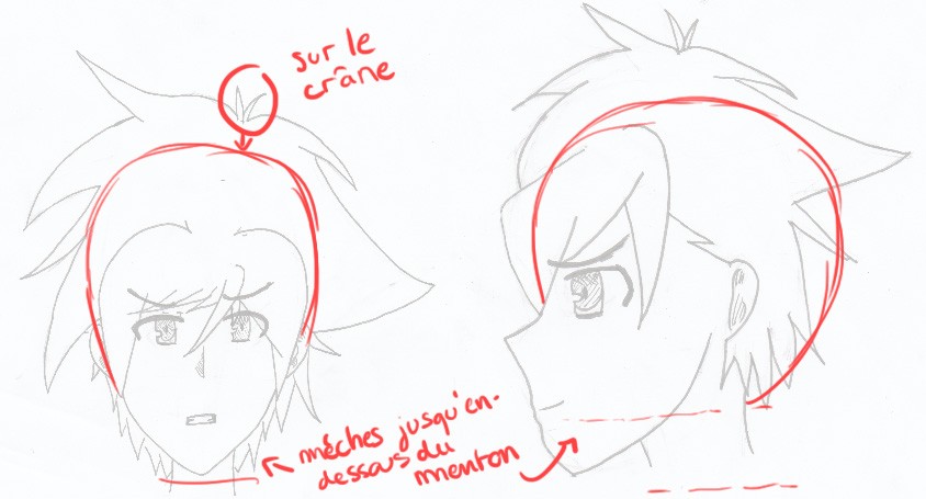 Bonjour, j'ai crée un personnage pour un manga et j'ai réalisé sa coupe de cheveux mais je ne sais pas comment réaliser les zones entourées en rouge pour la vue de profil