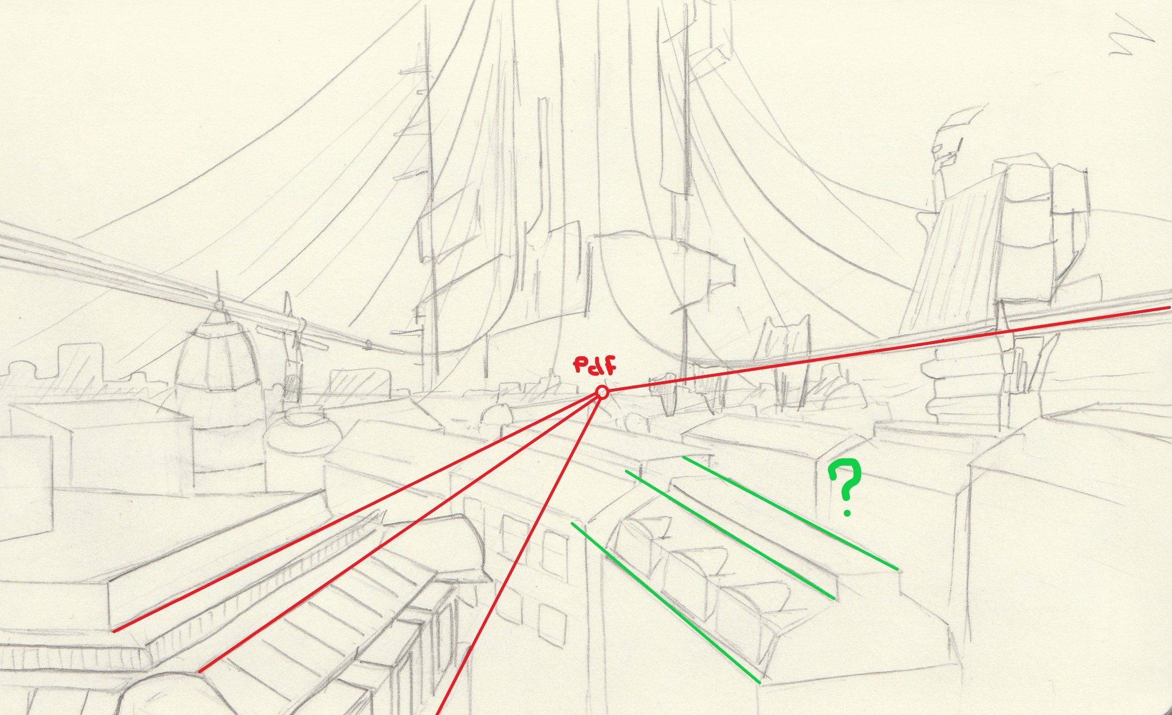 En faisant une étude de mon fond d'écran qui est la première scène du dernier Half Life en VR (qui est une véritable tuerie d'ailleurs), je me suis rendu compte d'une chose un peu gênante concernant l'orientation de la perspective des bâtiments. Les lignes horizontales frontales (en rouge sur mon dessin) sont clairement dirigées vers un point de fuite central, mais du coup... ou vont les autres horizontales (en vert sur le dessin) ?