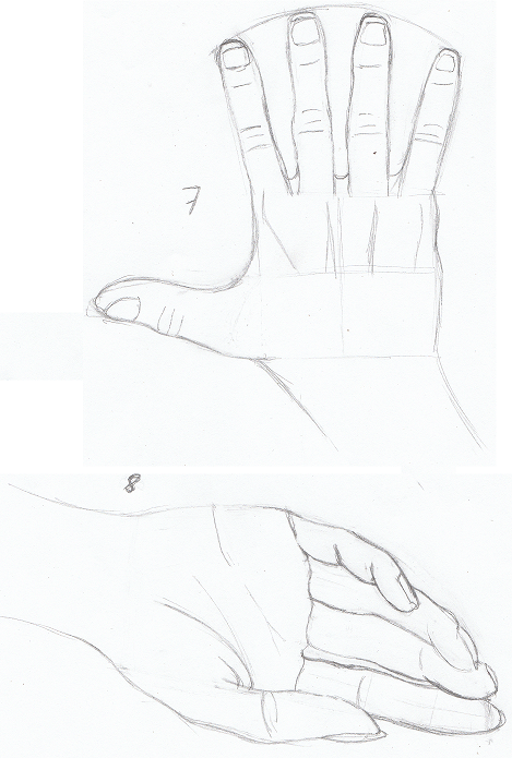 Je vois quand même un élément qui ressort régulièrement sur tous tes croquis : attention à l'épaisseur des doigts par rapport au reste de la main. Tu as tendance à les faire assez épais, en particulier le pouce. Et attention à leur forme aussi. Les doigts ne sont pas des cylindres, ils sont un poil plus fins vers le bout, un poil plus épais vers la première phalange ^^