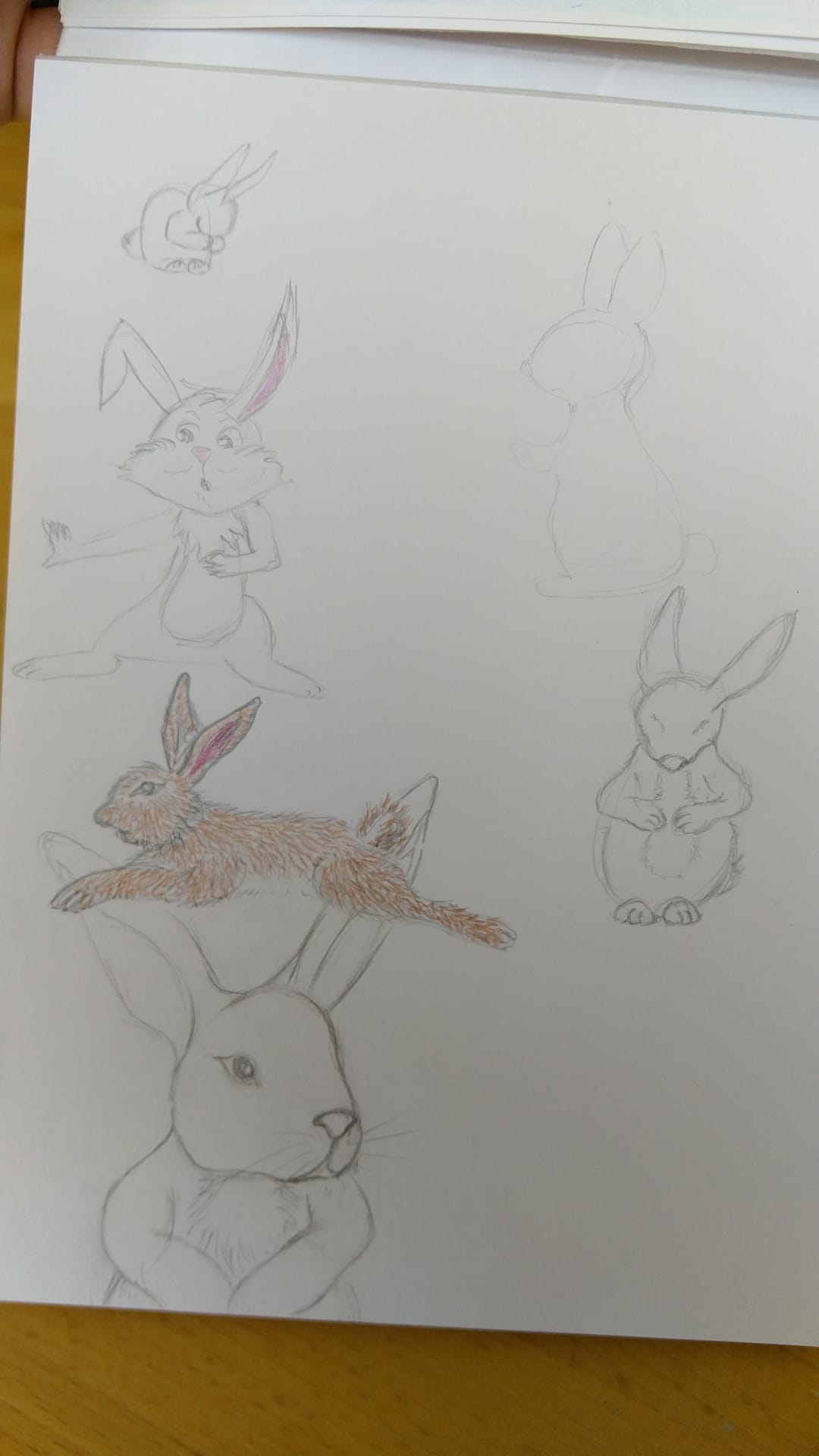 here are my little rabbits; on the top right, taken from the children's coloring book "In the Land of Calm" "Enchanted Nature", on the top left, the little bunny grooming itself and the cartoonish rabbit, the models are in Soizic Mouton's book "Draw Everything", below, the colored model is taken from Doug DuBosque's book, and the other two models are head sketches…