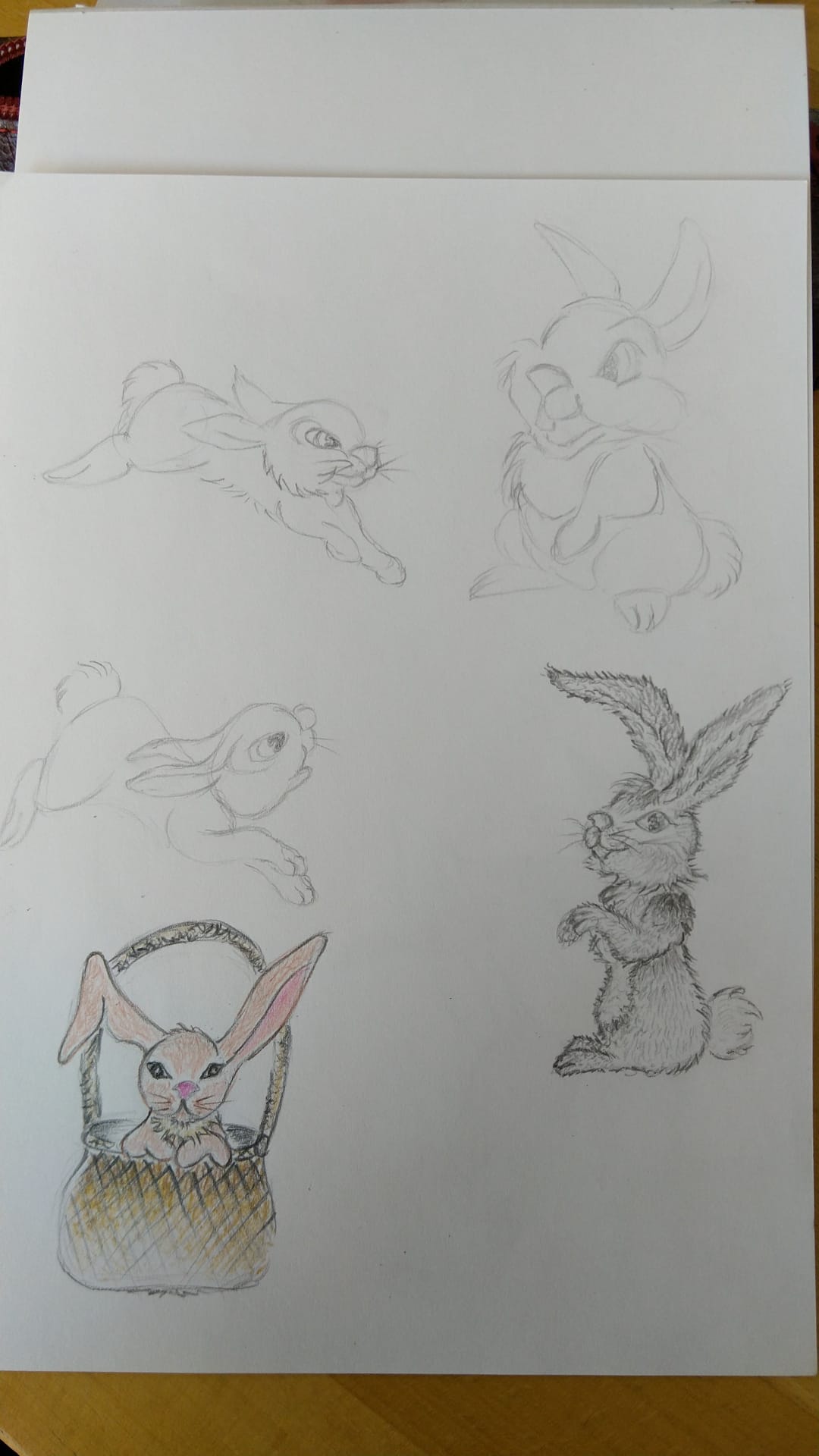 Fan of Disney and its drawing style, I couldn’t resist drawing Thumper, which I did in a very large format for my daughters' room when they were little ;o) I had drawn Bambi with Thumper and the other rabbits around him (Bambi was about 1m and the rabbits 30cm - when I was young, I always enlarged my drawings, I bought the large sheets at the stationery store and reproduced Disney and Marsupilami). The two drawings at the top are Thumper, below left, one of the rabbits (which stirred up beautiful memories - those were the good days -), and attempted again to draw from imagination with the little rabbit on the right well, do you already hear the bells? It's Easter tomorrow, so there needed to be a little bunny in a little basket... the eggs are hidden inside hi hi