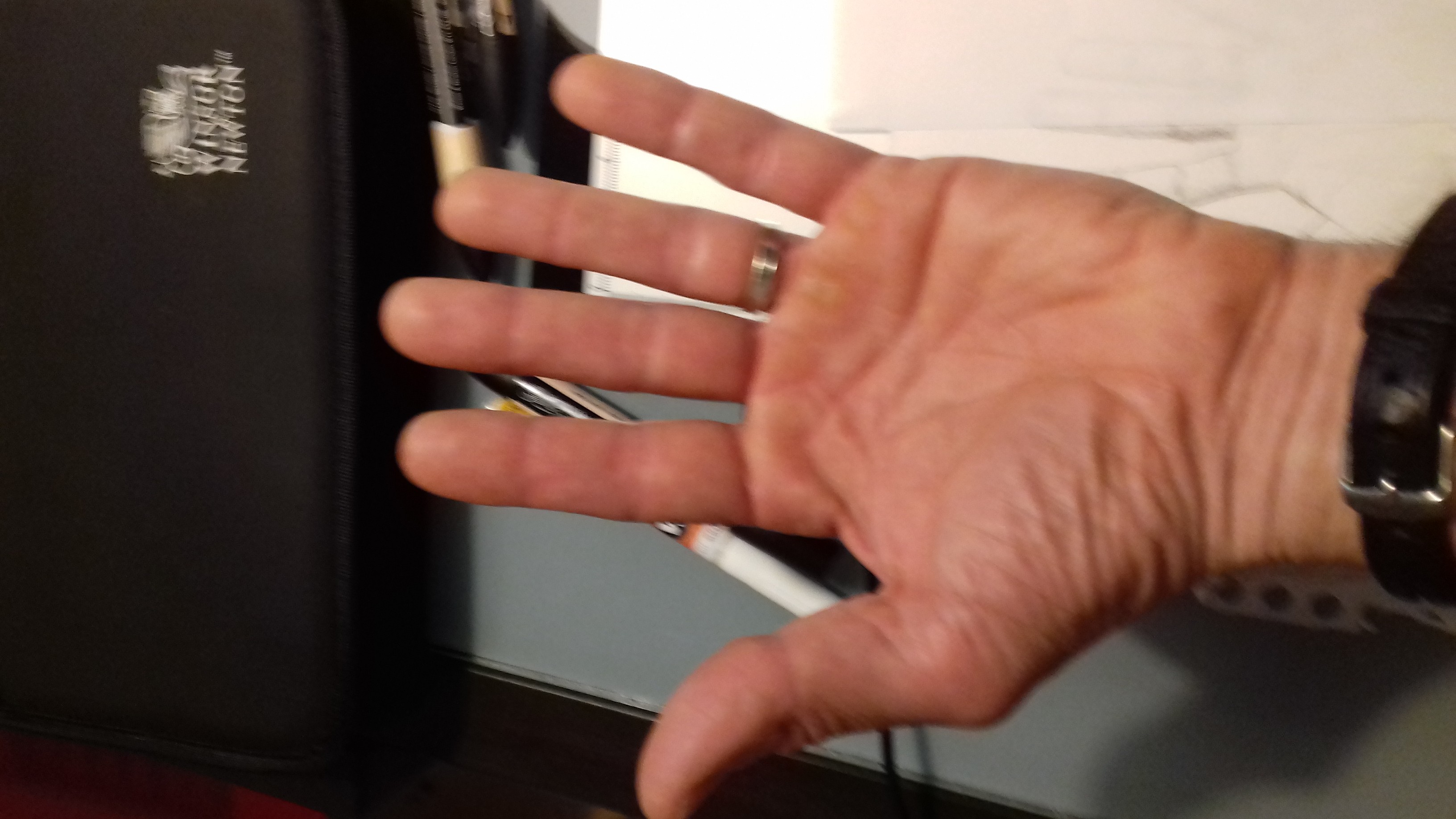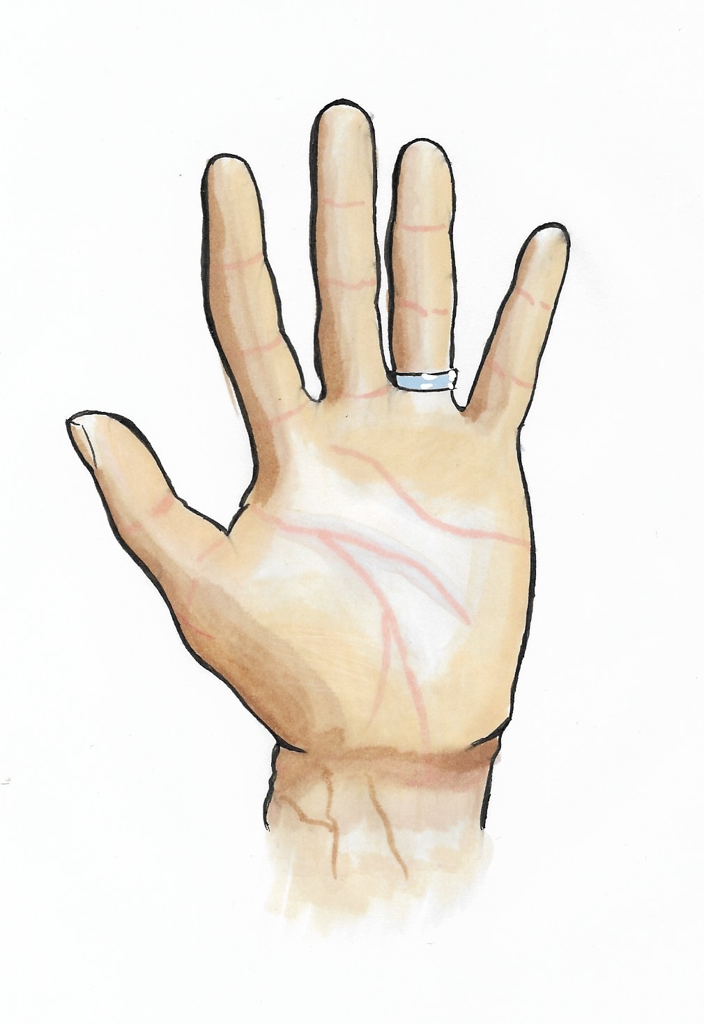 Je suis d'accord avec toutes vos remarques, et toutes les lacunes que vous faites remarquer sont dues à un manque de maîtrise. Tout ça est une découverte pour moi, j'ai fait ma main en doutant de ma capacité à la mettre en couleur et en valeur, la chair humaine est plus difficile à exprimer que la peau de la tomate, il y a plein de nuances que je voyais et que j'étais incapable de reproduire. J'ai besoin de temps pour vraiment maîtriser ces satanés feutres, ce ne sont pas des outils dociles, enfin je trouve. Même l'alliance, je l'ai coloriée au flanc, j'ai mis du bleu clair et une touche de blanc parce que je n'ai pas la moindre idée de la façon dont on imite l'argent ! Je n'ai pas non plus réussi à reproduire les cals un peu orangés et blancs de ma main... bref, vous dites vrai, vous savez des choses que je ne sais pas, et je vais réfléchir à vos remarques, ça prendra du temps pour que je les assimile. Je suis tout de même satisfait de mes gros traits noirs de silhouette, c'est très important pour moi de me construire un style, quelque chose de chaleureux, largement autant que la perfection technique qui pour moi n'est qu'un moyen au service du style et de l'expression, et pas une fin. Ah oui, ma main était un peu tordue par moments quand je la dessinais, je bougeais, bref, c'était vivant... merci beaucoup en tout cas, merci pour la photo annotée, je ferai une autre étude prochainement.