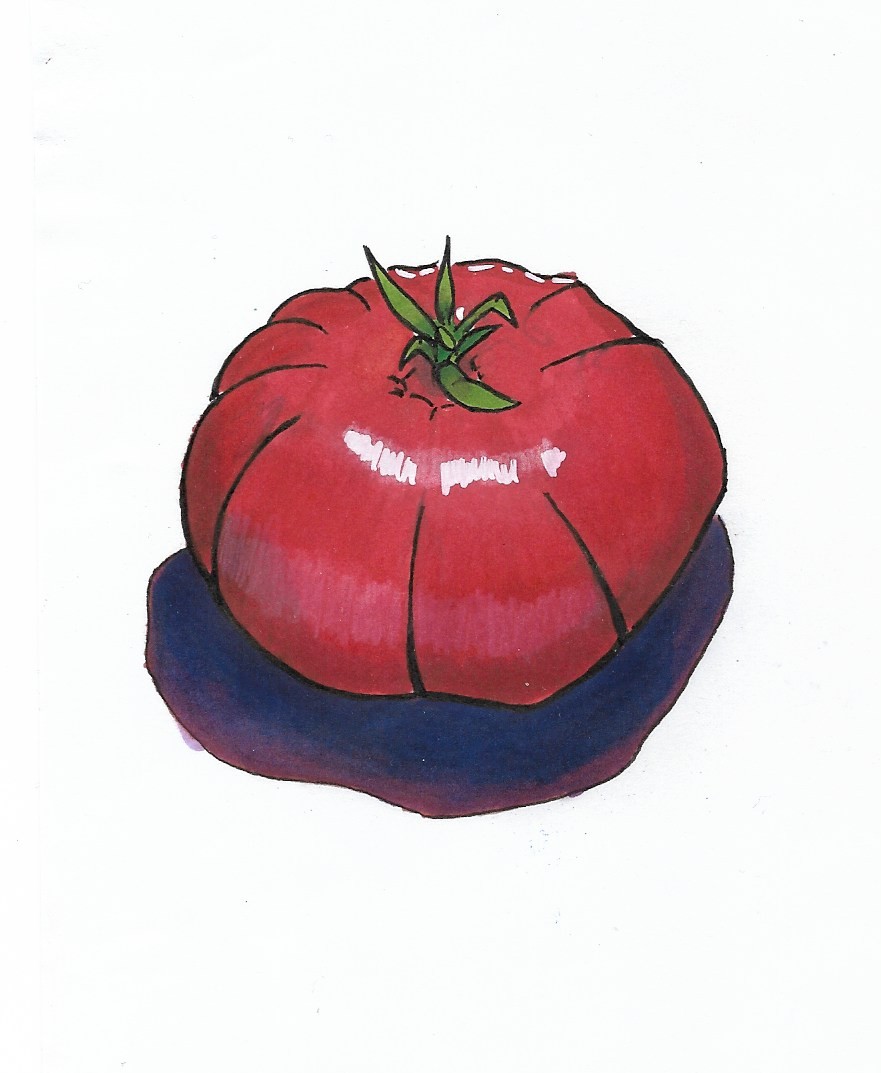 Suite à une discussion sur les feutres, j'ai retravaillé cette technique difficile de mise en couleur. J'ai pris une tomate (forme simple) je l'ai posée sur une feuille blanche, et je me suis fermement décidé à la dessiner en couleur, après avoir visionné quelques vidéos sur l'utilisation des feutres. J'ai d'abord fait une étude de valeur, j'ai ensuite encré la silhouette avec des fine liners en décalquant mon dessin, et j'ai mis en couleur avec des promarkers, sans savoir vraiment ce que ça allait donner. Voila déjà l'étude de valeur, faite au crayon hb, b, et 2b, c'est pas parfait, mais c'est mieux que ce que je faisais avant.