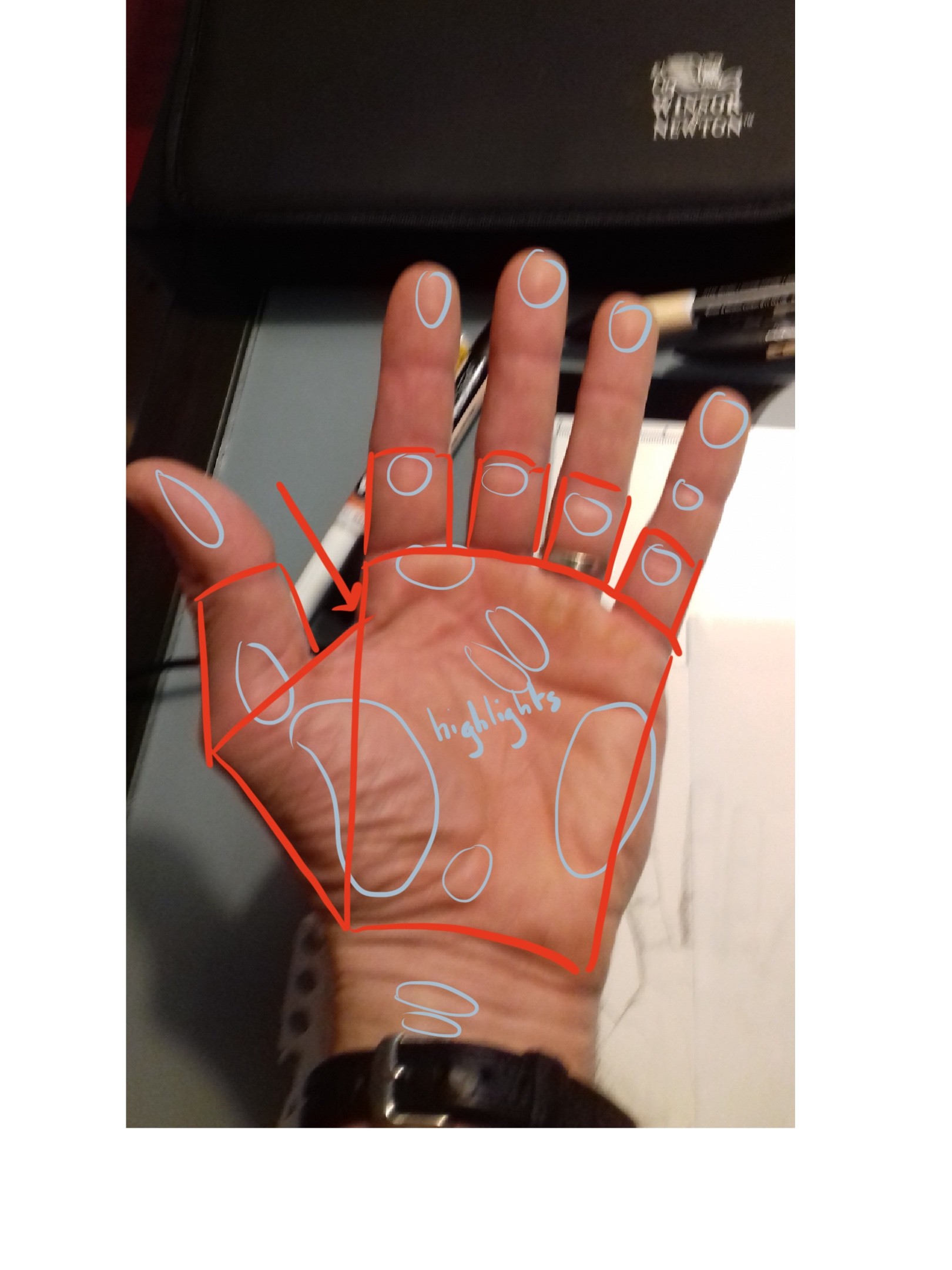 J’ai annoté ta photo en montrant les différents reflet et la structure générale de la main, si ça peut t’aider !