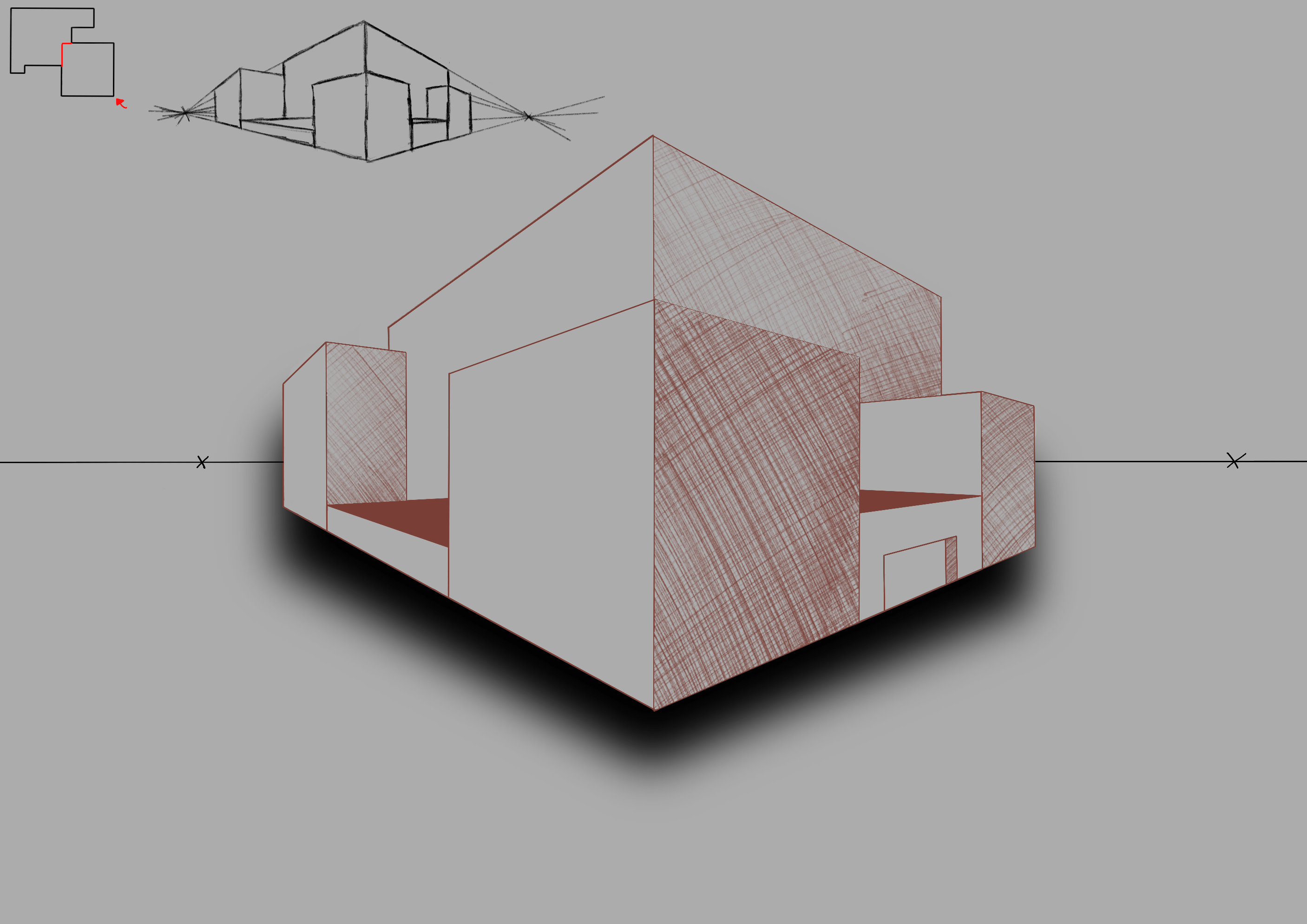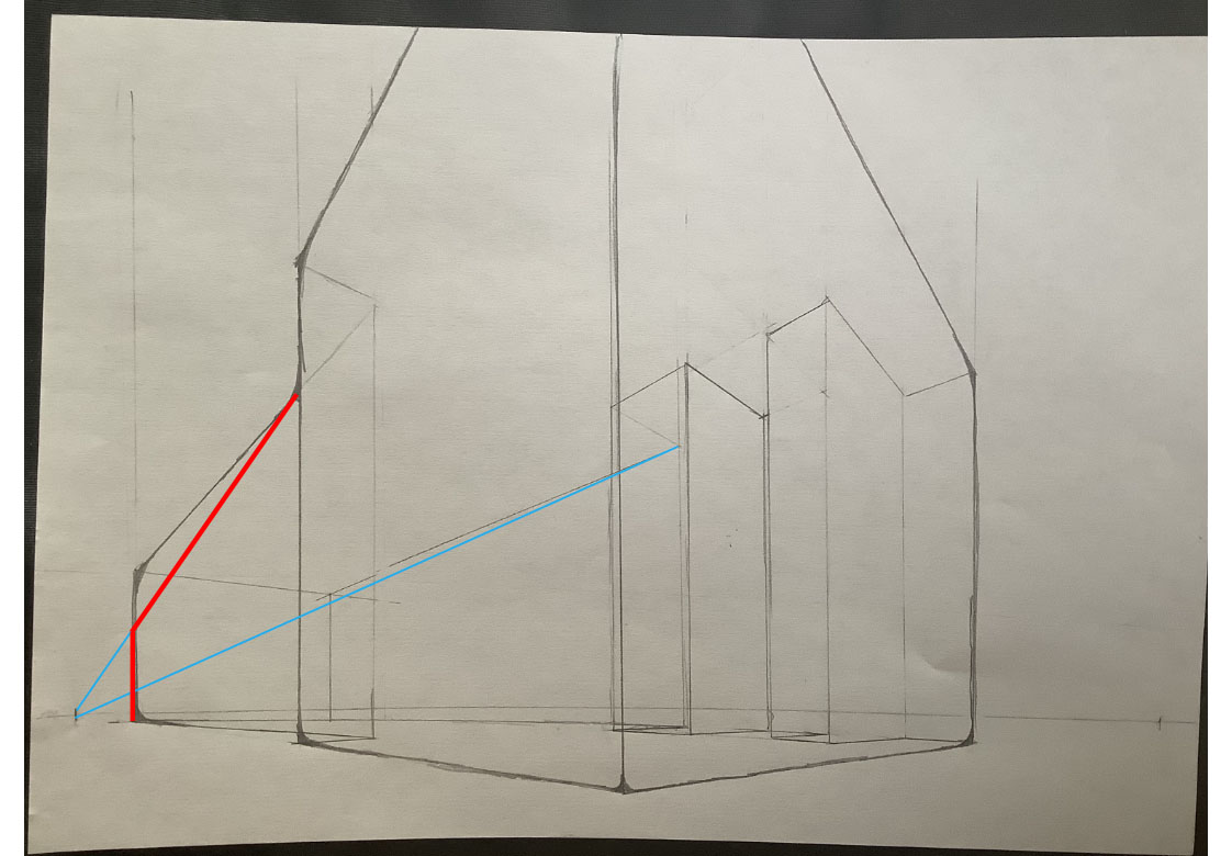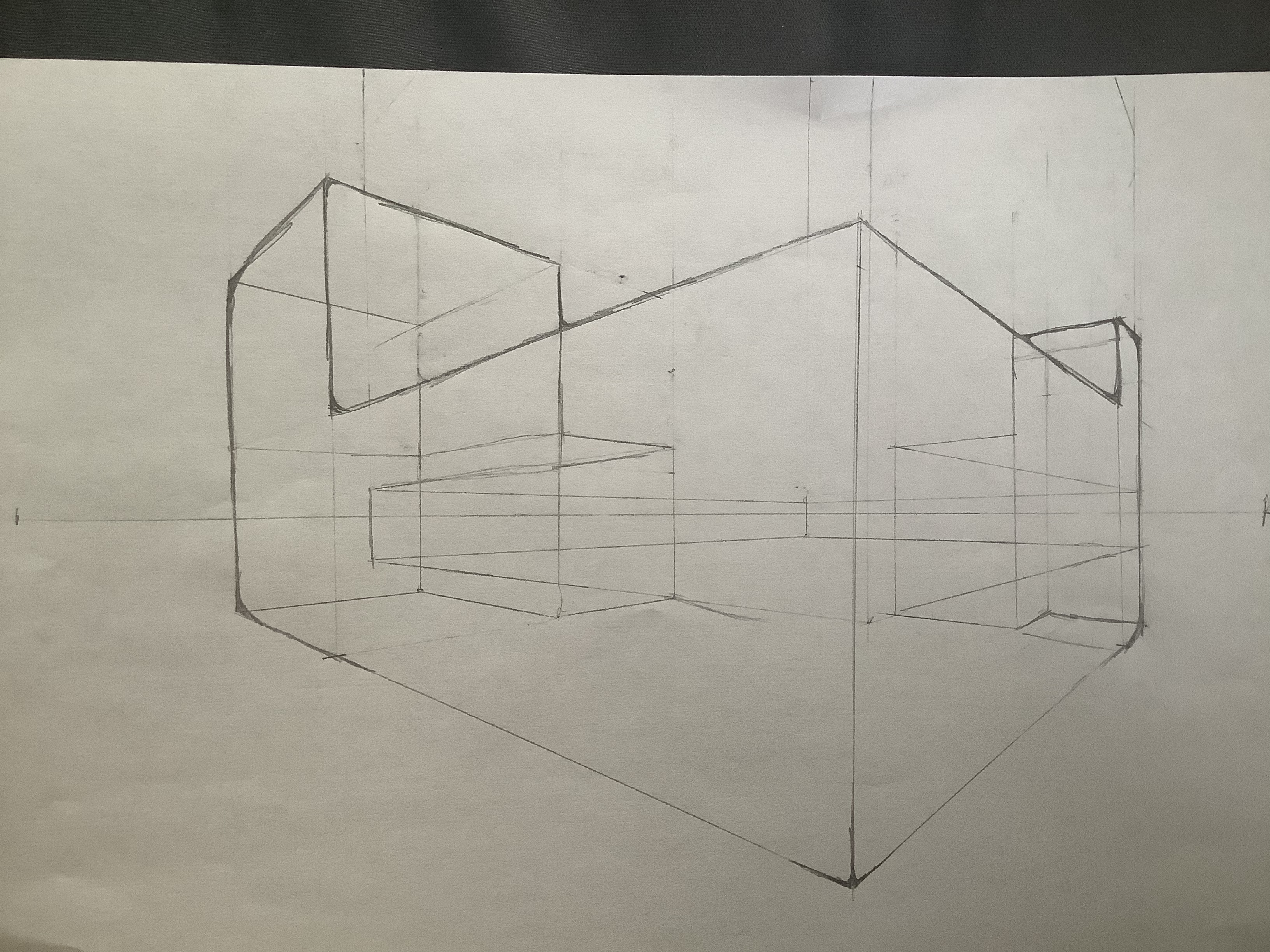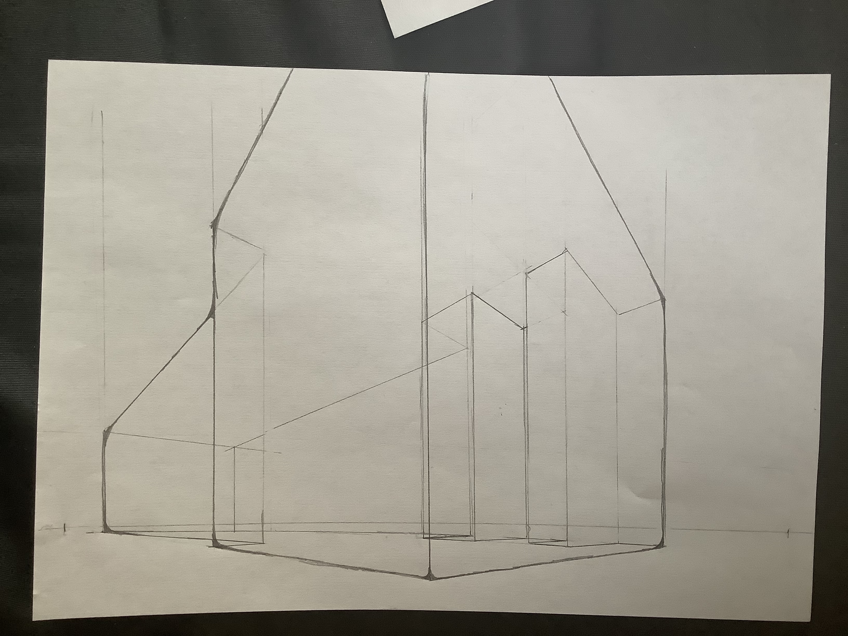 Bonjour Prysm, Effectivement ta forme est bien dans ta perspective, mais ne respecte pas le modèle et surtout la hauteur varie alors que c'est un seul et même volume! Place d'abord la forme en perspective, puis mets-y une hauteur pour créer le volume :)