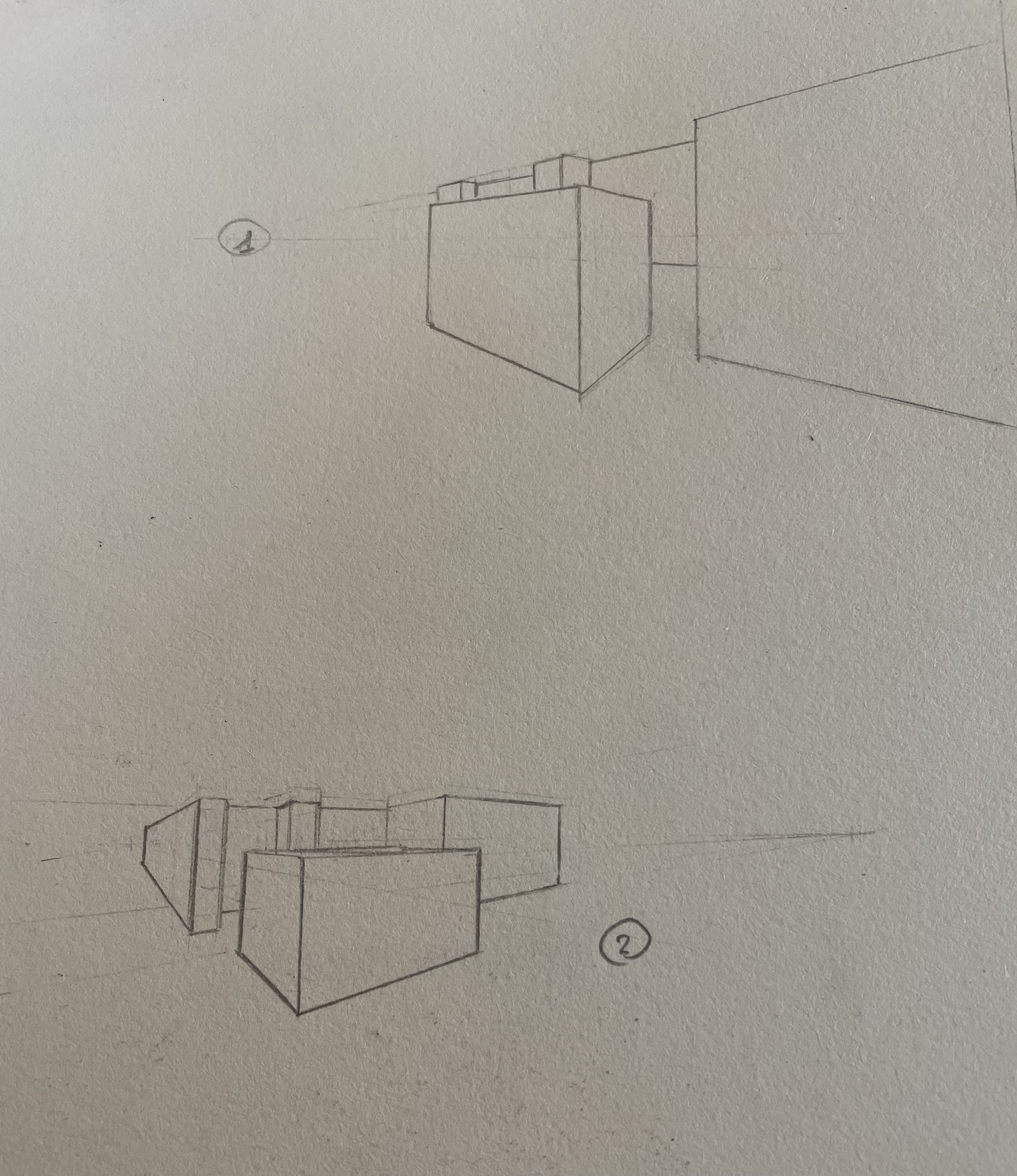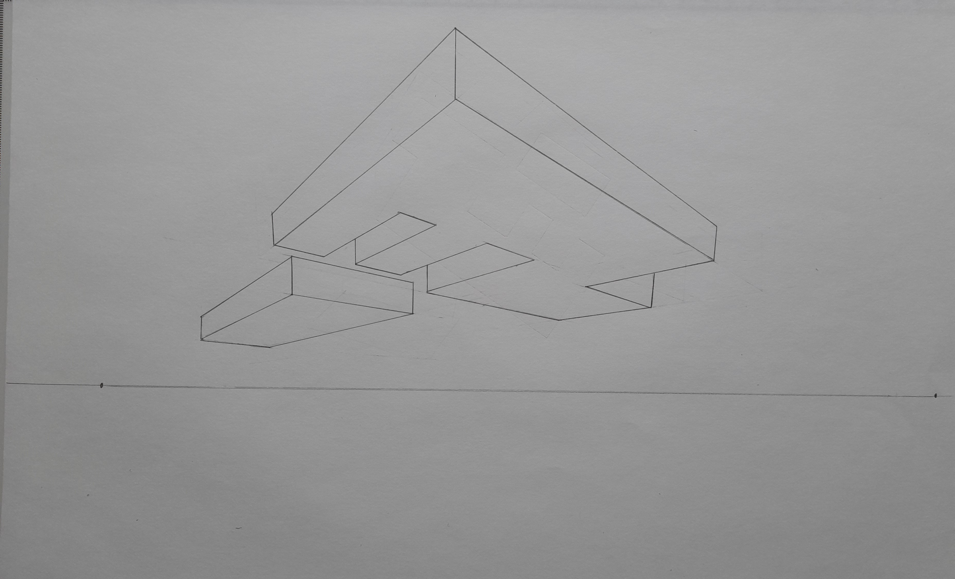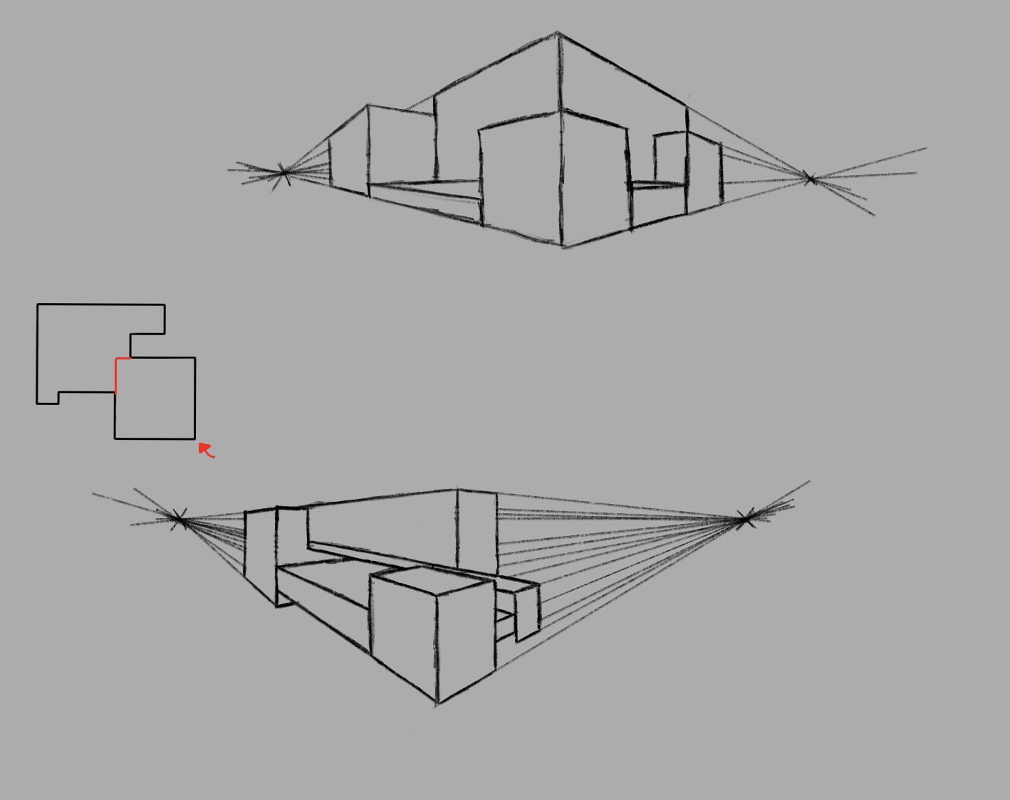 Bonjour Prysm, Effectivement ta forme est bien dans ta perspective, mais ne respecte pas le modèle et surtout la hauteur varie alors que c'est un seul et même volume! Place d'abord la forme en perspective, puis mets-y une hauteur pour créer le volume :)