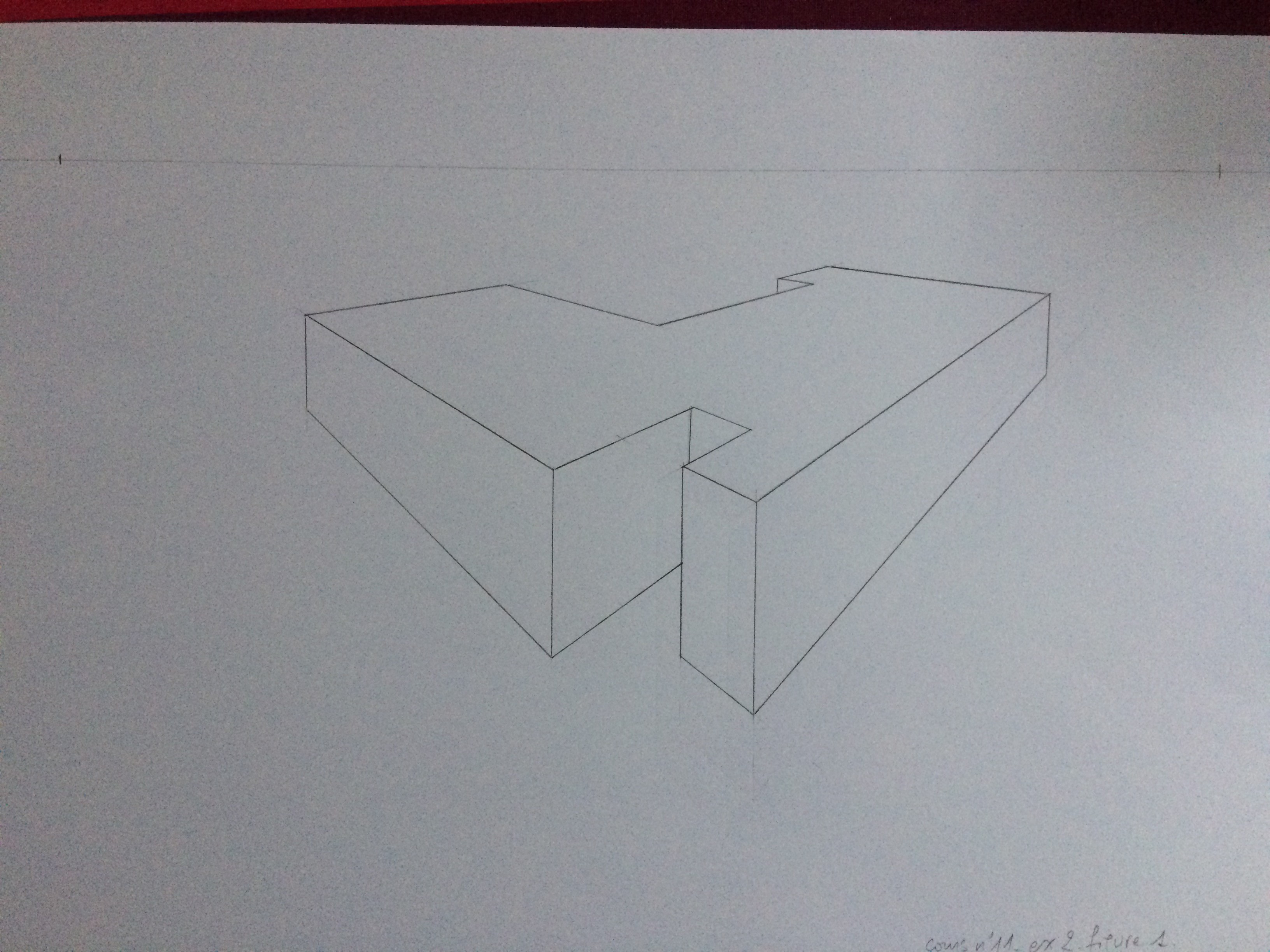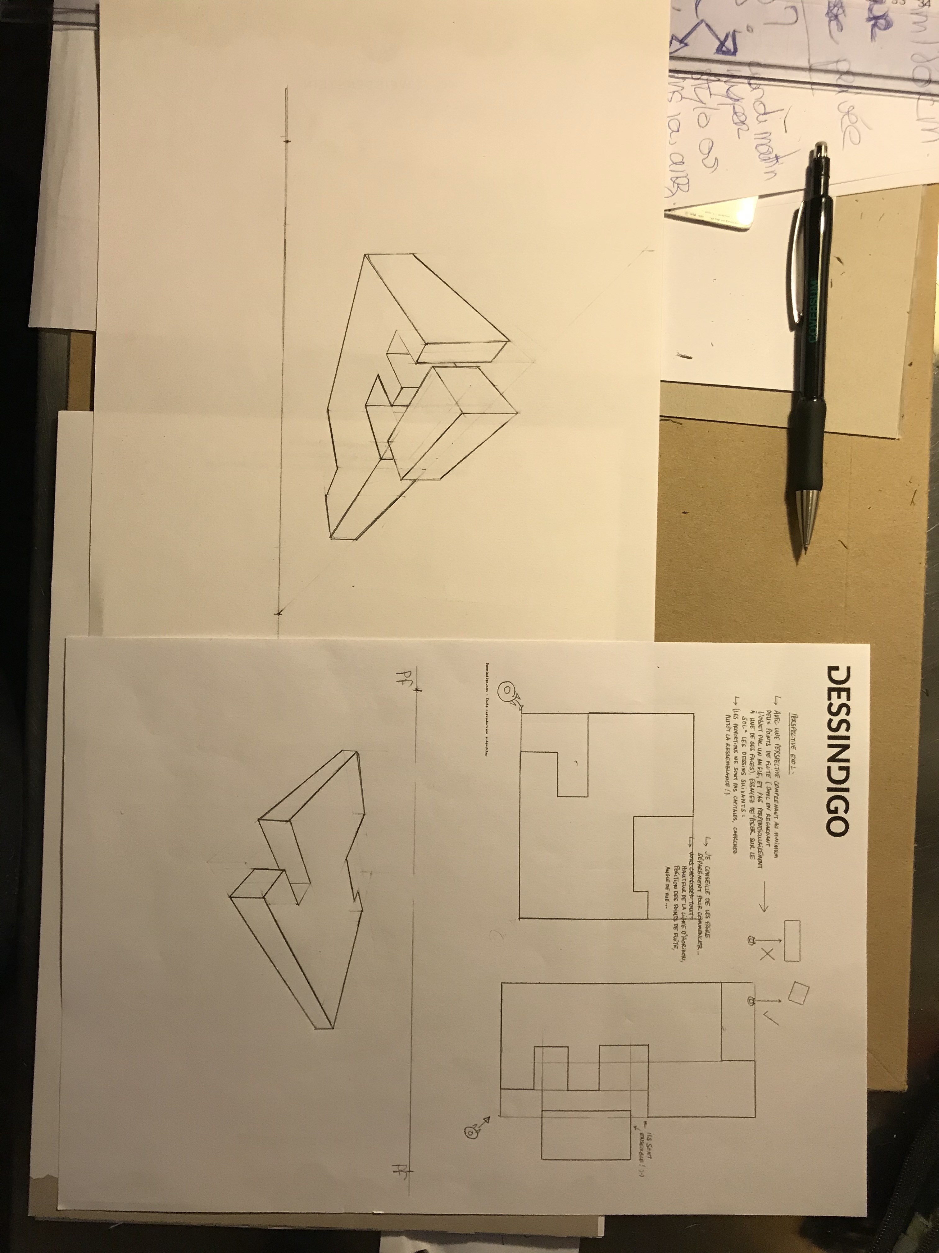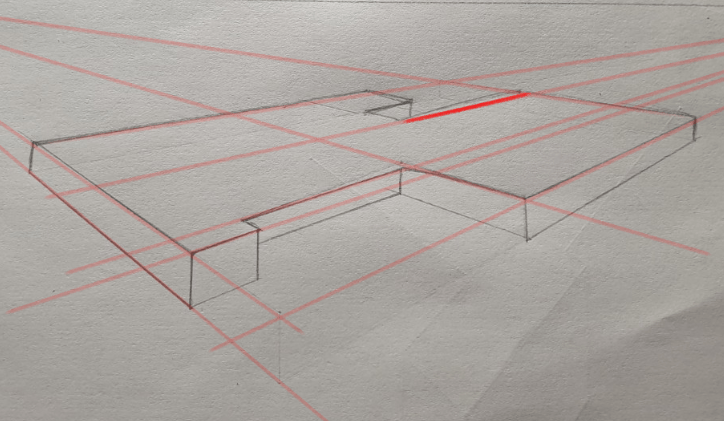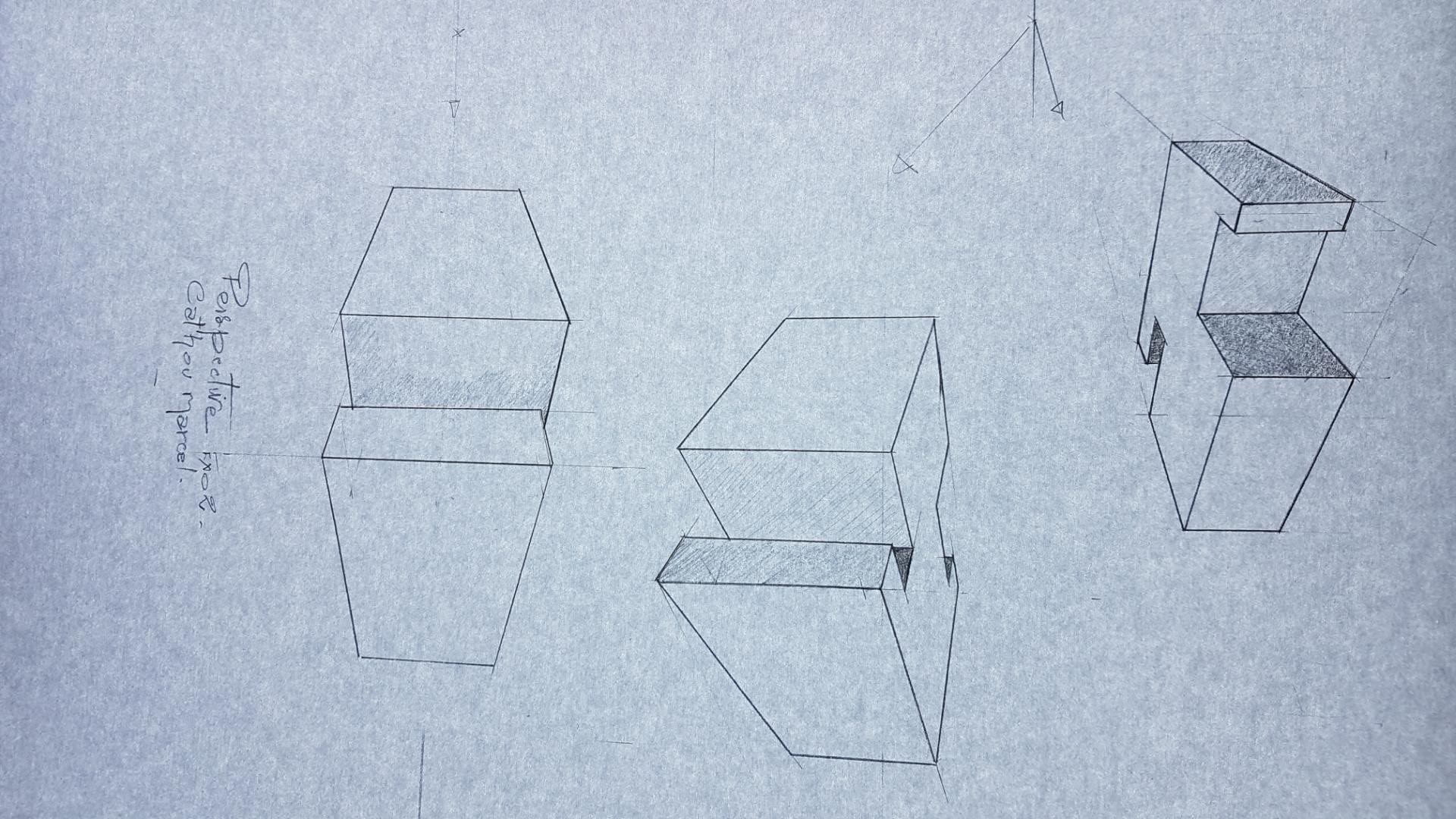 Pour la forme de droite, le point de fuite de droite sort de la feuille pour eviter trop de déformations.