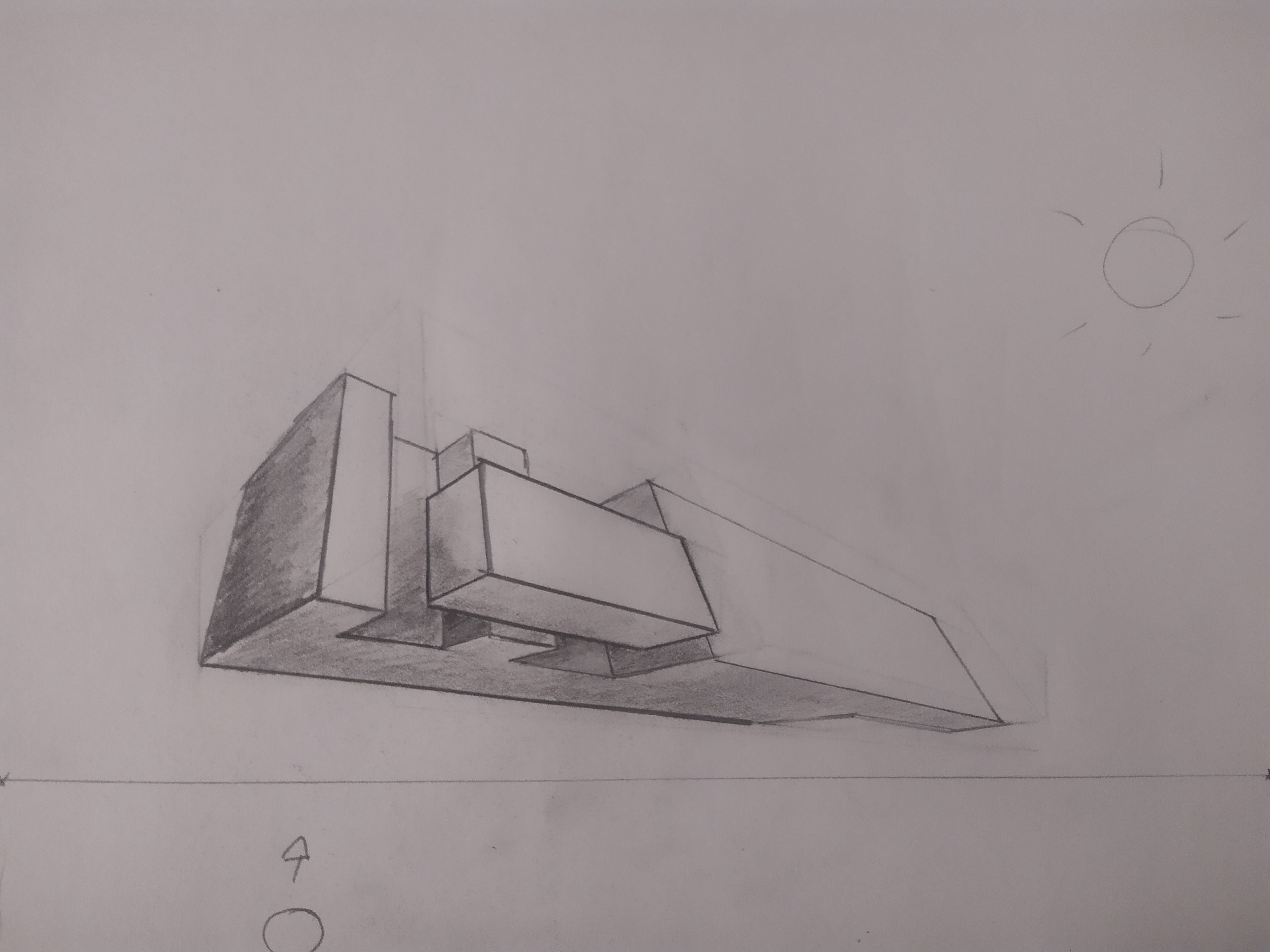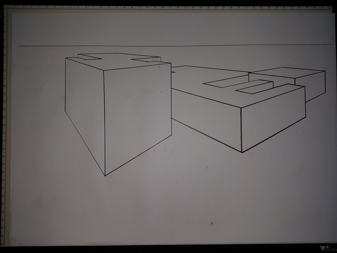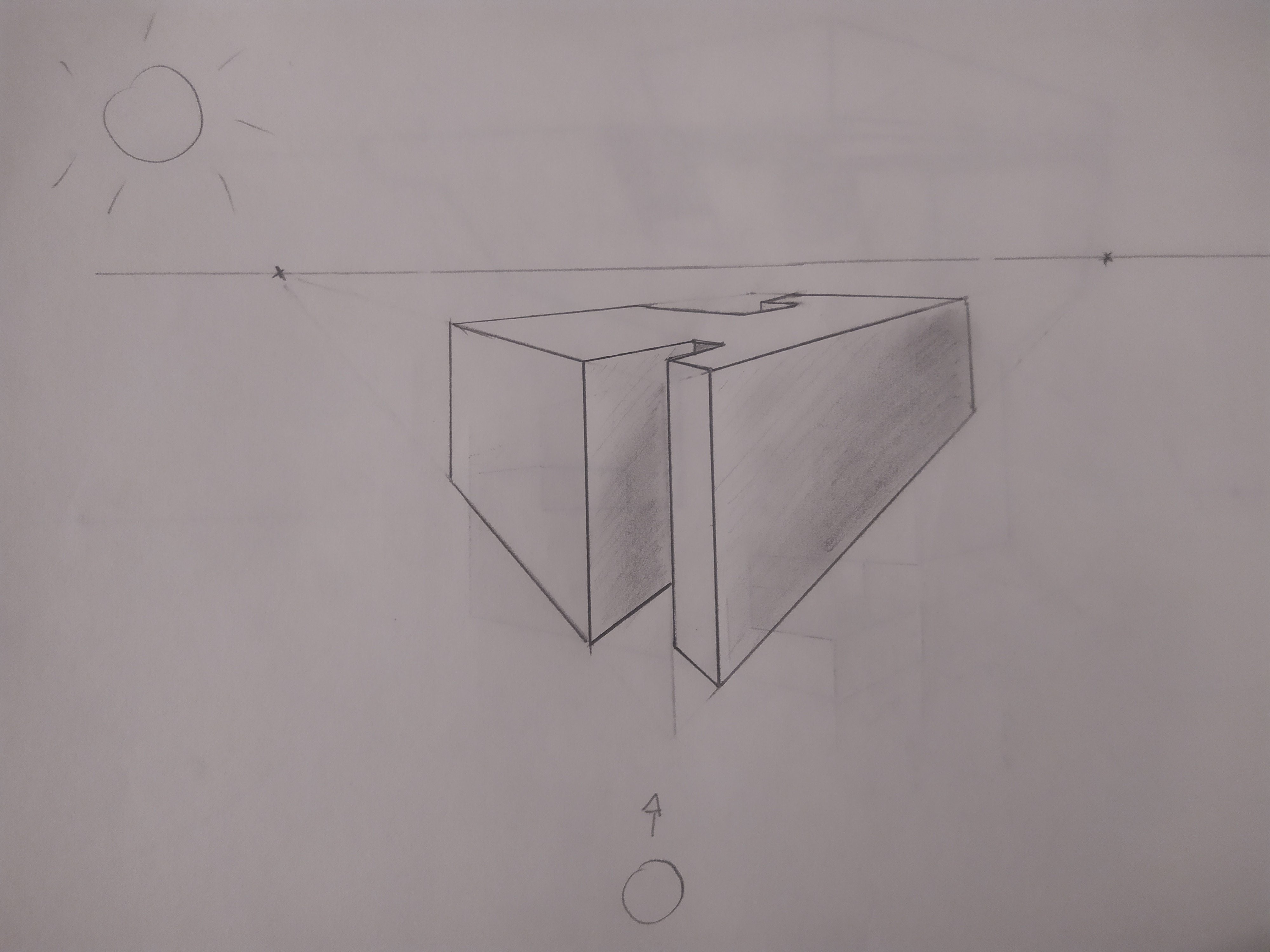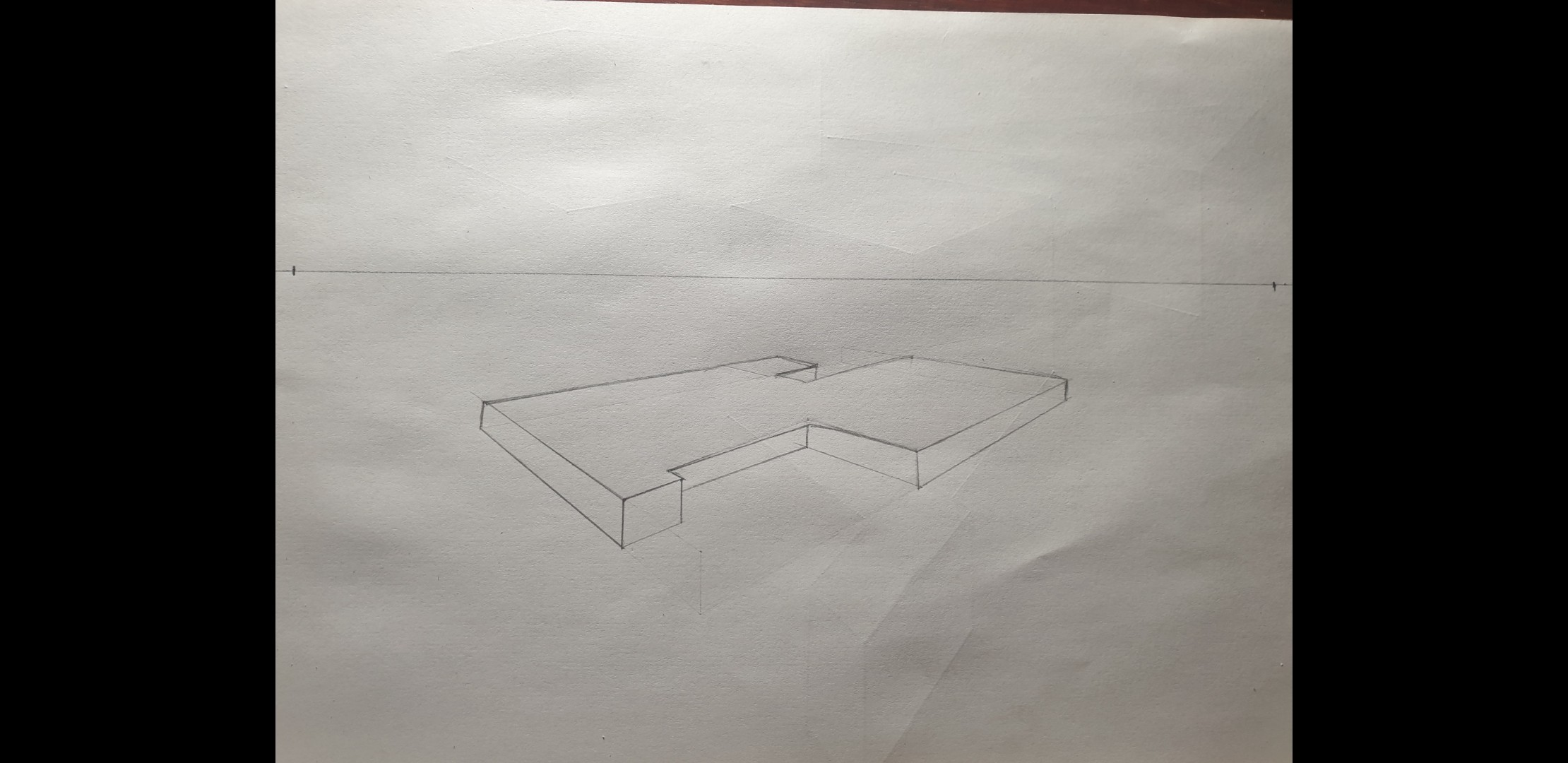 Pour la forme de droite, le point de fuite de droite sort de la feuille pour eviter trop de déformations.