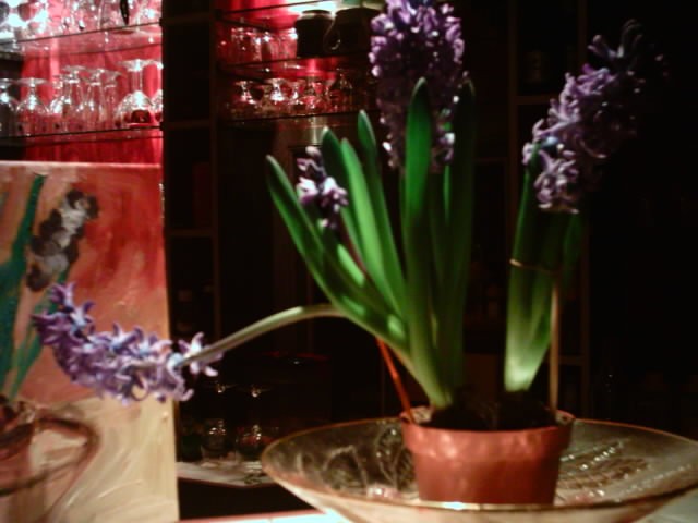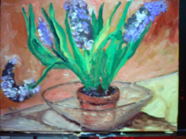 NB.: Je vous ai collé des Jacynthes... C'est moi qui les ai peint. D'après nature. (Je voulais vous coller aussi l'original, dont j'ai gardé la photographie, mais je ne peux pas mettre deux images. Pas grave.) Bon, je sais, mon travail est très maladroit. C'est juste pour vous donner une idée du chemin qu'il me reste à parcourir voyez. Et puis c'est aussi pour vous les offrir. En guise de remerciement. Parce que je me sens encouragée. Déjà. Sincèrement vôtre monsieur.