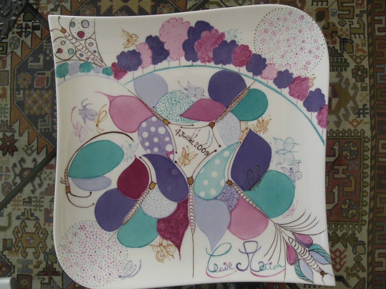 Cf votre cours 1/critique : j’ose l’envoi d’une Photo d’une de mes réalisations peinte sur plat creux de porcelaine et cuite à 880 degrés dans mon four.