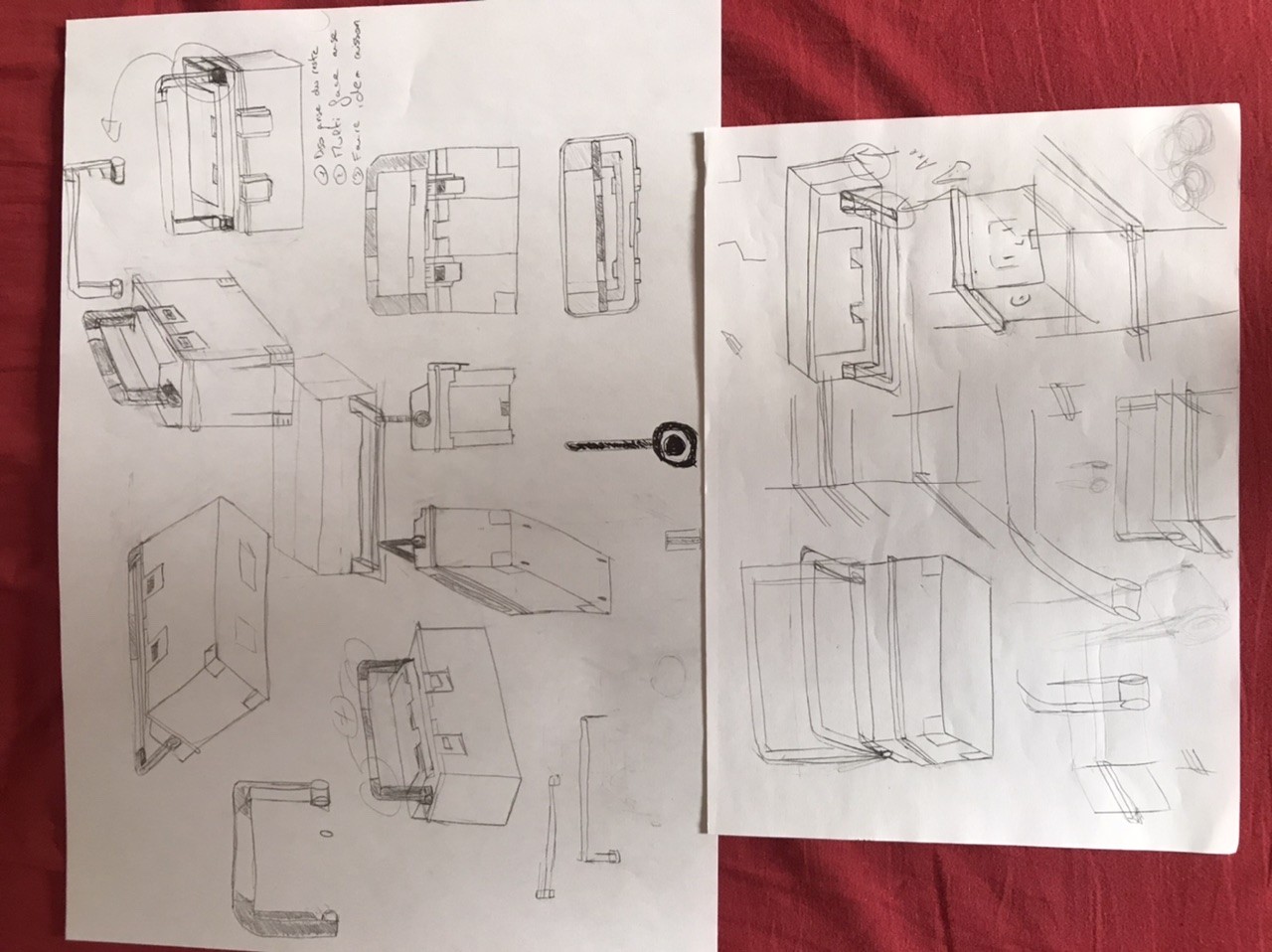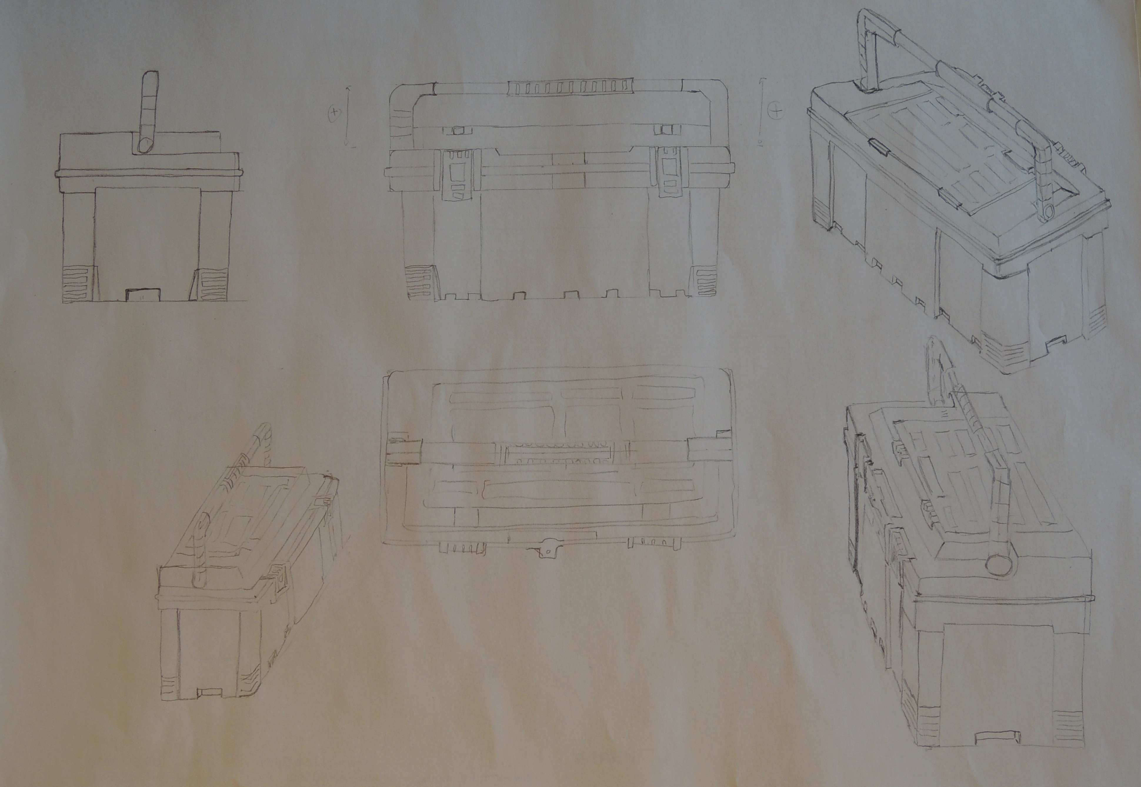 Mais si tu veux un conseil pour mieux gérer la profondeur et la mise en perspective des objets : prends du temps au départ, quand tu traces ton rectangle initial en perspective et que tu montes les hauteurs. Avant de continuer, imagine ta caisse à outils finie, et regarde si tes proportions sont bonnes. Je pense que la longueur est bonne vue tes études, mais pas la largeur. La caisse est plus fine que ça sur ta première planche, c'est ça qui a pêché.