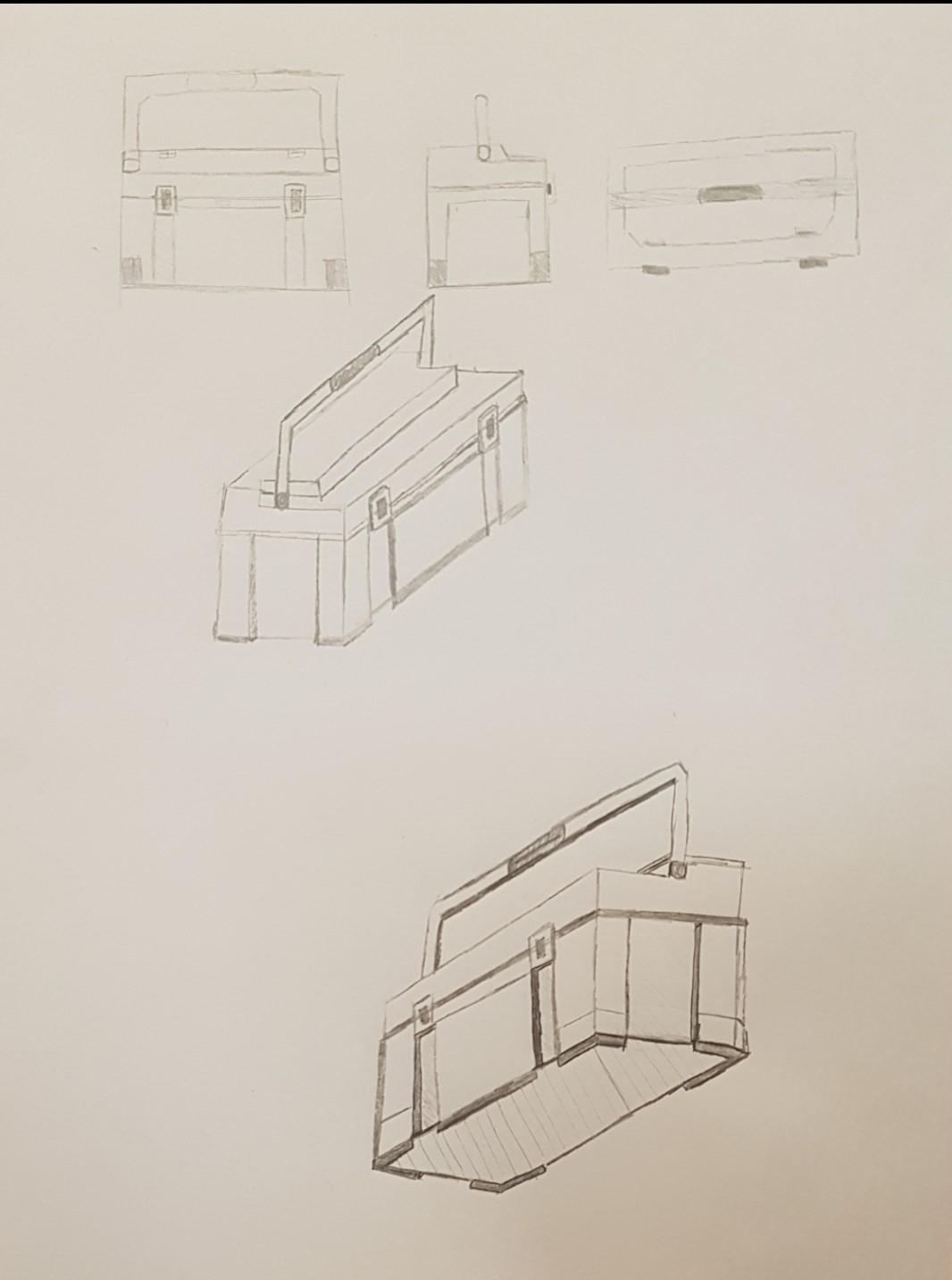 Désolée pour la réponse tardive 😞 Ton travail est plutôt bon, il y a des bons éléments, mais il faut que tu fasses bien attention aux volumes de bases! Pour ta boîte à outils de profil et de 3/4 je n'ai rien à dire, elles sont très biens, mais pour celle qu'on voit depuis le dessous et de face il faut que tu fasses attention à comment elles sont construites! Pour celle de face, le côté droit part un petit peu de travers, et c'est vraiment dommage parce que tout le reste est bien 😞 Pour celle vue d'en dessous il faut bien garder à l'esprit que c'est un parallélépipède rectangle (il faut même commencer en faisant la forme puis en ajoutant les détails!
