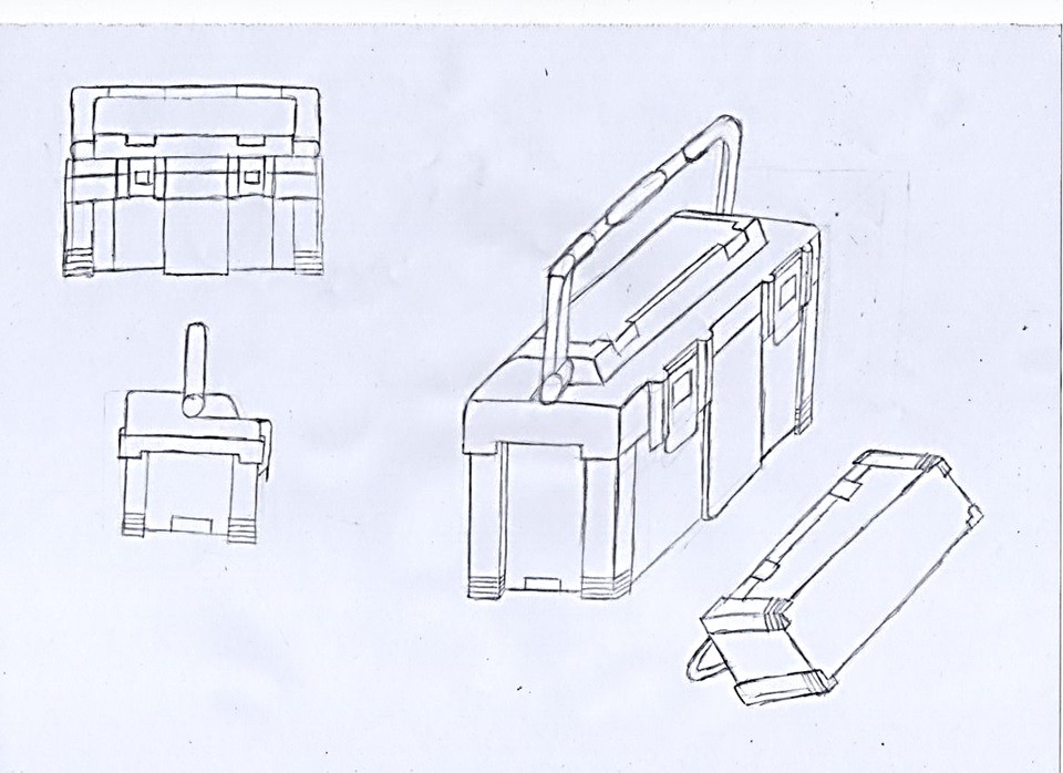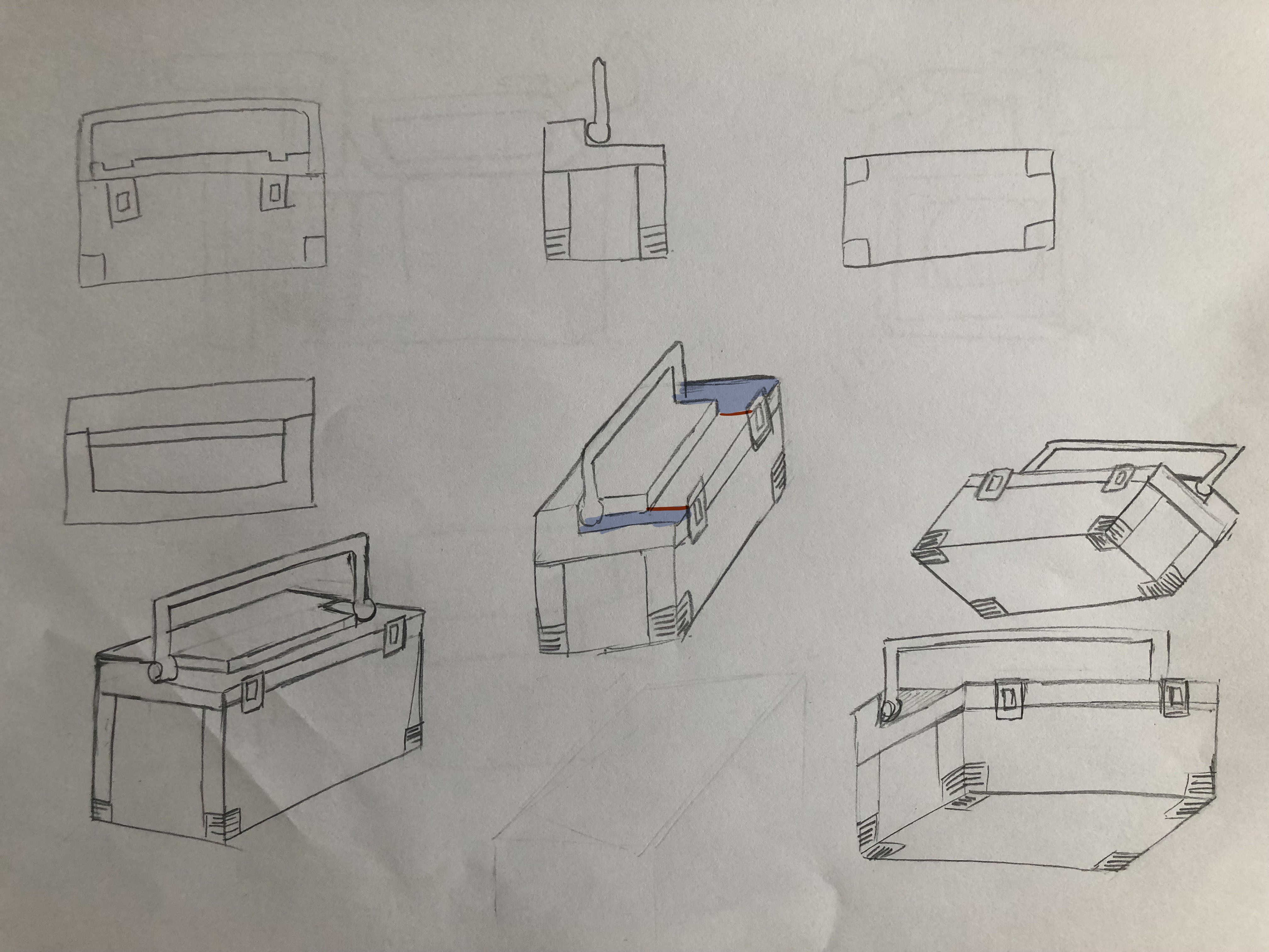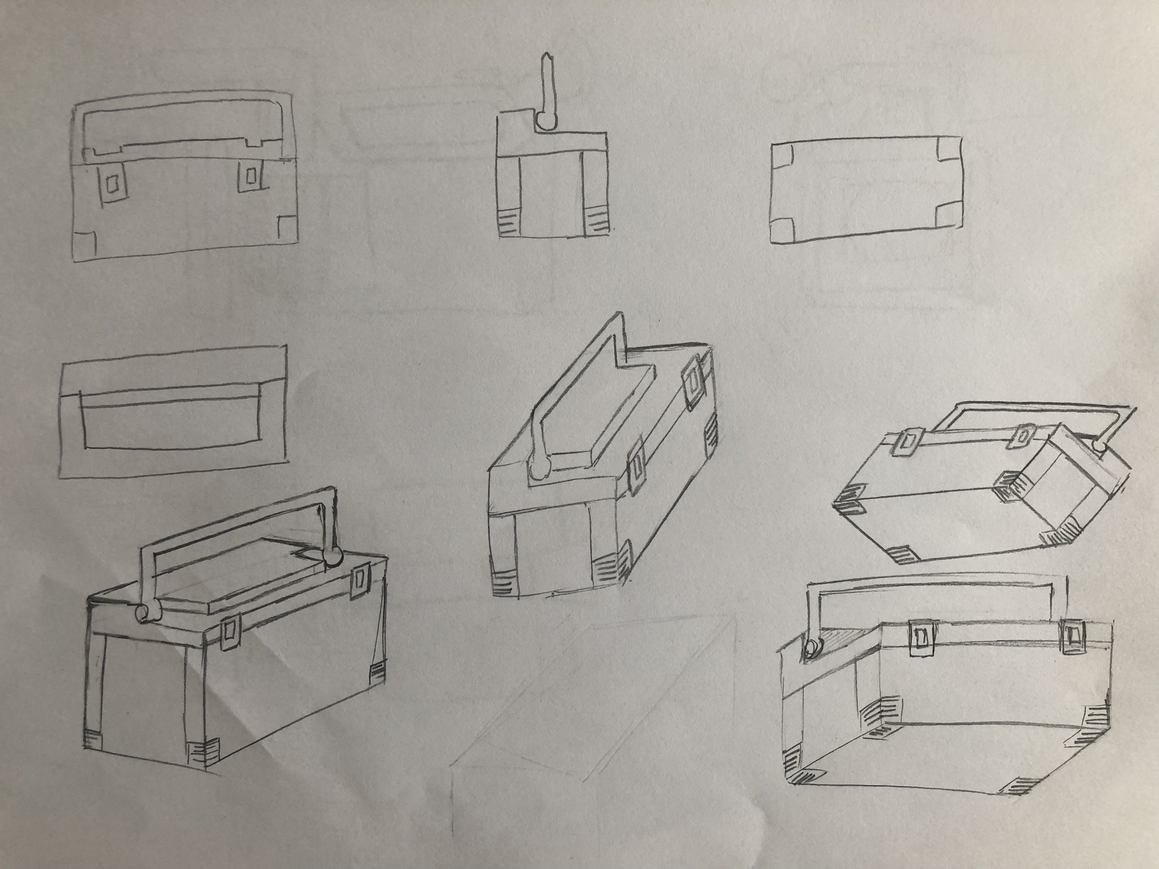 Elle est bien cette caisse à outils. Bon, ses proportions changent d'une vue à l'autre, mais on ne peut pas dire que la structure soit mauvaise. Passe peut-être davantage de temps au début pour vraiment poser tes proportions. Car comme tu as pu le constater : si les proportions ne sont pas bonnes, même avec pleins de jolis détails, ça ne fonctionne pas ^^