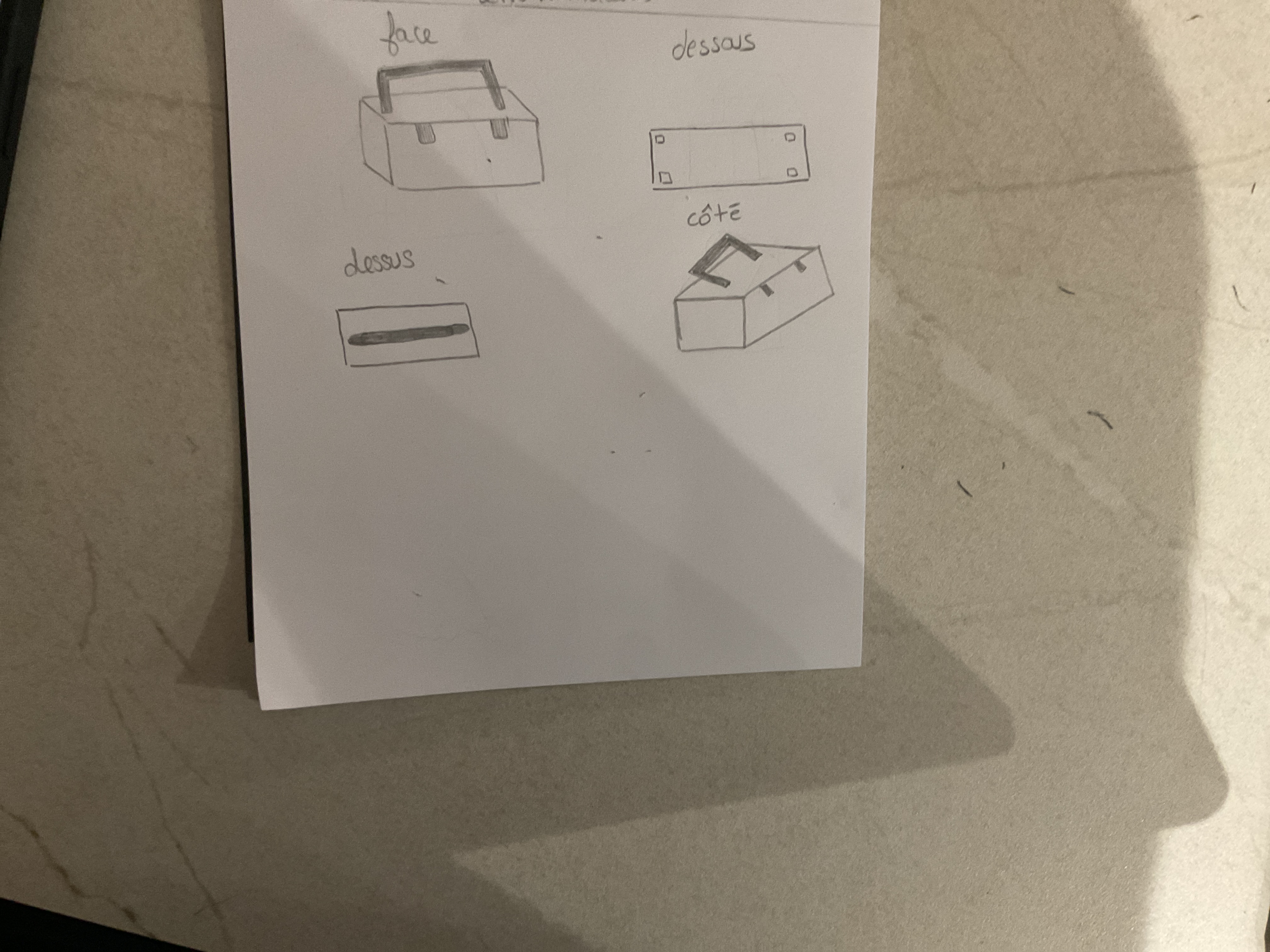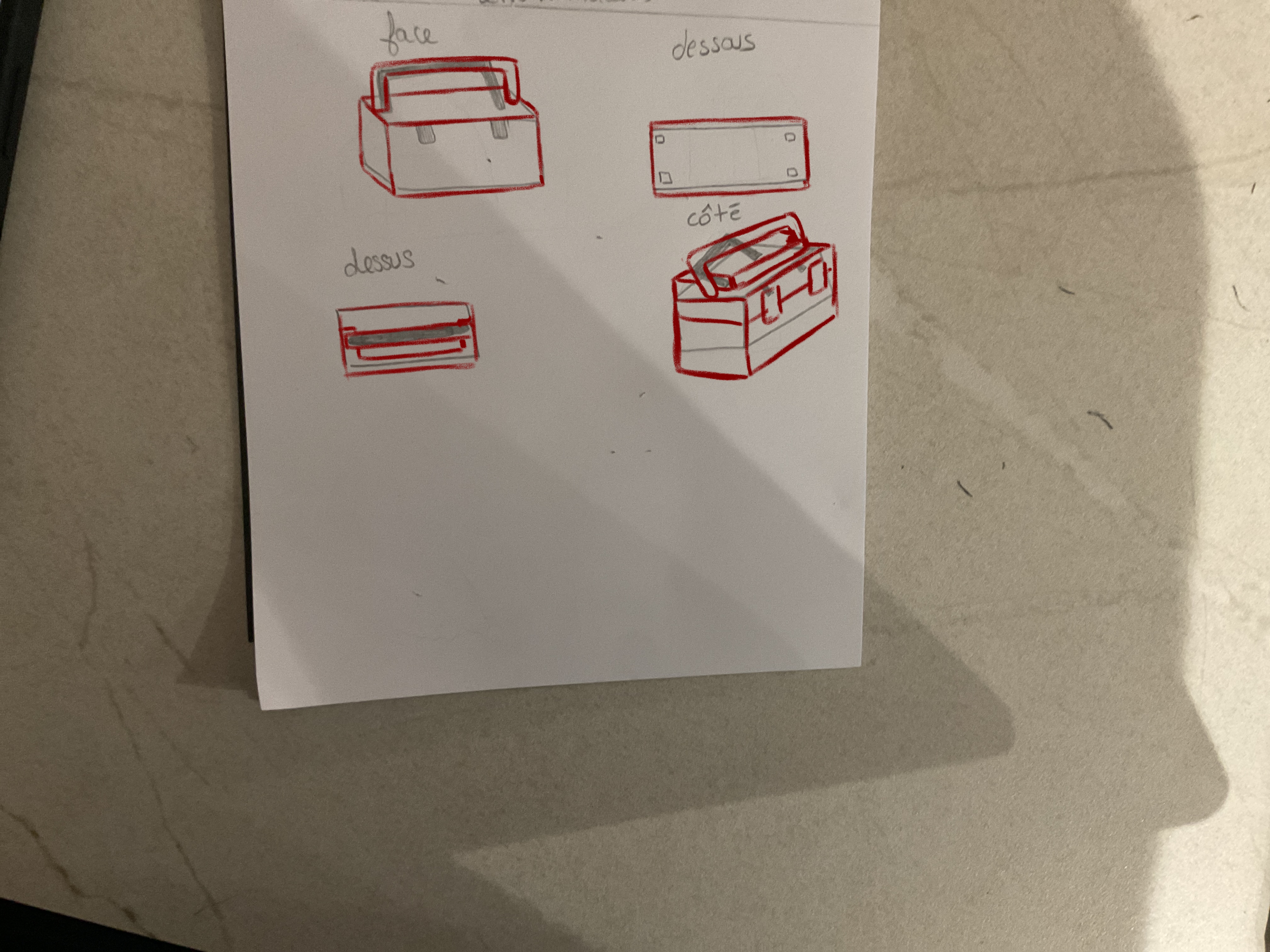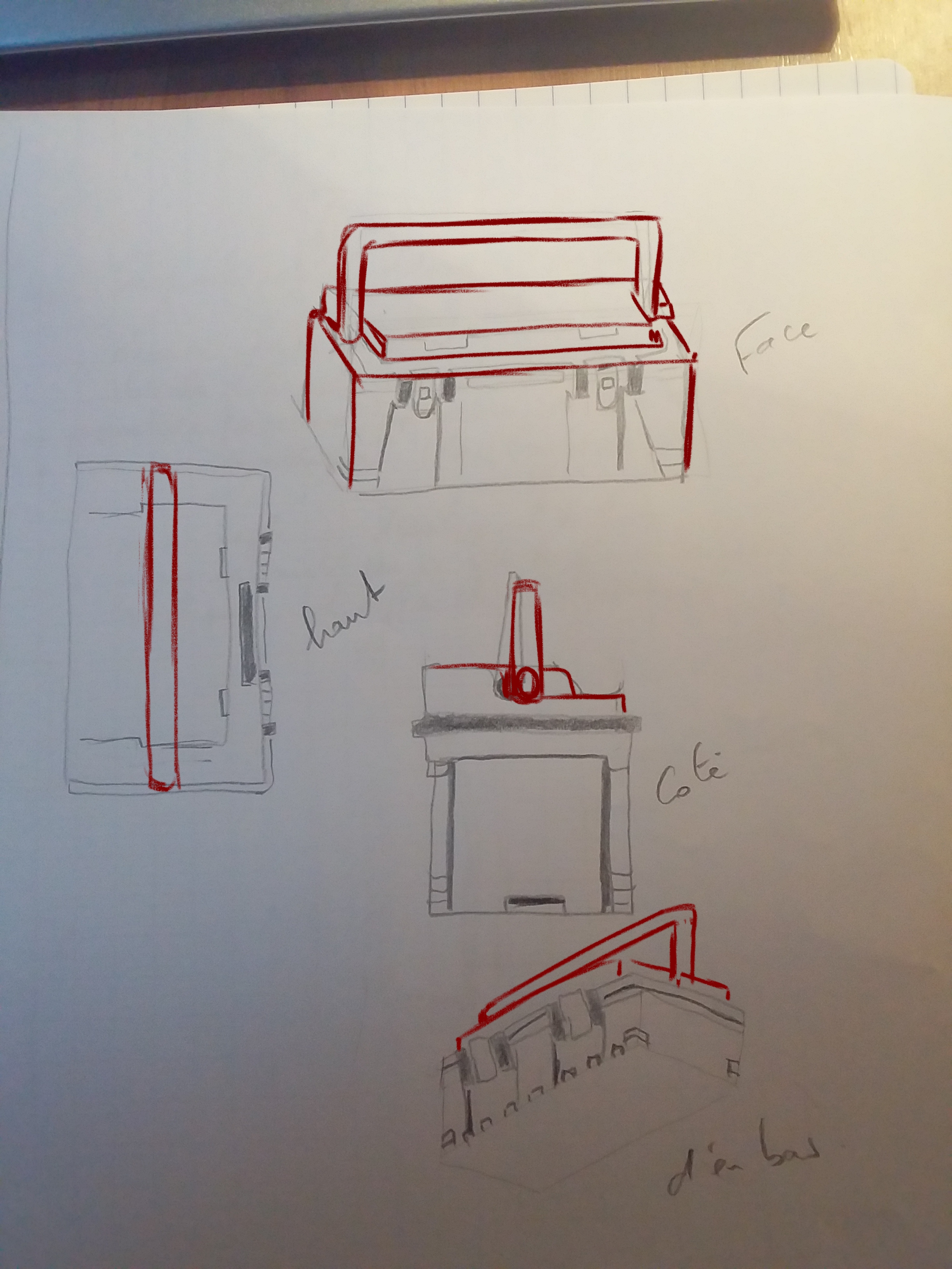 Bonjour Kellyvaes, vraiment pas mal tout ça! Attention à la poignée, sur la vue de face elle devrait être dans la prolongation des côtés ded la boîte, sur la vue de côté elle semble un peu trop petite, et sur la vue de dessus elle n'apparaît pas. Pour le reste, c'est du bon boulot!