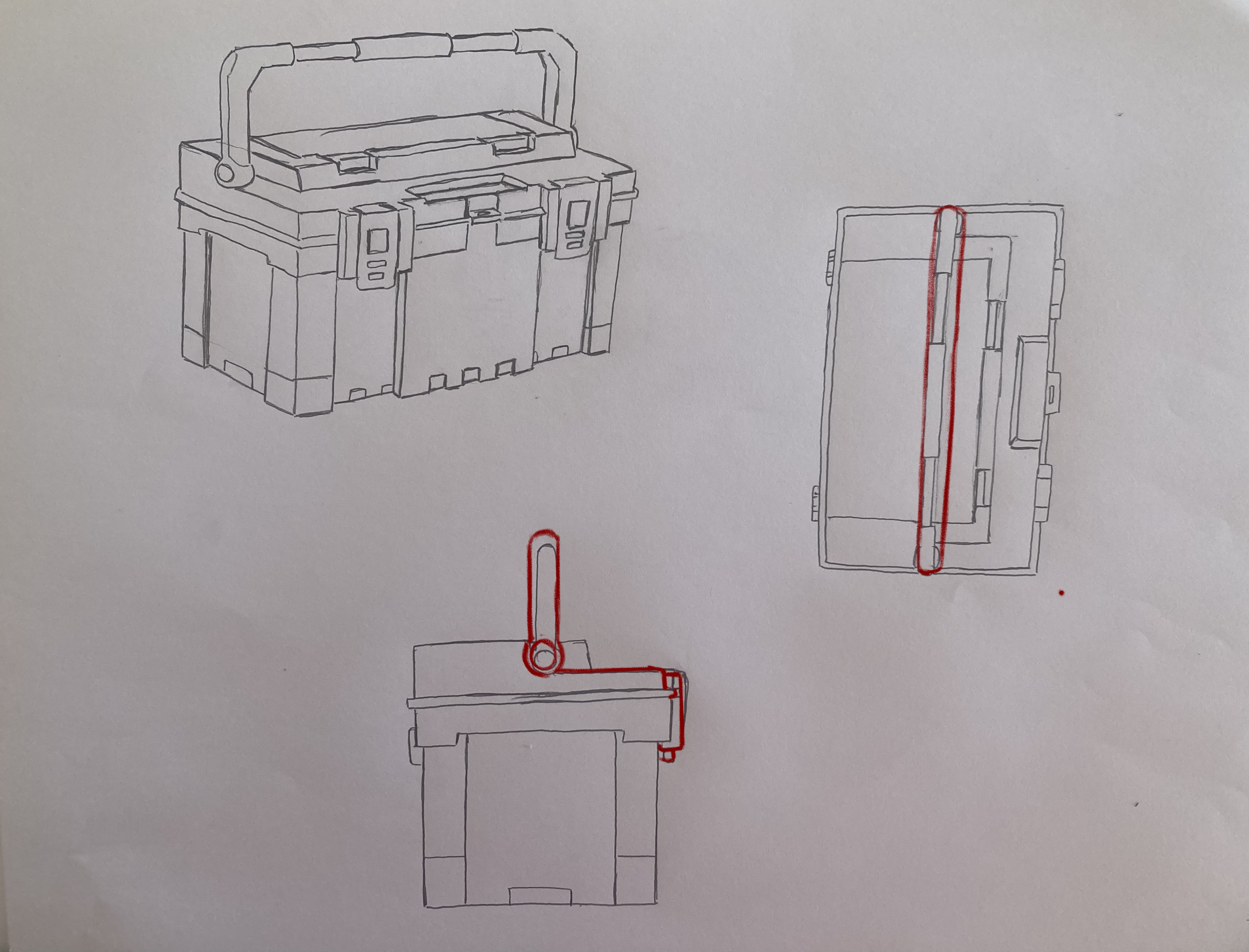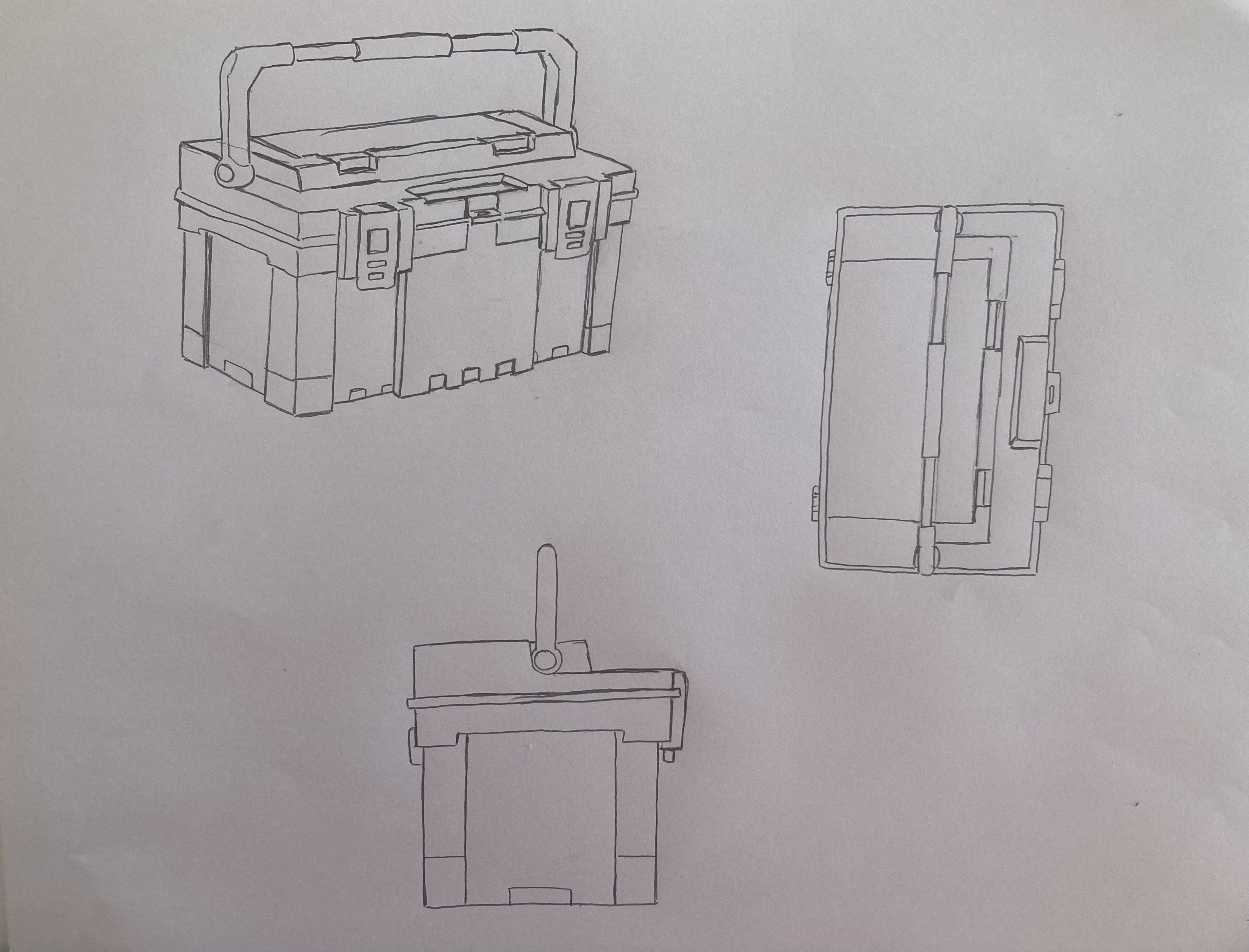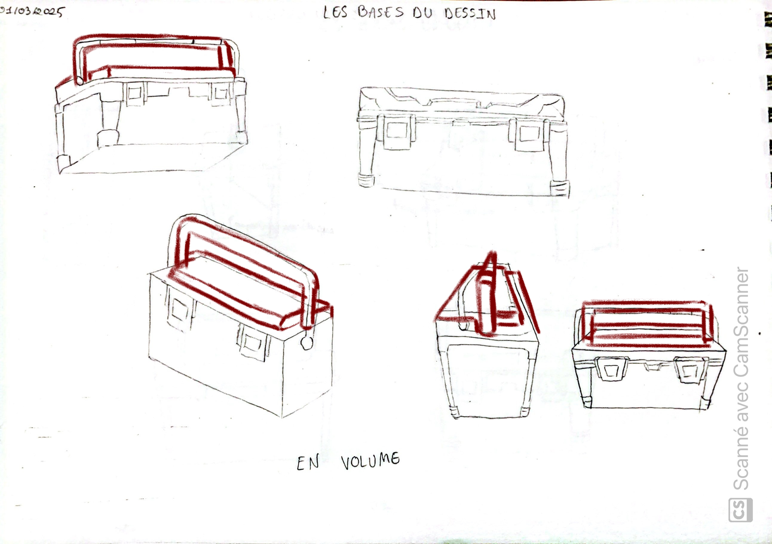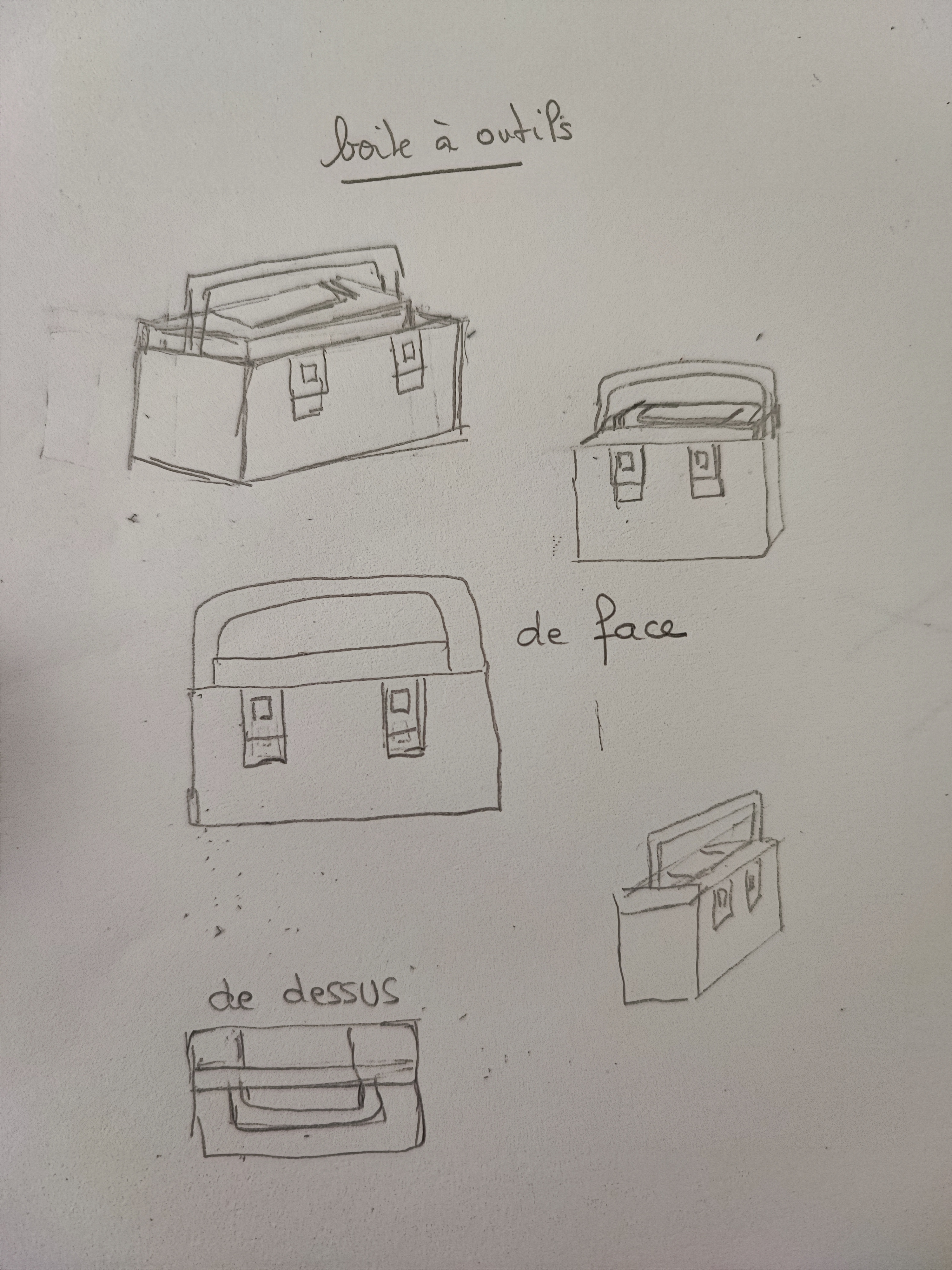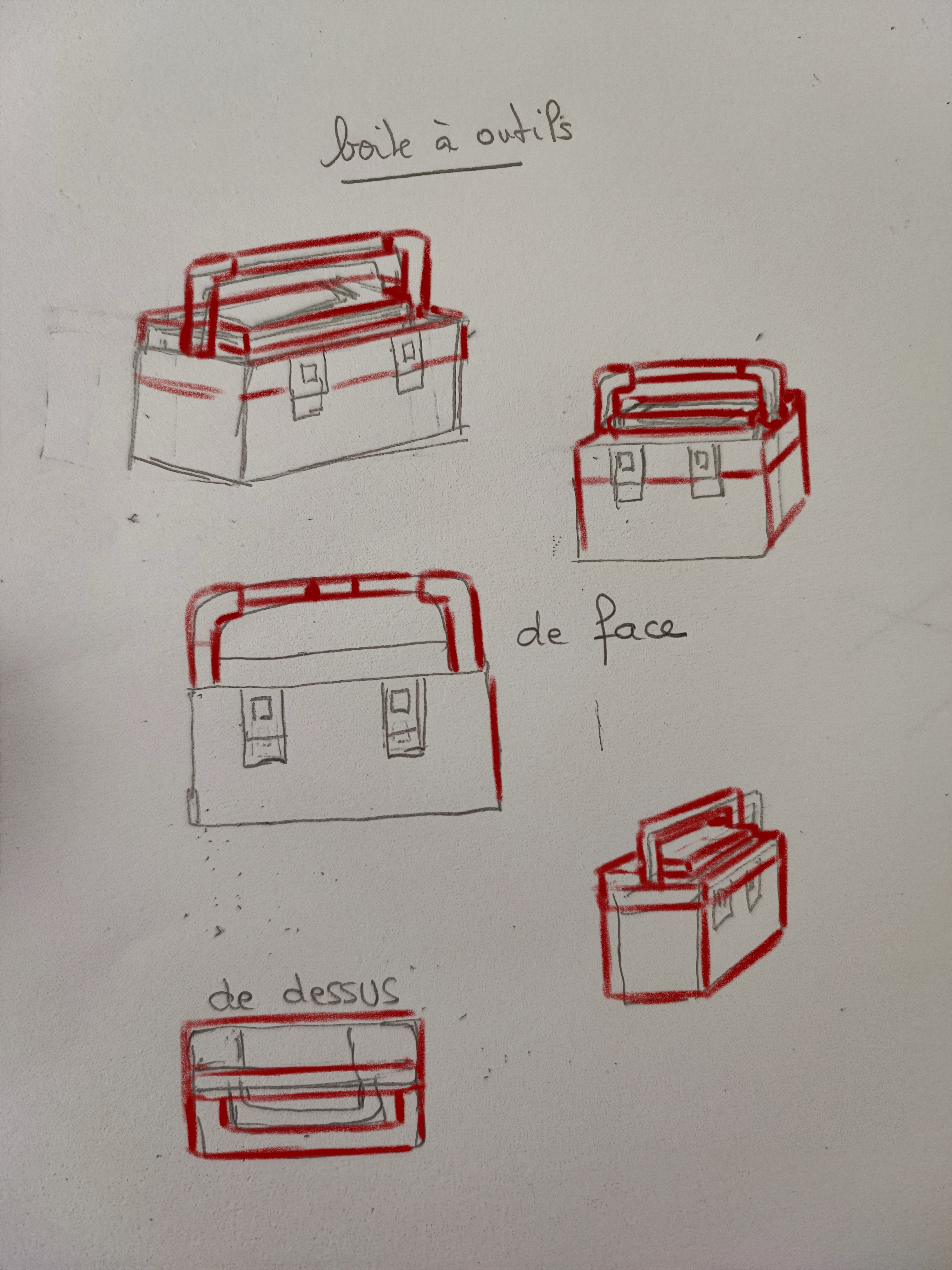 Bonjour Luludesbois, c'est bien! Tu as opté pour la simplification, c'est super! Attention néanmoins aux proportions de la caisse à outils qui selon les angles va manquer de profondeur, ou de largeur... Je pense qu'une fois que tu as fait une version aussi simplifiée, tu peux y ajouter des petits détails par touche, progressivement. Bon boulot!