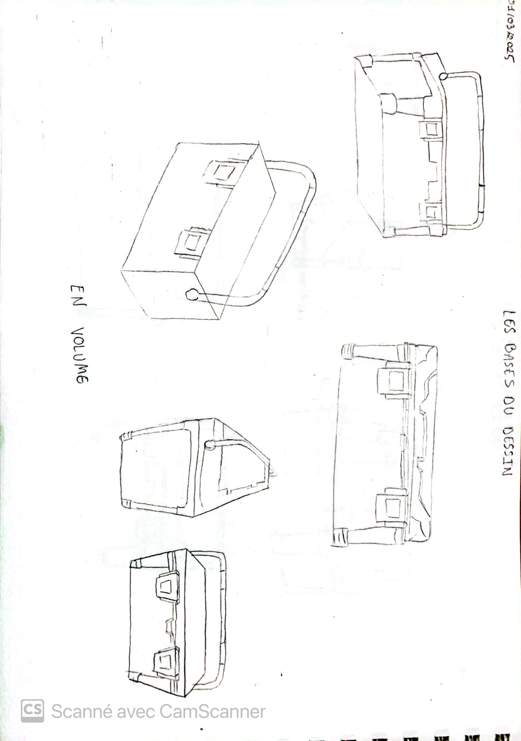 Bonjour Eudoras, c'est vraiment pas mal du tout! Il y a juste la dimension de la poignée qui est un peus grosse... Et la vue 3D de dessus où la boîte manque un peu de longueur. Attention à ta perspective sur la vue de dessous. Essaie de faire que les lignes parallèles suivent le même point de fuite. À part ça, c'est du bon boulot!