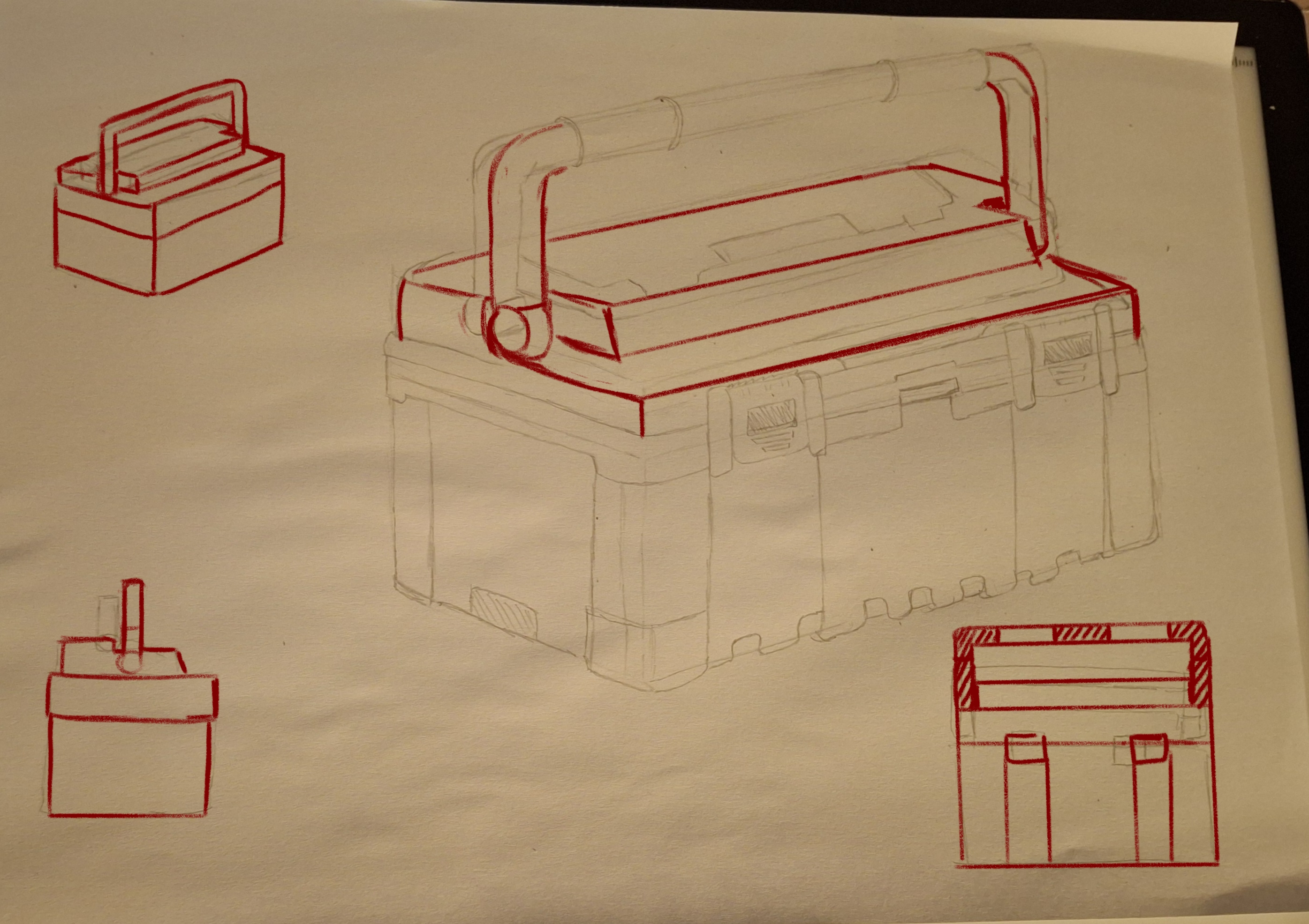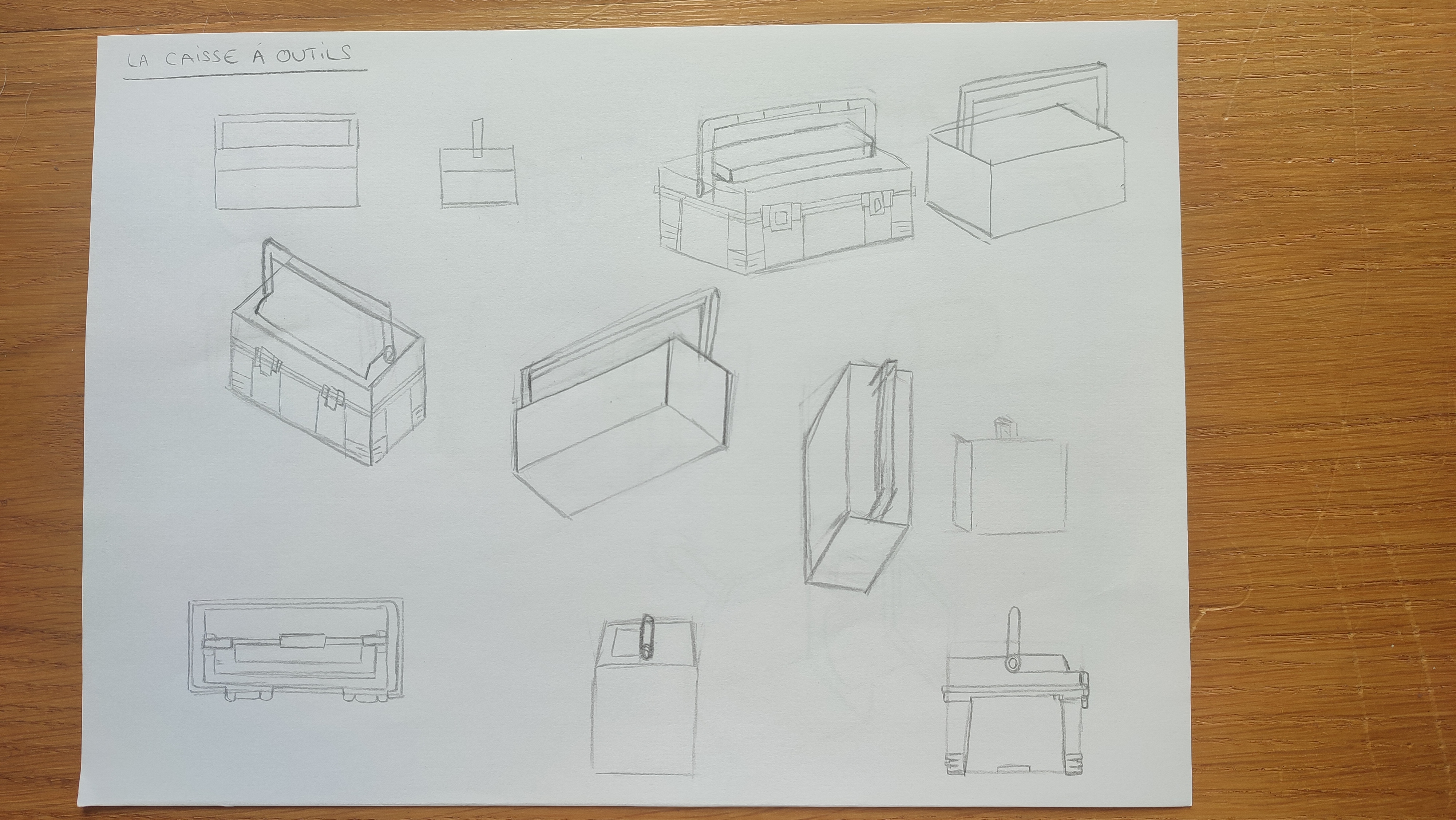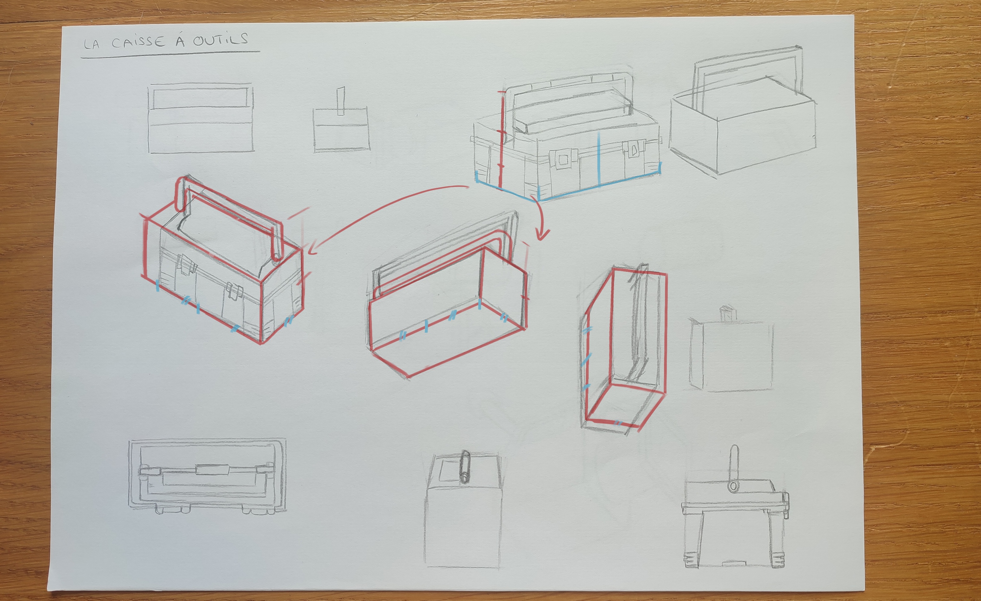 Même si tu as trouvé cet exercice un peu difficile, tu t'en es plutôt bien sorti 👍. Le principal problème qui se retrouve sur tous tes dessins, c'est que la caisse à outils paraît un peu plate. Tu peux effectivement utiliser du papier à carreaux si tu préfères, mais je te conseille de continuer avec une feuille blanche. C'est certes challengeant, mais c'est aussi le meilleur moyen d'apprendre, car pour ce genre de dessin d'analyse, il ne s'agit pas de reproduire une copie parfaitement réaliste, mais plutôt d'entraîner ton œil et ta main. Si tu prends l'habitude de t'appuyer sur une sorte de béquille, il te sera peut-être plus difficile de t'en détacher par la suite. Continue sur cette lancée et tu verras rapidement des progrès :)