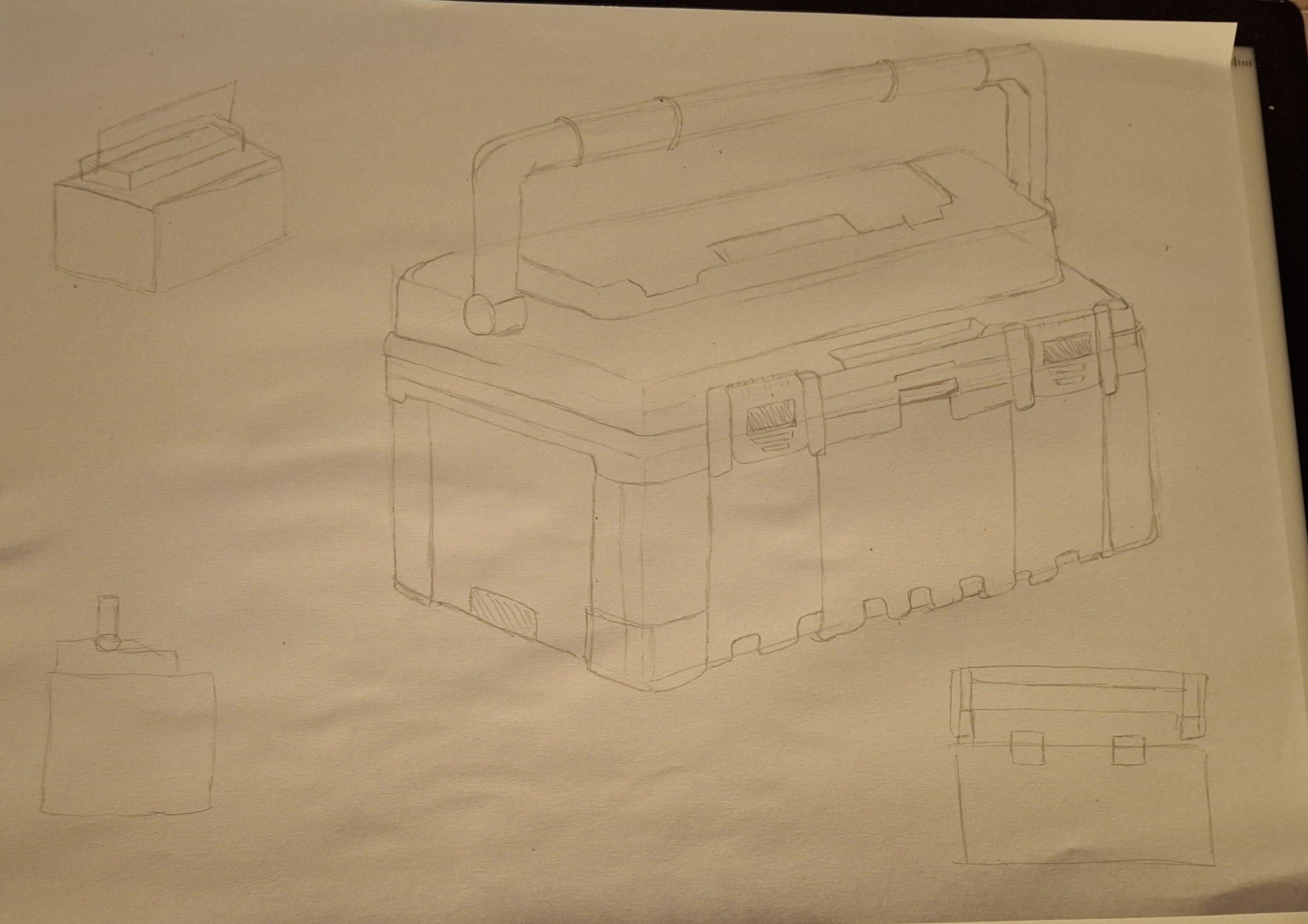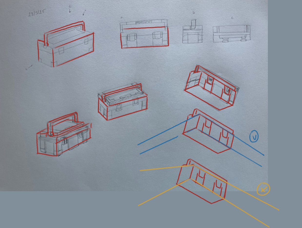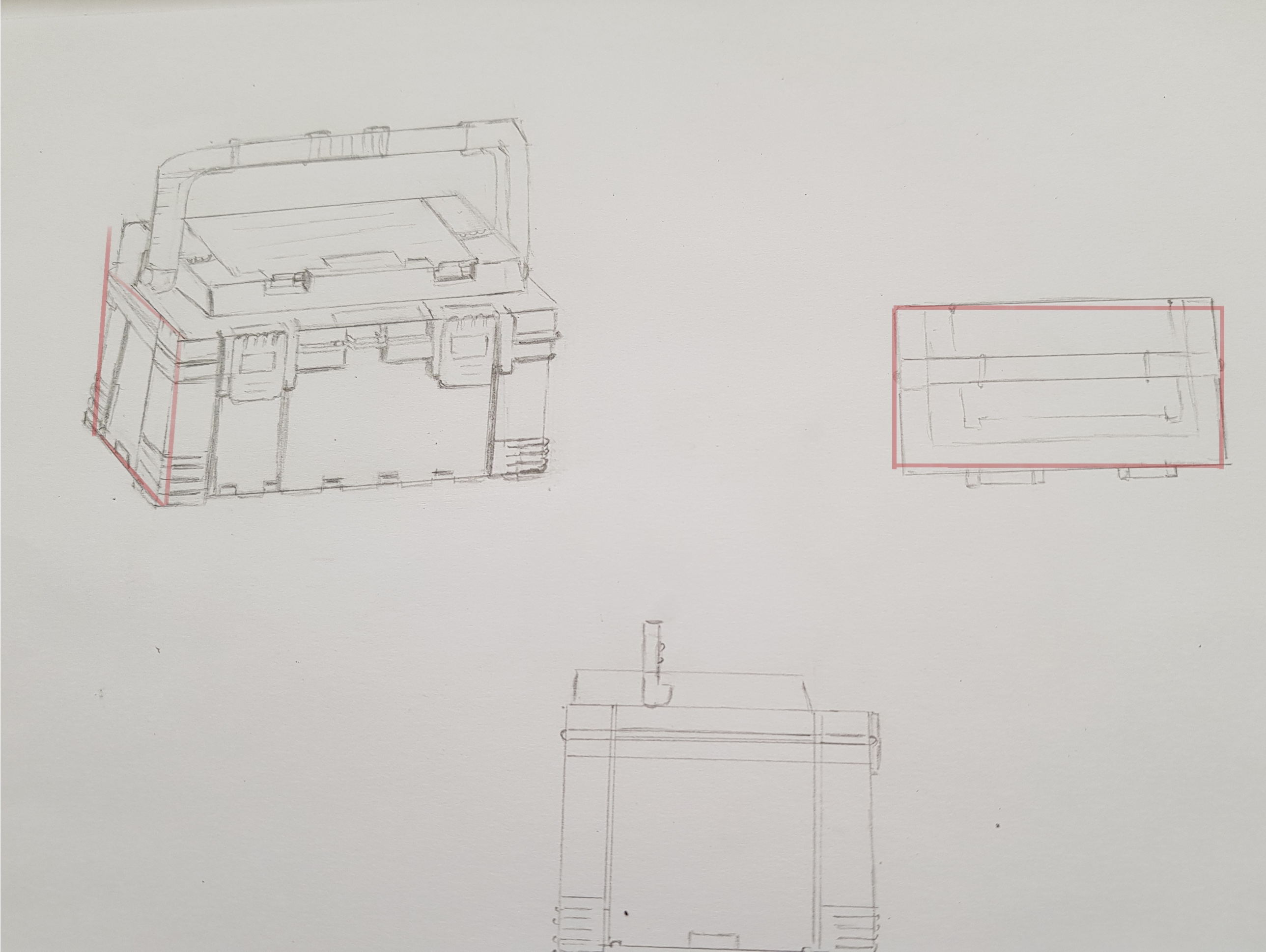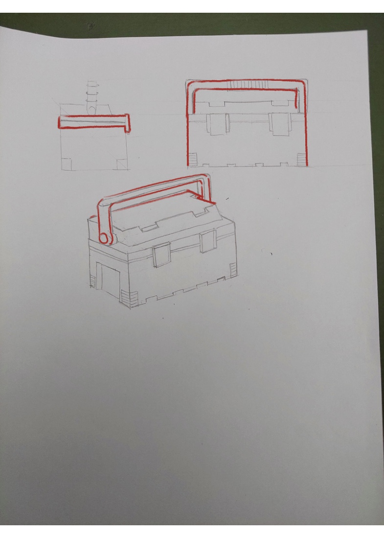 Même si tu as trouvé cet exercice un peu difficile, tu t'en es plutôt bien sorti 👍. Le principal problème qui se retrouve sur tous tes dessins, c'est que la caisse à outils paraît un peu plate. Tu peux effectivement utiliser du papier à carreaux si tu préfères, mais je te conseille de continuer avec une feuille blanche. C'est certes challengeant, mais c'est aussi le meilleur moyen d'apprendre, car pour ce genre de dessin d'analyse, il ne s'agit pas de reproduire une copie parfaitement réaliste, mais plutôt d'entraîner ton œil et ta main. Si tu prends l'habitude de t'appuyer sur une sorte de béquille, il te sera peut-être plus difficile de t'en détacher par la suite. Continue sur cette lancée et tu verras rapidement des progrès :)