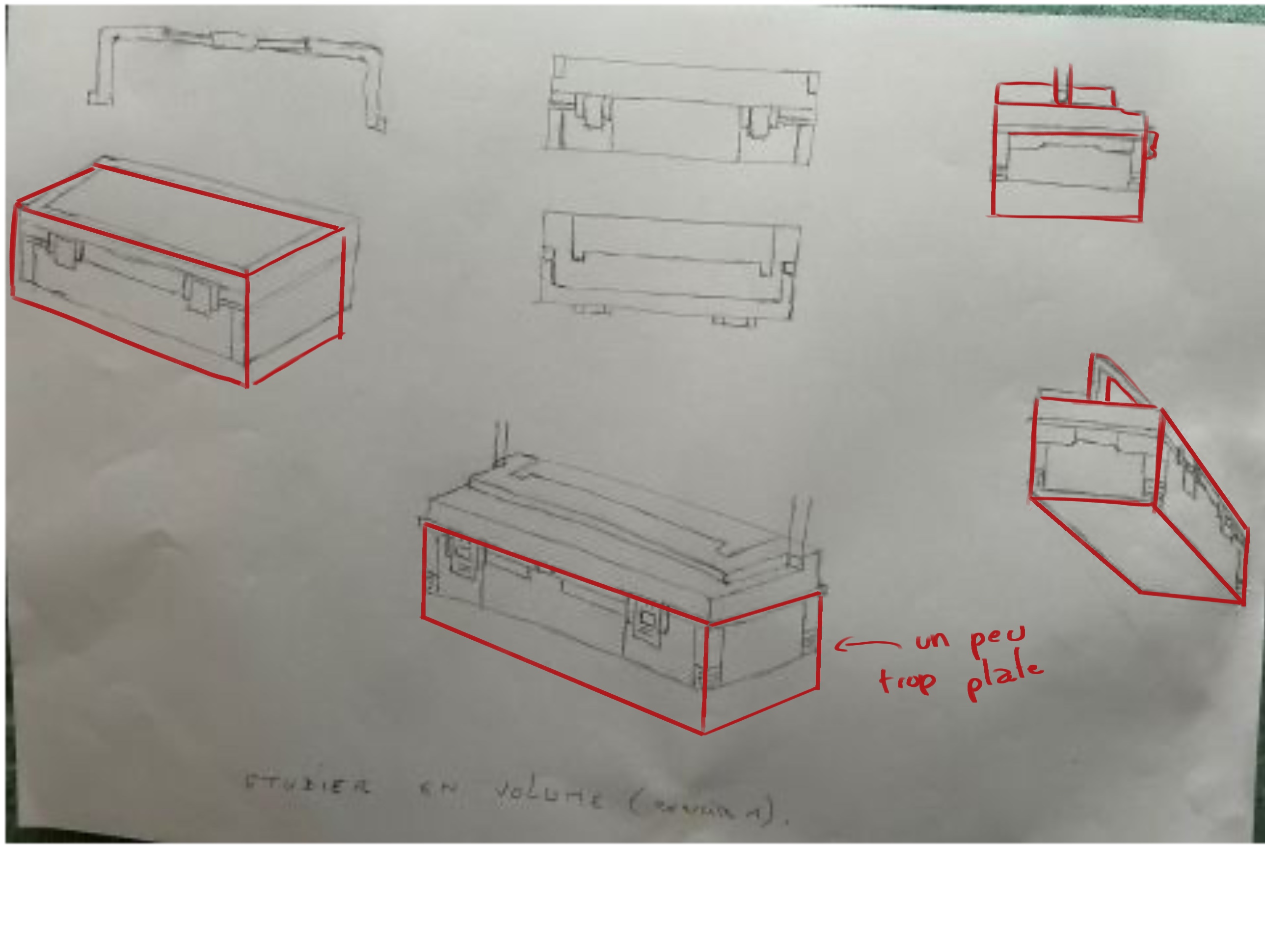 Dans l'ensemble, c'est plutôt bon :) Le principal point à retravailler, comme tu l'as mentionné, ce sont effectivement les proportions. C'est vrai qu'elles peuvent parfois être assez capricieuses ! Voici une petite astuce : essaie d'observer sur ta référence ou sur un de tes dessins dont tu aimes les proportions les différents rapports. Par exemple, ici je me suis servi de la boîte vue en 3/4 en haut, et j'ai noté quelques rapports. Pas besoin de mesurer précisément, il suffit de mémoriser pour t'en servir comme guide. Par exemple, la hauteur de la poignée fait environ la moitié de la hauteur de la boîte, ou encore, la largeur de la boîte représente environ la moitié de sa longueur. Bien sûr, ce ne sera pas toujours exact, surtout avec la perspective, mais ça peut te donner un bon point de repère pour t'aider :)