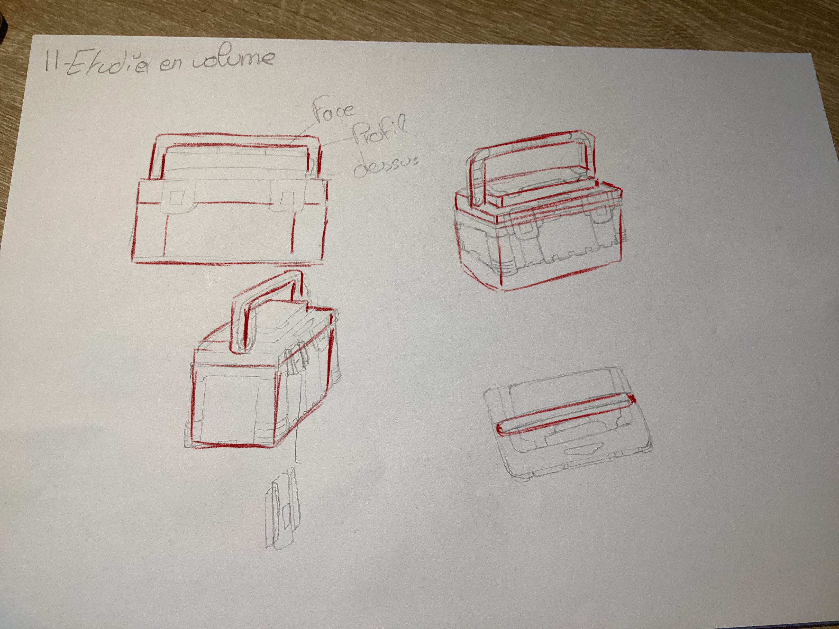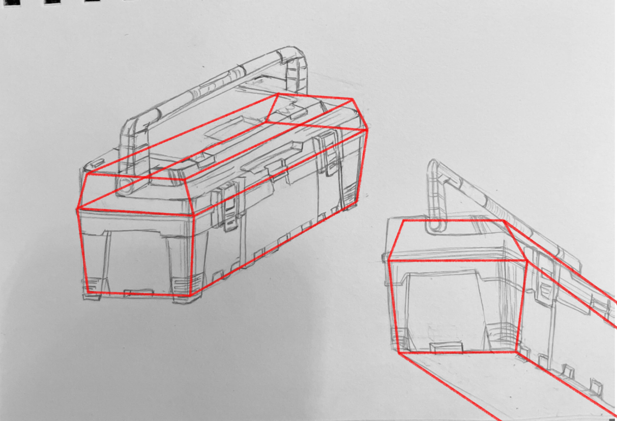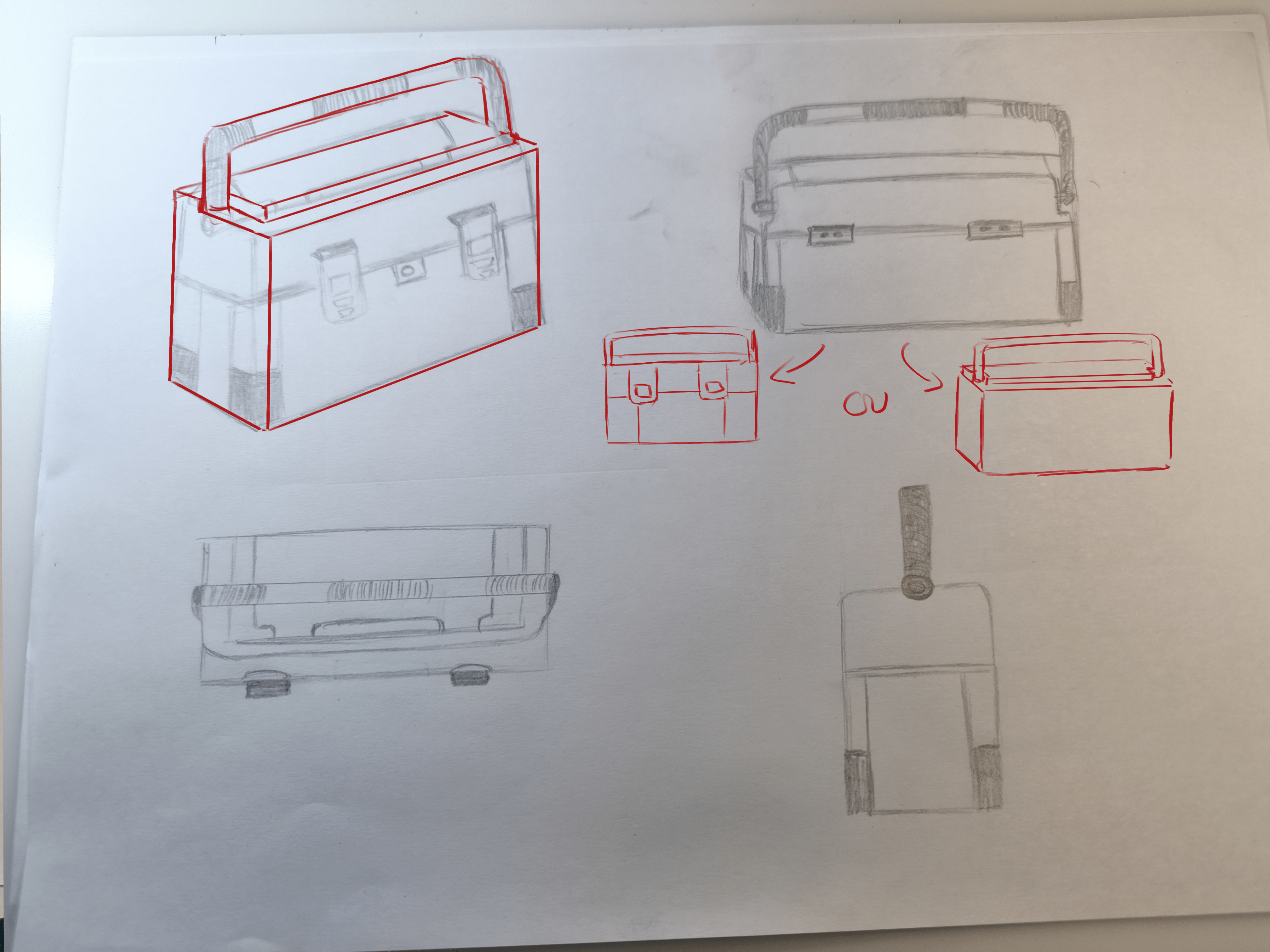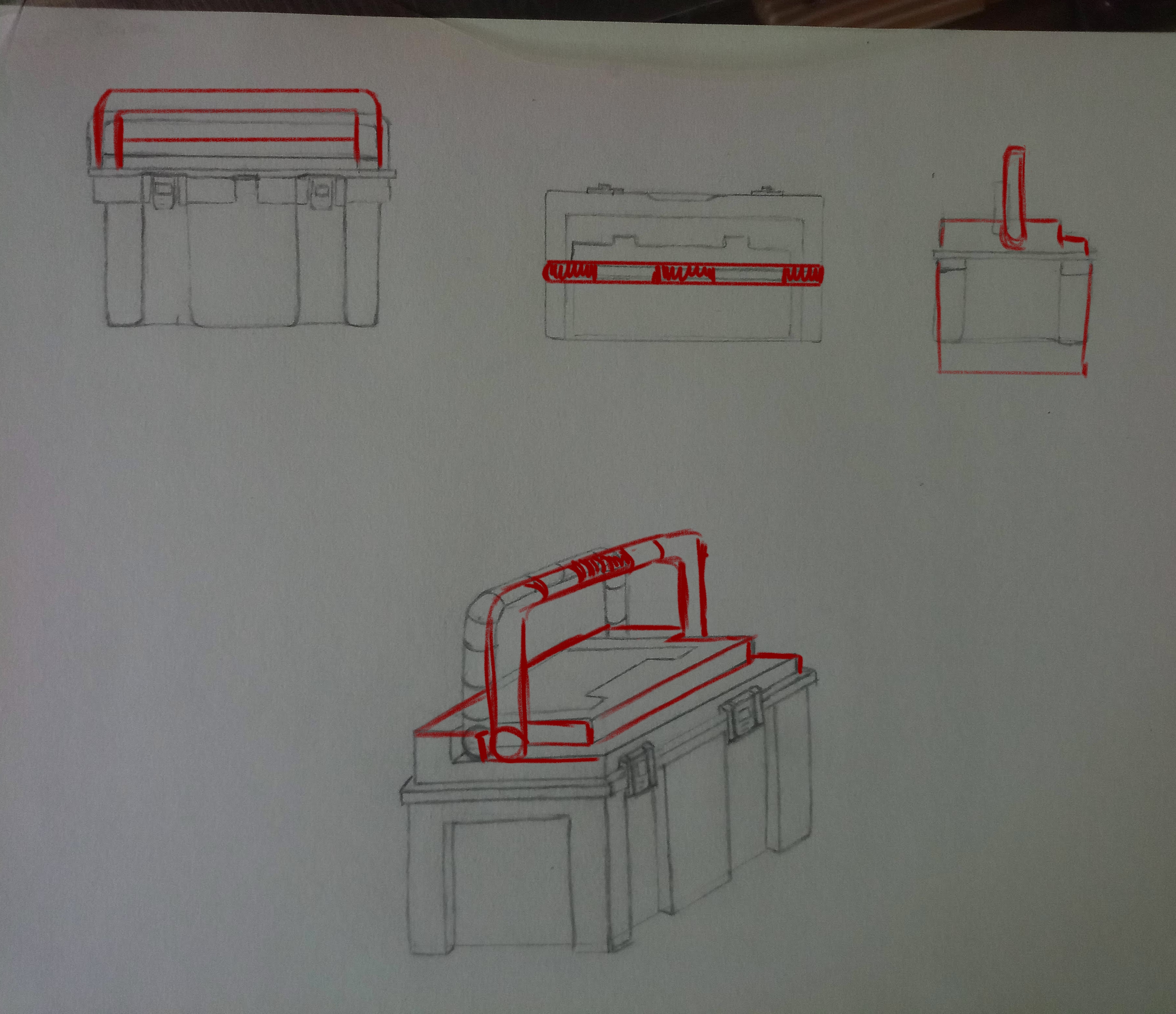 Voici ma version de la caisse à outils. J'ai un peu de mal à travailler la perspective sans utiliser de point de fuite réel.