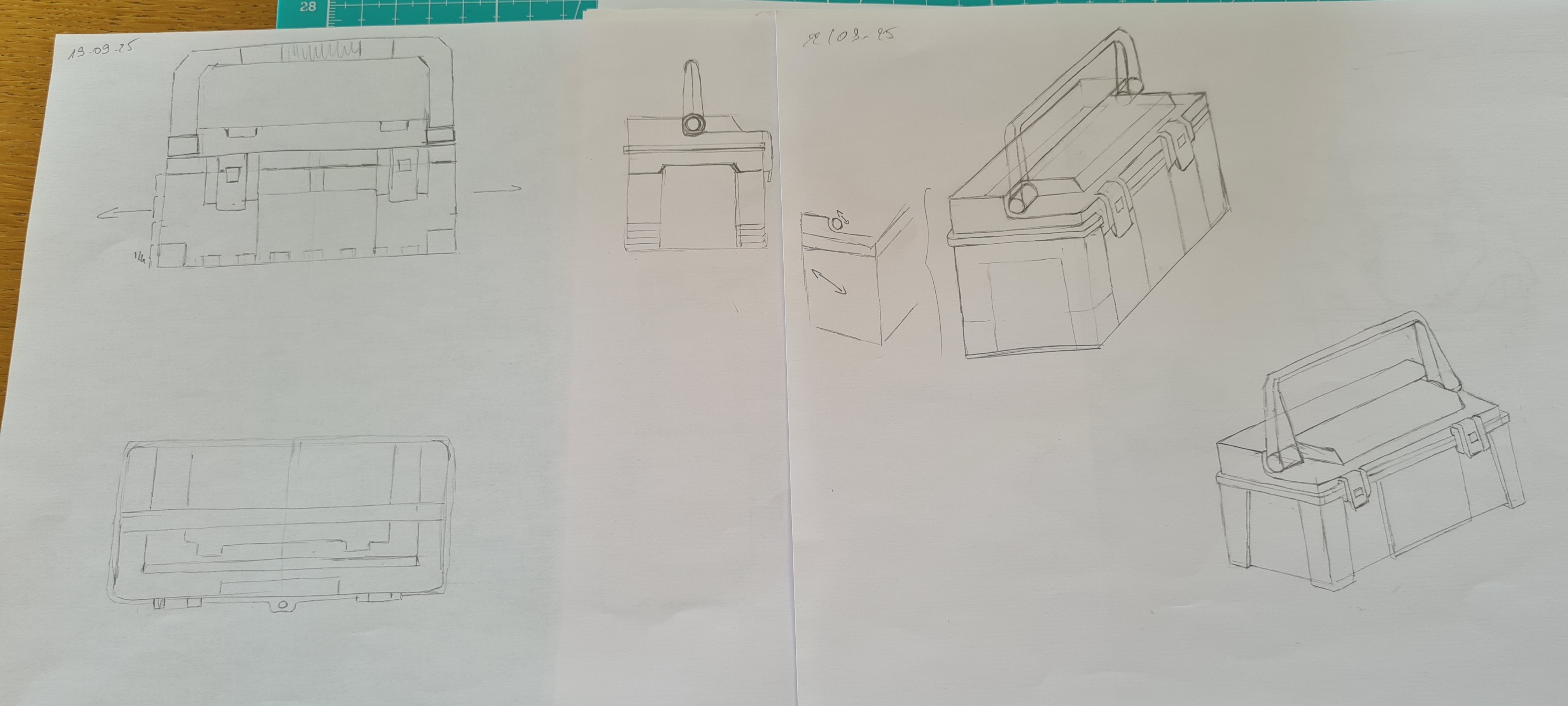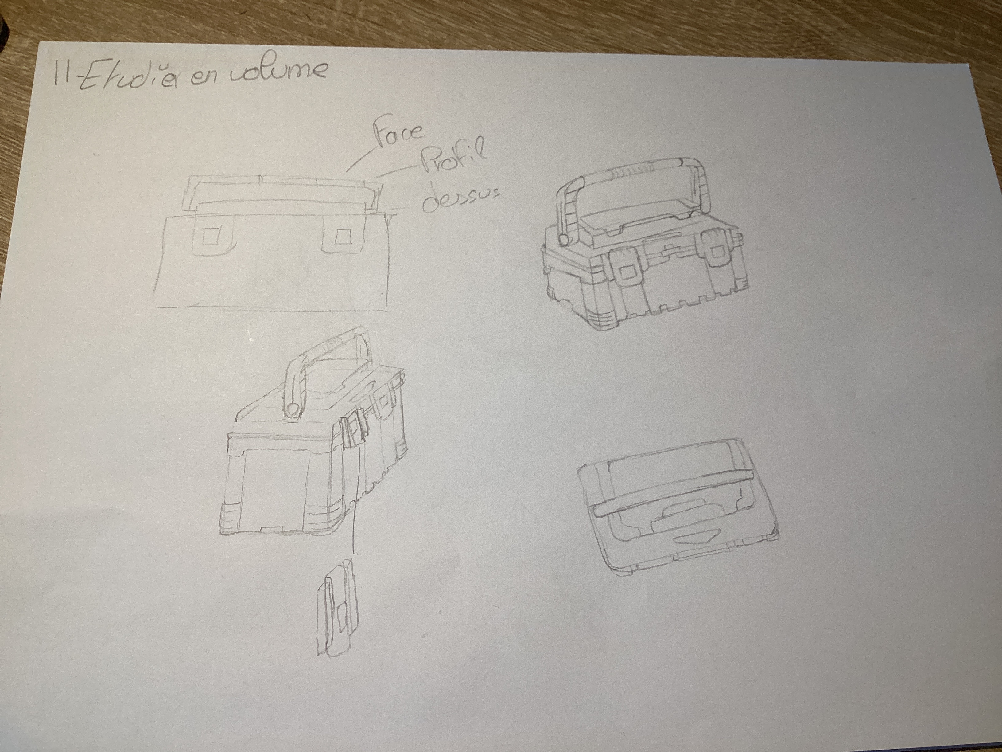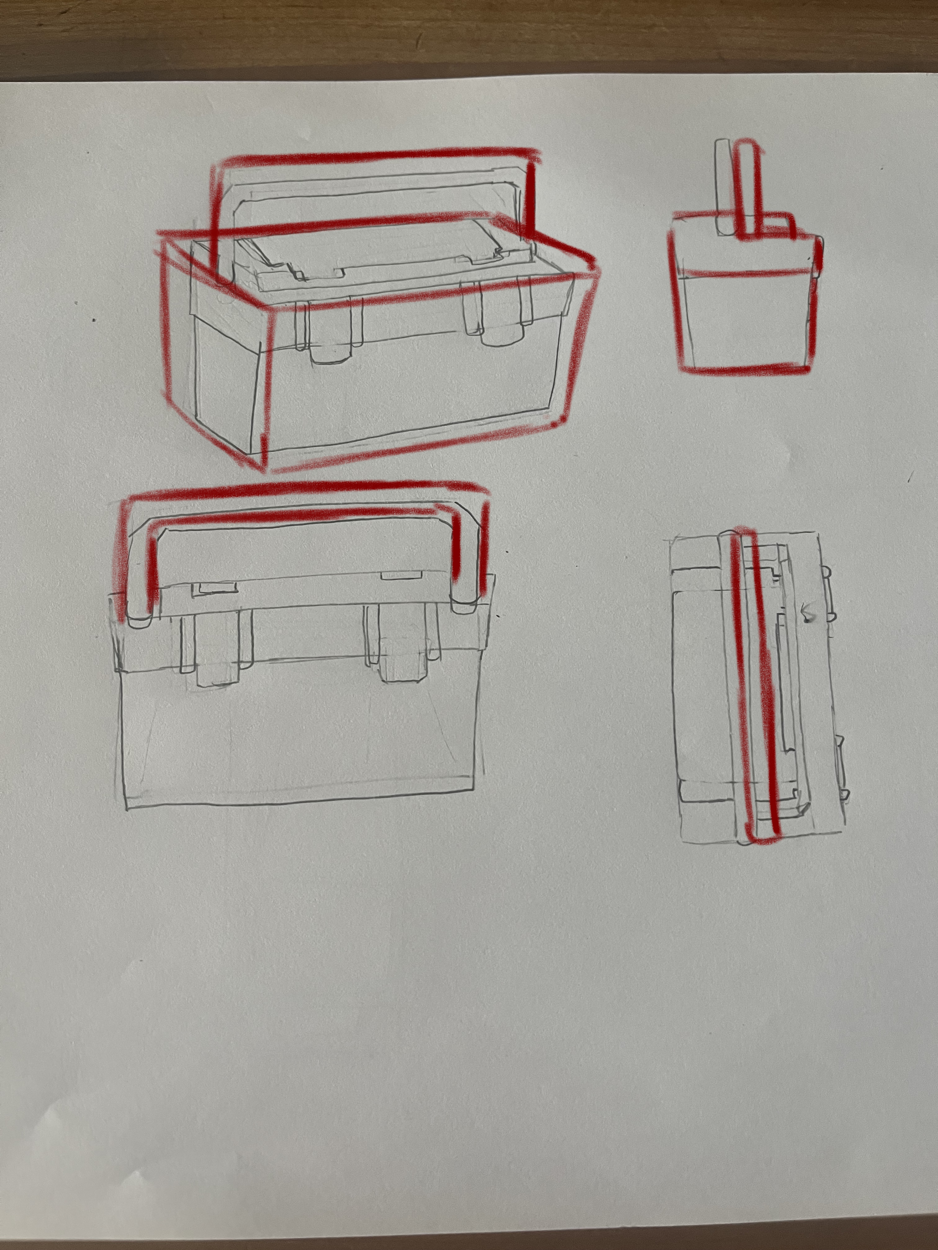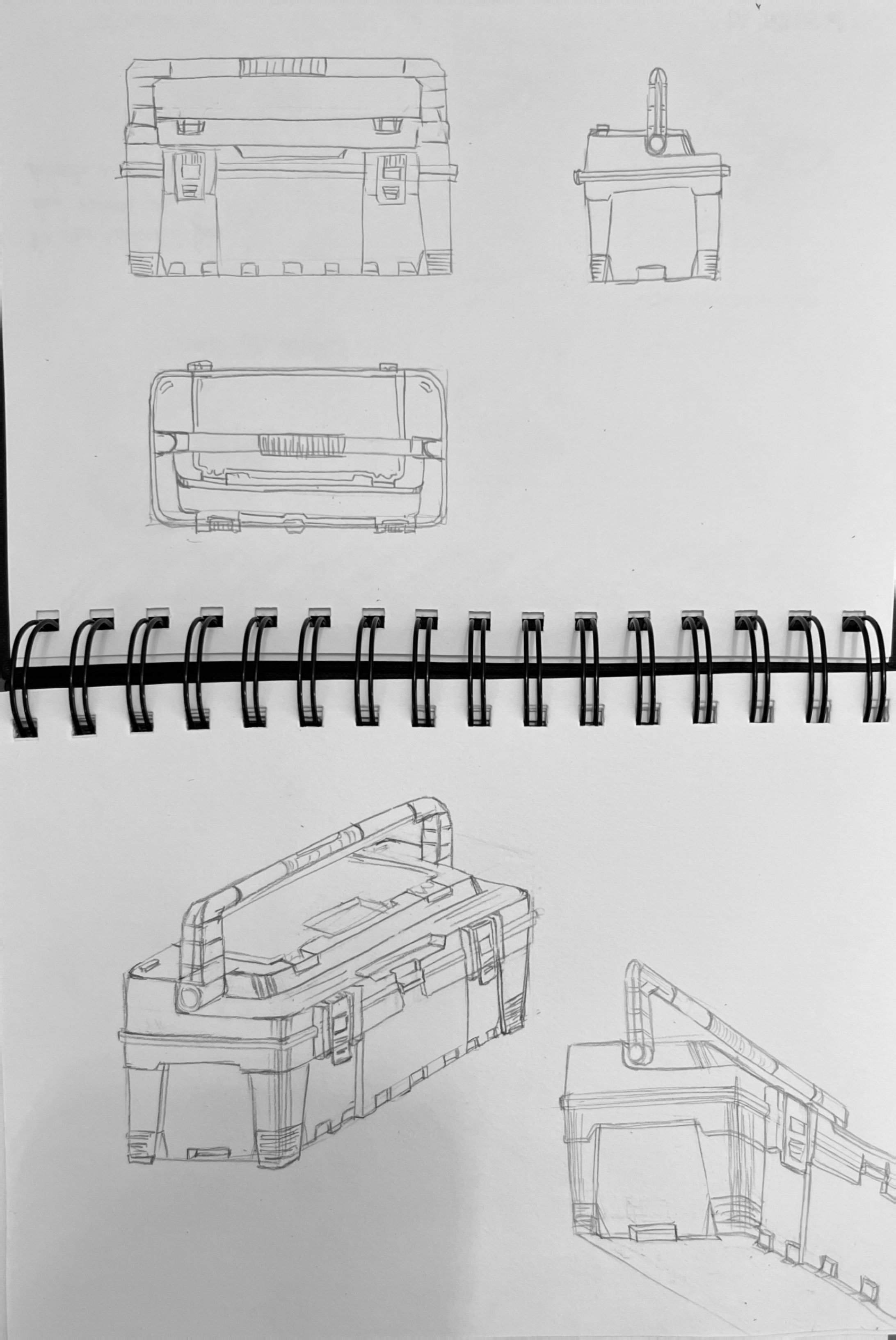 Voici ma version de la caisse à outils. J'ai un peu de mal à travailler la perspective sans utiliser de point de fuite réel.