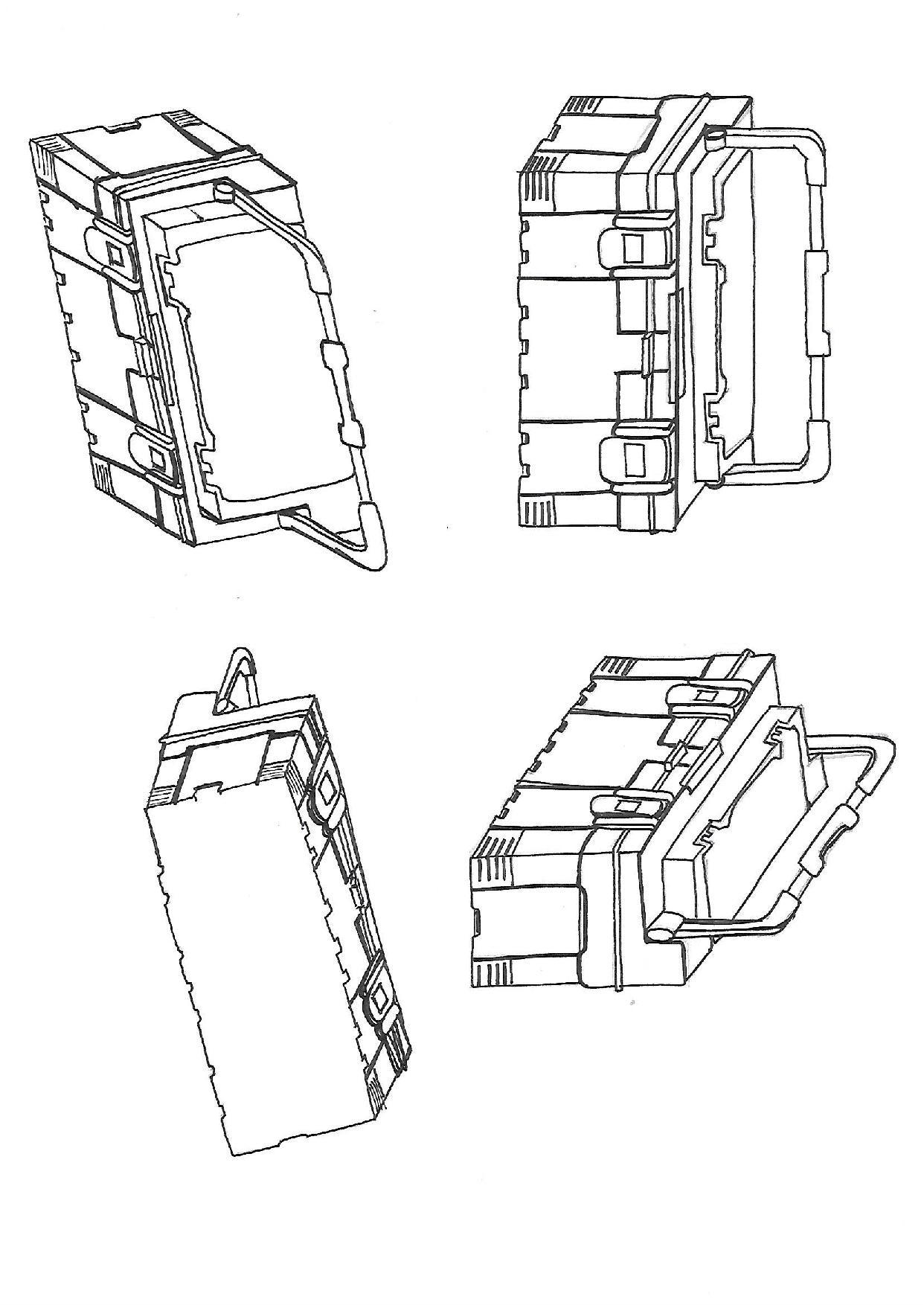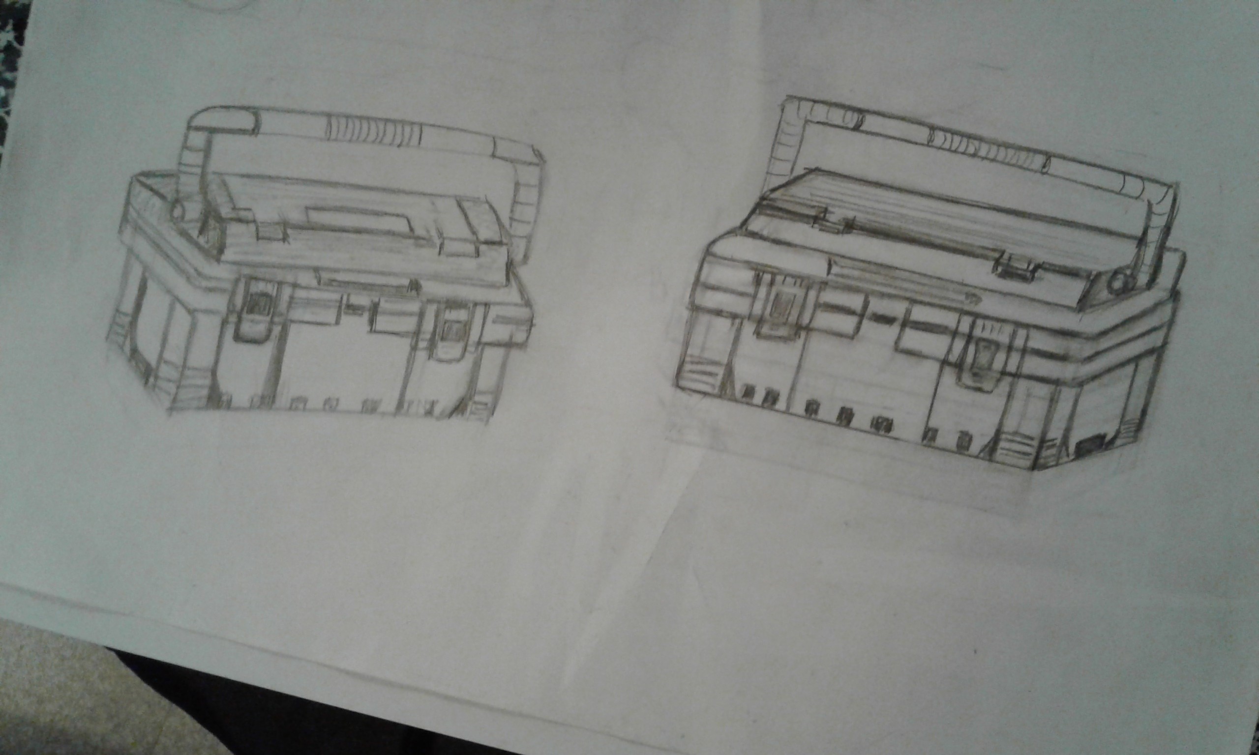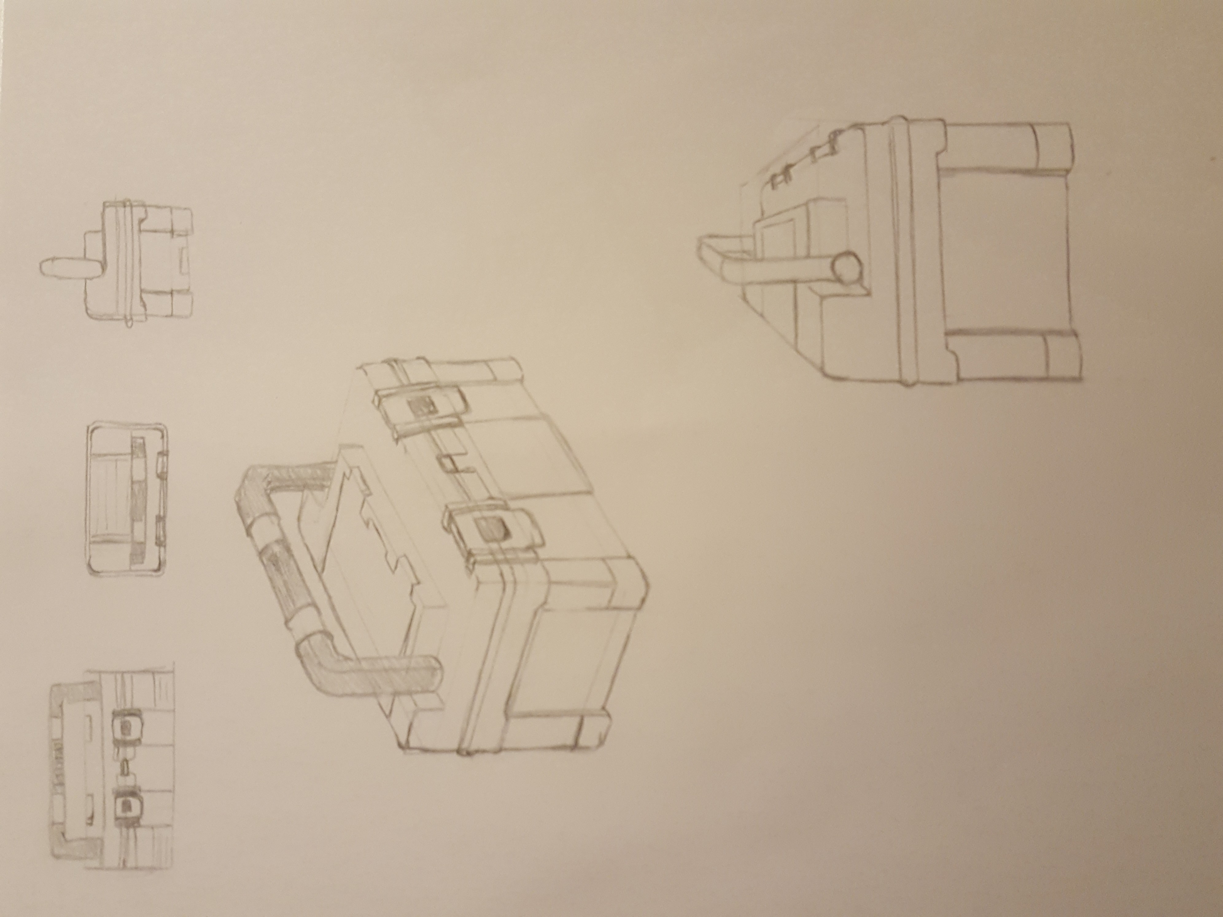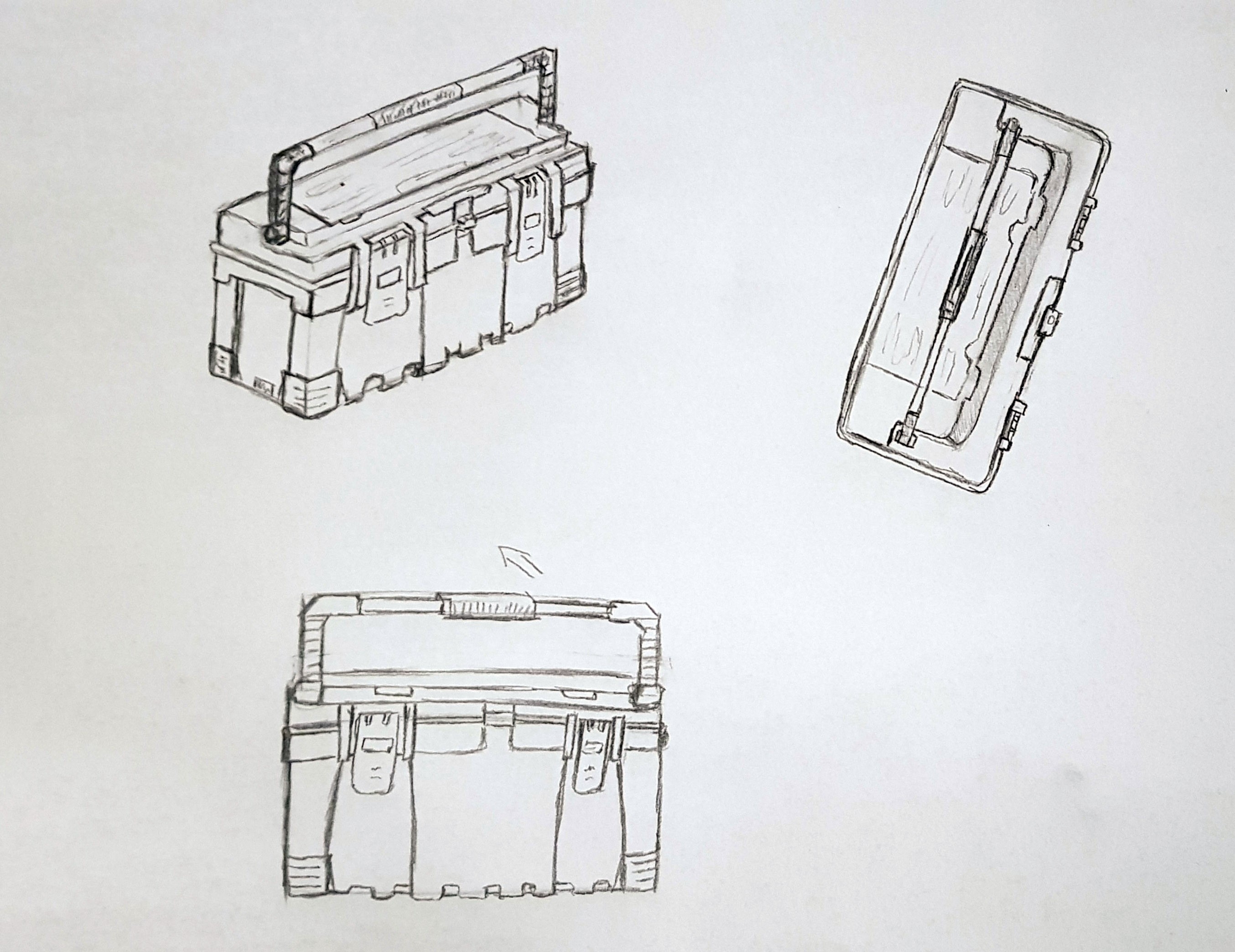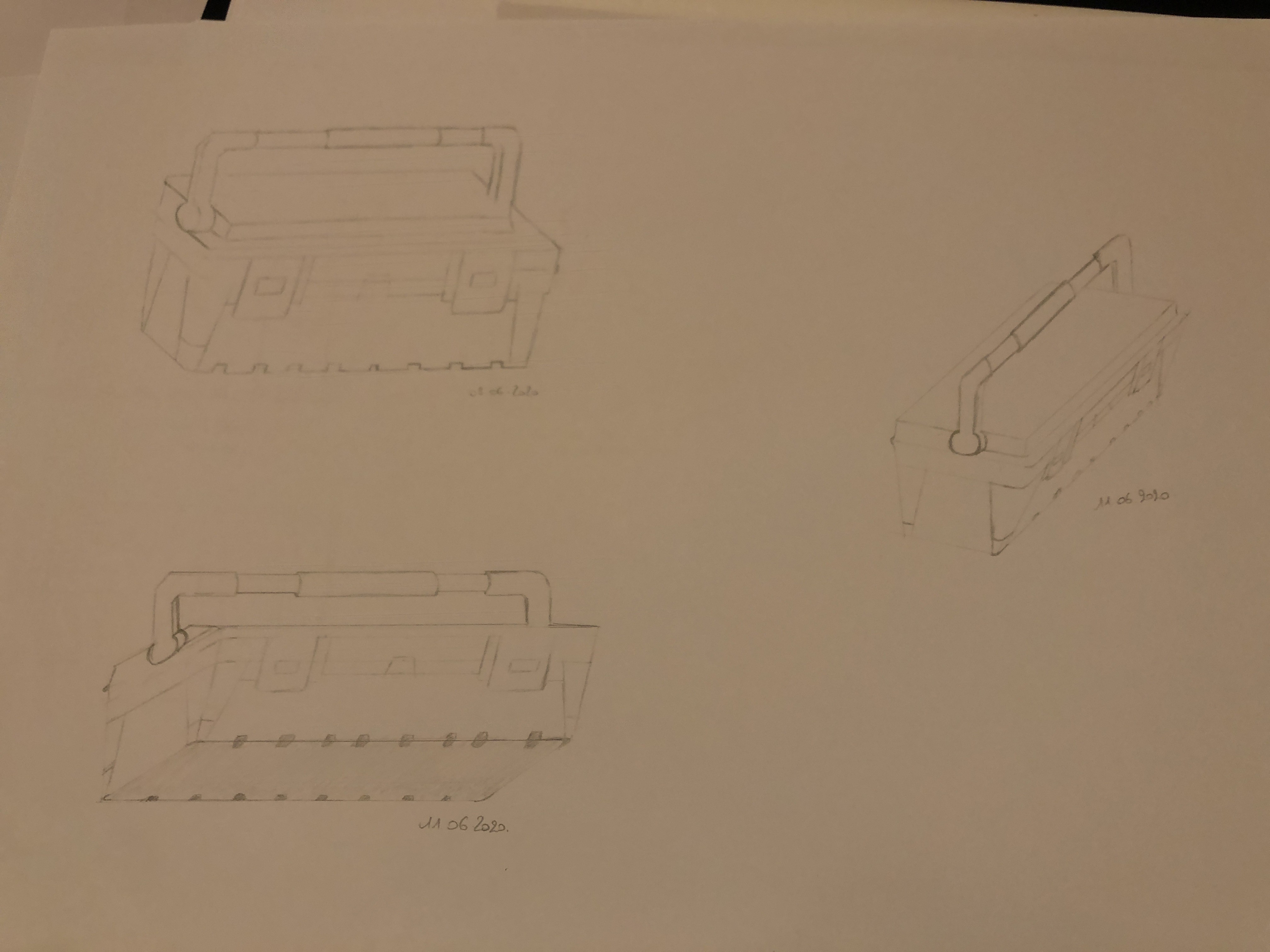 Voici mes premiers essais pour la caisse à outils. A part le fait que j'ai du mal à respecter les proportions, je pense avoir bien compris les formes (3D) de l'objet. Je suis fin prêt à bosser à casto :p