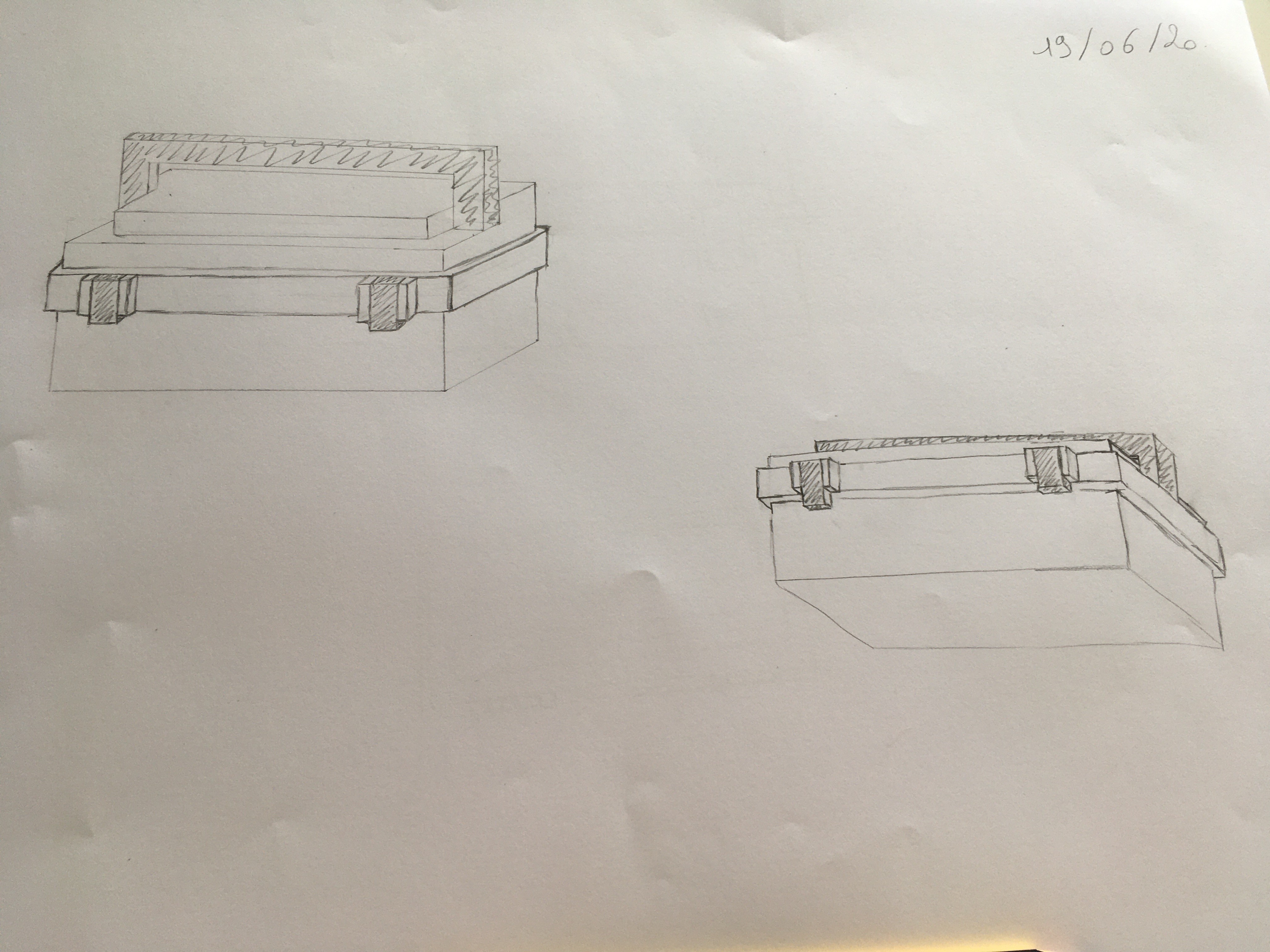 C'est pas mal, mais tu as des incohérences entre tes deux vues. Sur celle à gauche, tu me montres que sur le couvercle, tu as une partie plus élevée avec un espace à droite et à gauche pour la poignée de la caisse (ce qui est juste). Sur la version à droite, j'ai bien cet espace à droite, mais pas à gauche. La poignée déborde à l'extérieur, il n'y a plus d'espace.