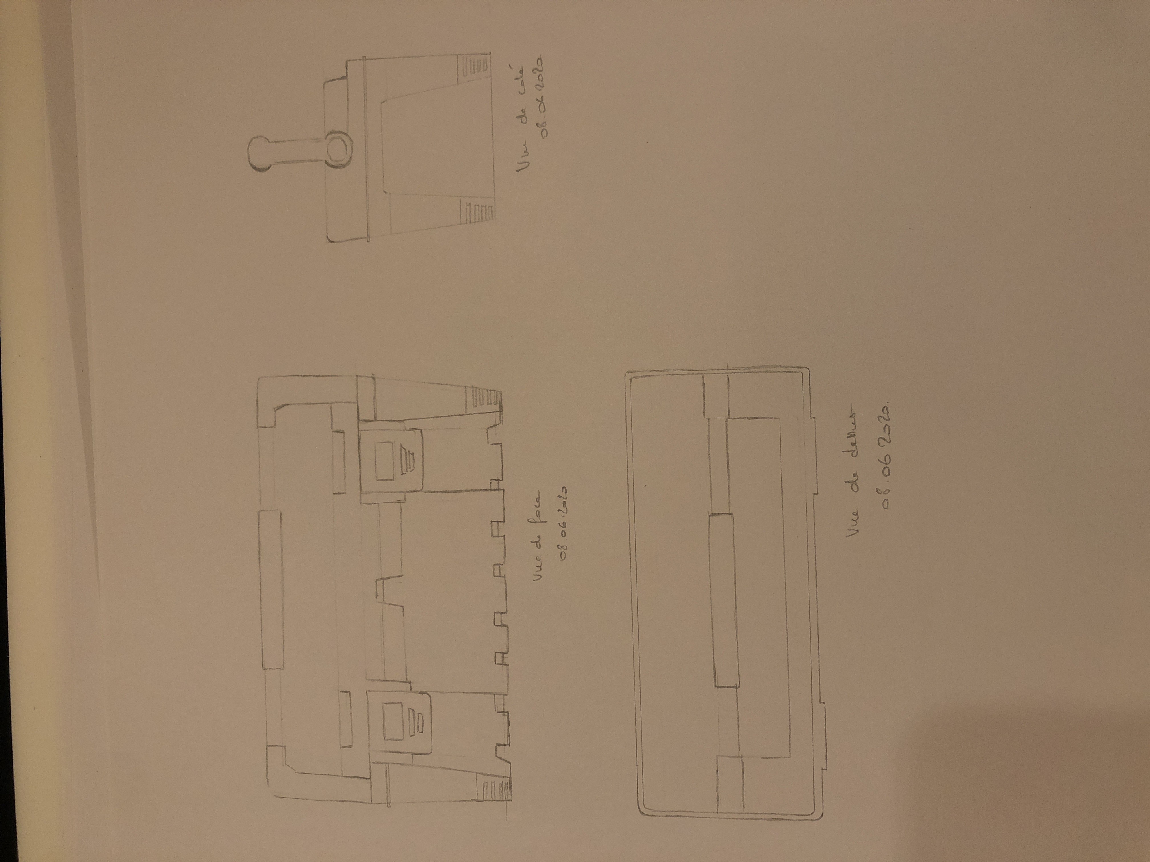 Pour ton exercice, attention, j'ai l'impression que tu as changé des éléments entre les vues 2D et les vues 3D. Par exemple, en 2D, ta boite est un rectangle grosso modo. En 3D, on dirait que tu as choisi d'incliner la face avant. Sur une autre vue, tu as mis un rebord au-dessus des fermetures de la boite, alors que de face, on voit bien que les fermetures montent jusqu'à la face supérieure de la boite. Donc attention, je dois avoir les mêmes caractéristiques partout.