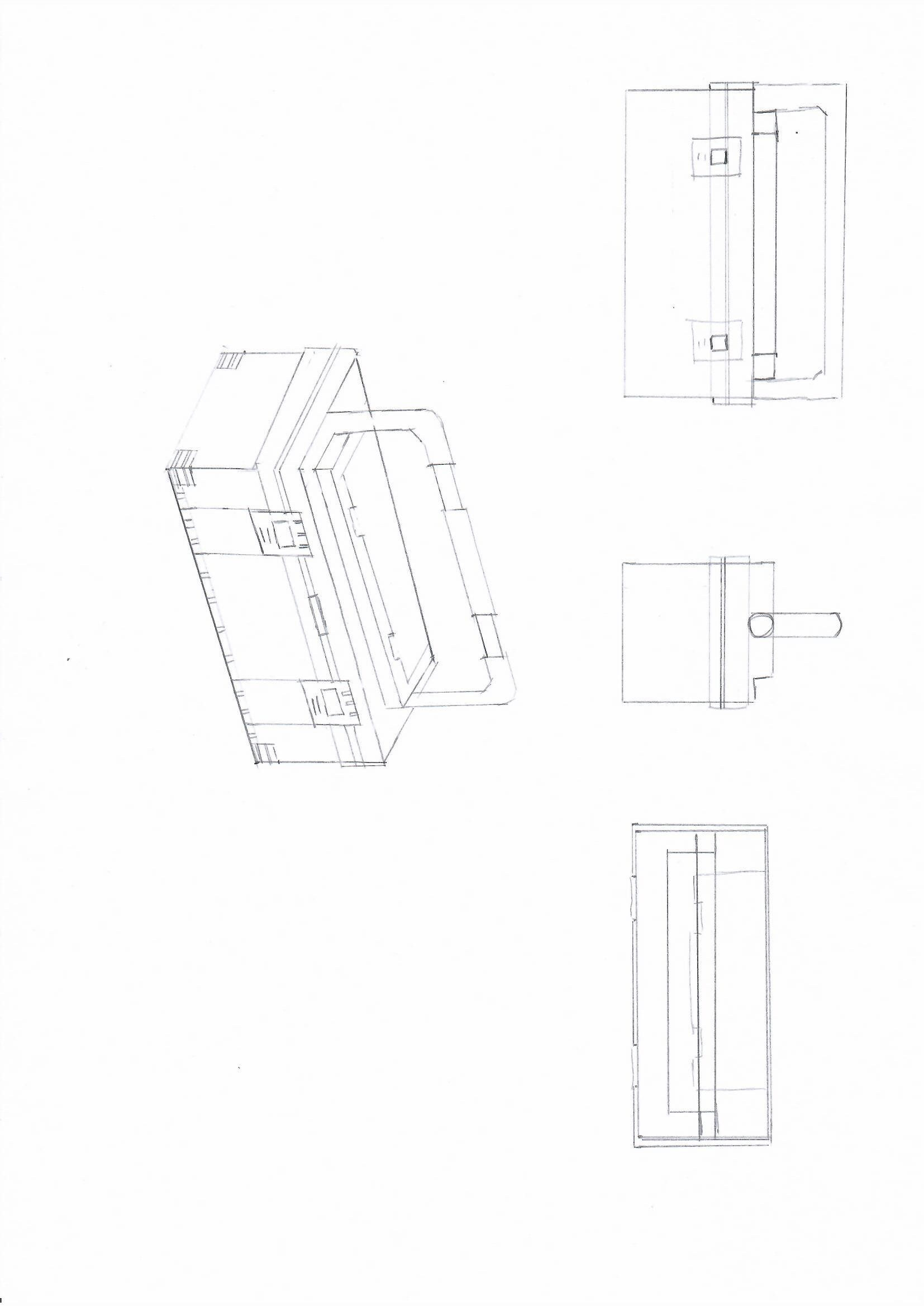 Básicamente, me muestras que hay un borde más alto en el centro de la tapa y que se extiende hasta la parte trasera, sin embargo, los contornos de la cubierta parecen indicar que la caja es perfectamente plana. Entonces tenemos una gran inconsistencia. También tiene una asimetría, en un lado su mango está pegado al borde de la caja (que es correcto) en el otro tiene un margen. Tenga cuidado, mi corrección con respecto al borde trasero no es solo una relación con el modelo, sino que solo sirve para mostrarle la inconsistencia en la información que pone en su dibujo. Tenga cuidado con la construcción y no dude en trabajar en transparencia si es necesario (como si viera a través del objeto).