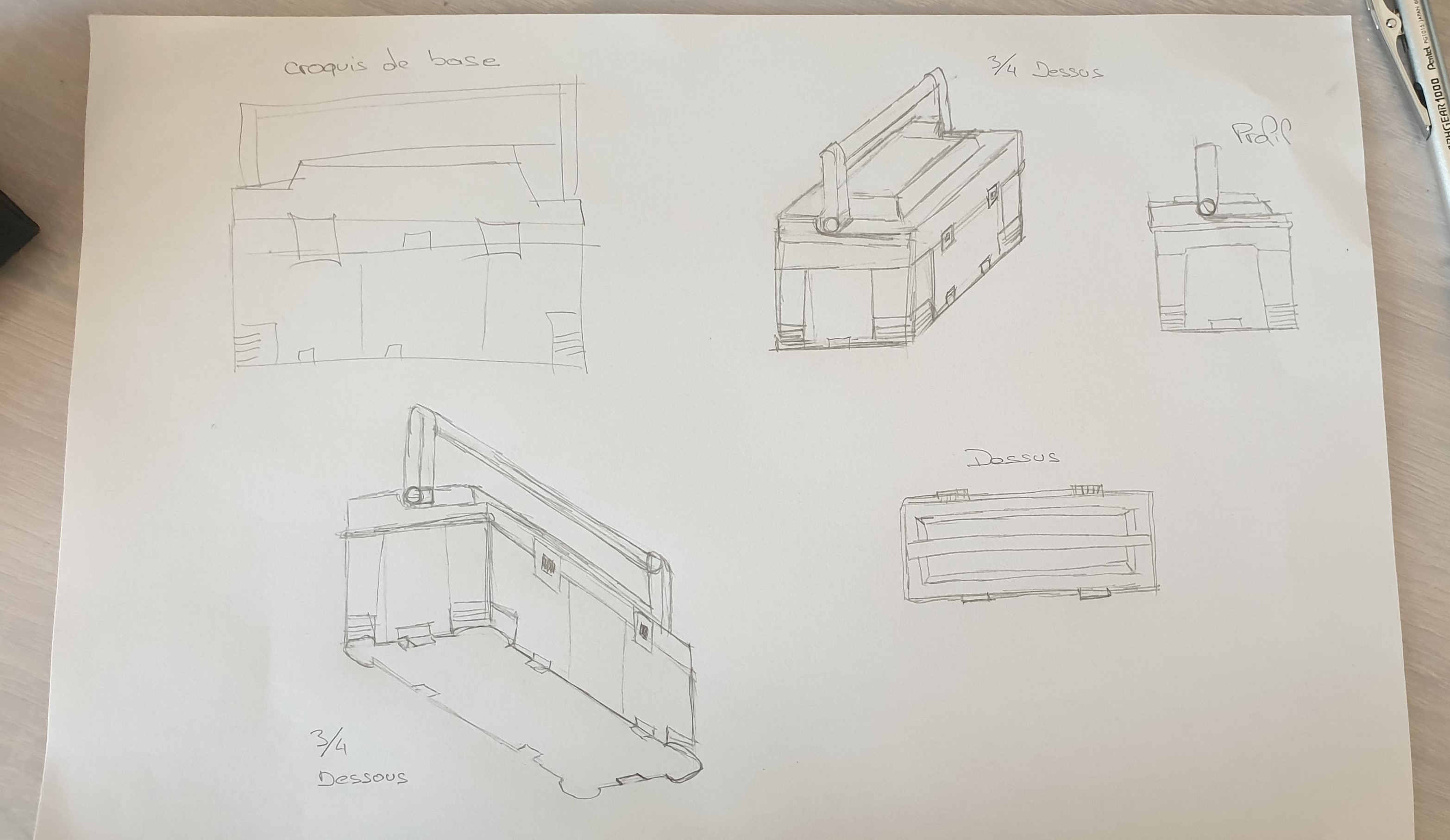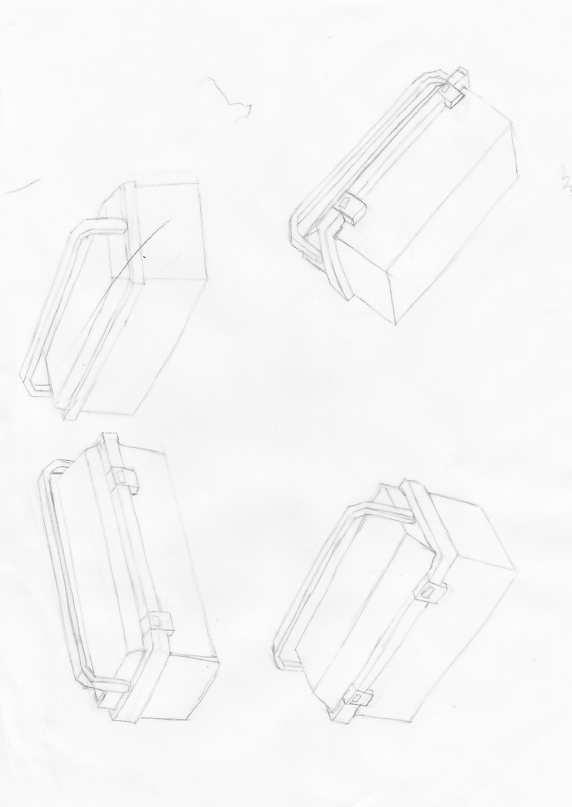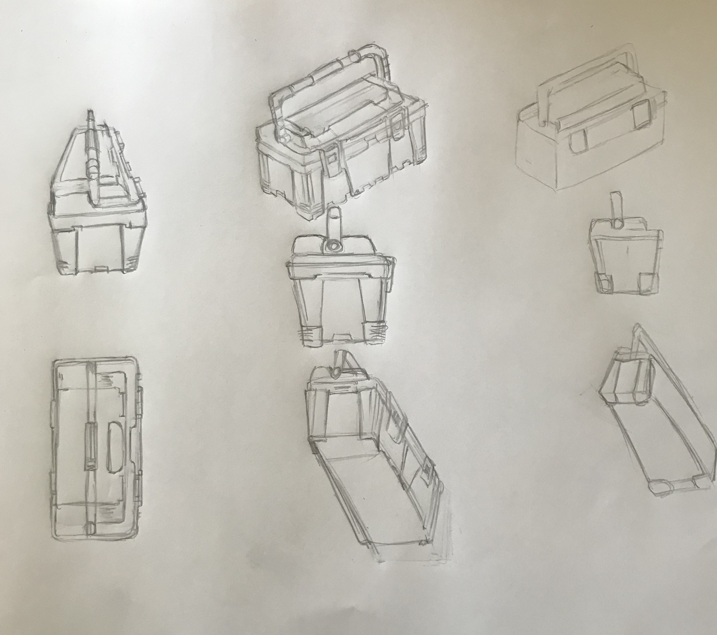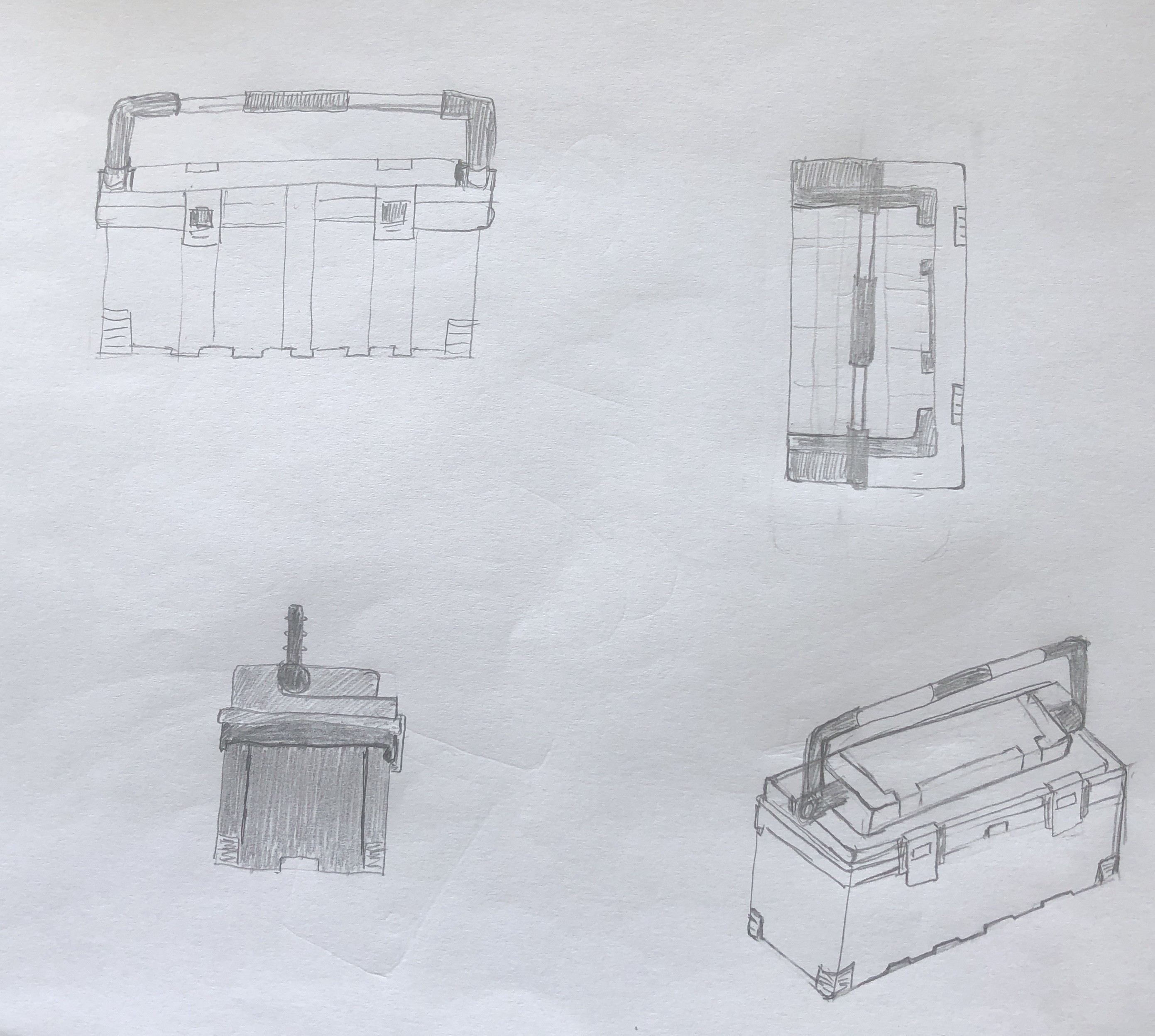 > Attention aux proportions, ta caisse à outils change complètement de longueur et d'épaisseur selon les vues : je dois avoir l'impression que je regarde le même objet sous un autre angle, ses proportions ne doivent pas varier.