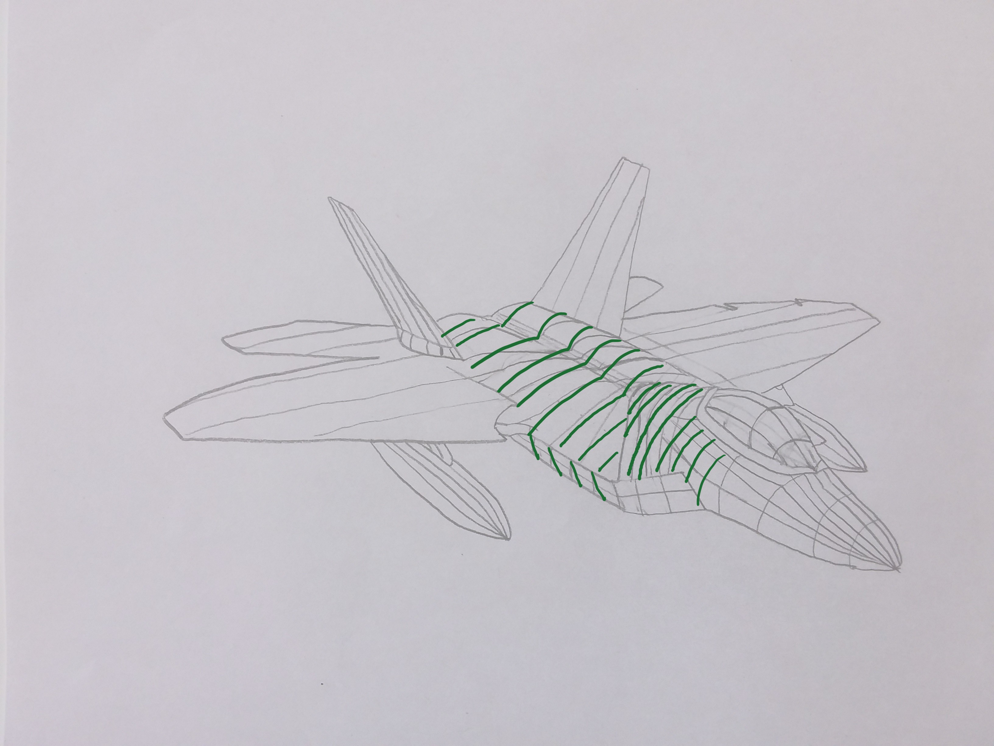 Oui tu pourrais faire une ligne qui traverse tout. Je n'ai pas touché aux ailes dont le volume est bon pour chacune, mais si on voulait suivre ta logique, il faudrait décaler une ou deux ligne de l'aile à droite pour être raccord avec celle de gauche et tout aligner.