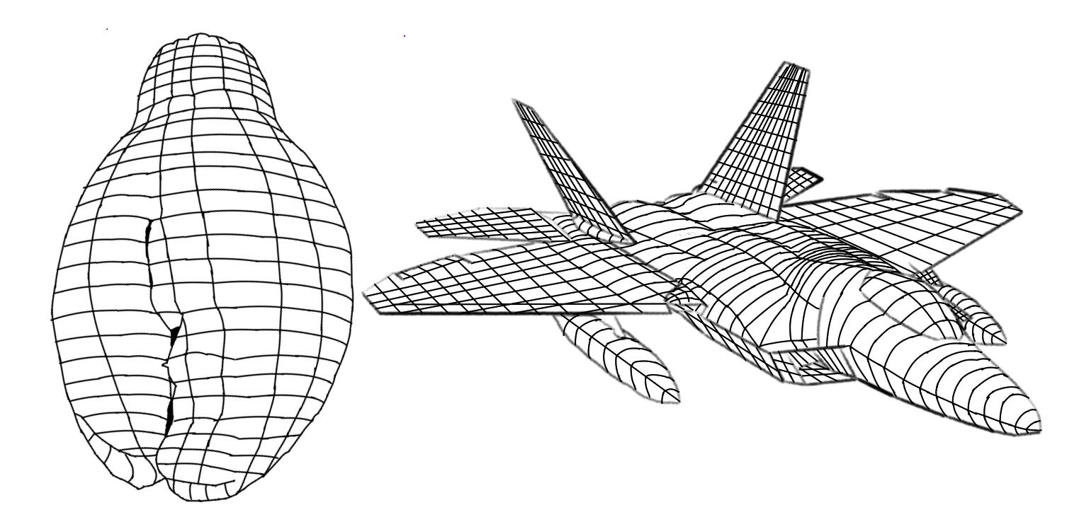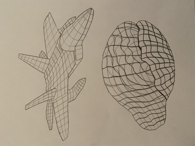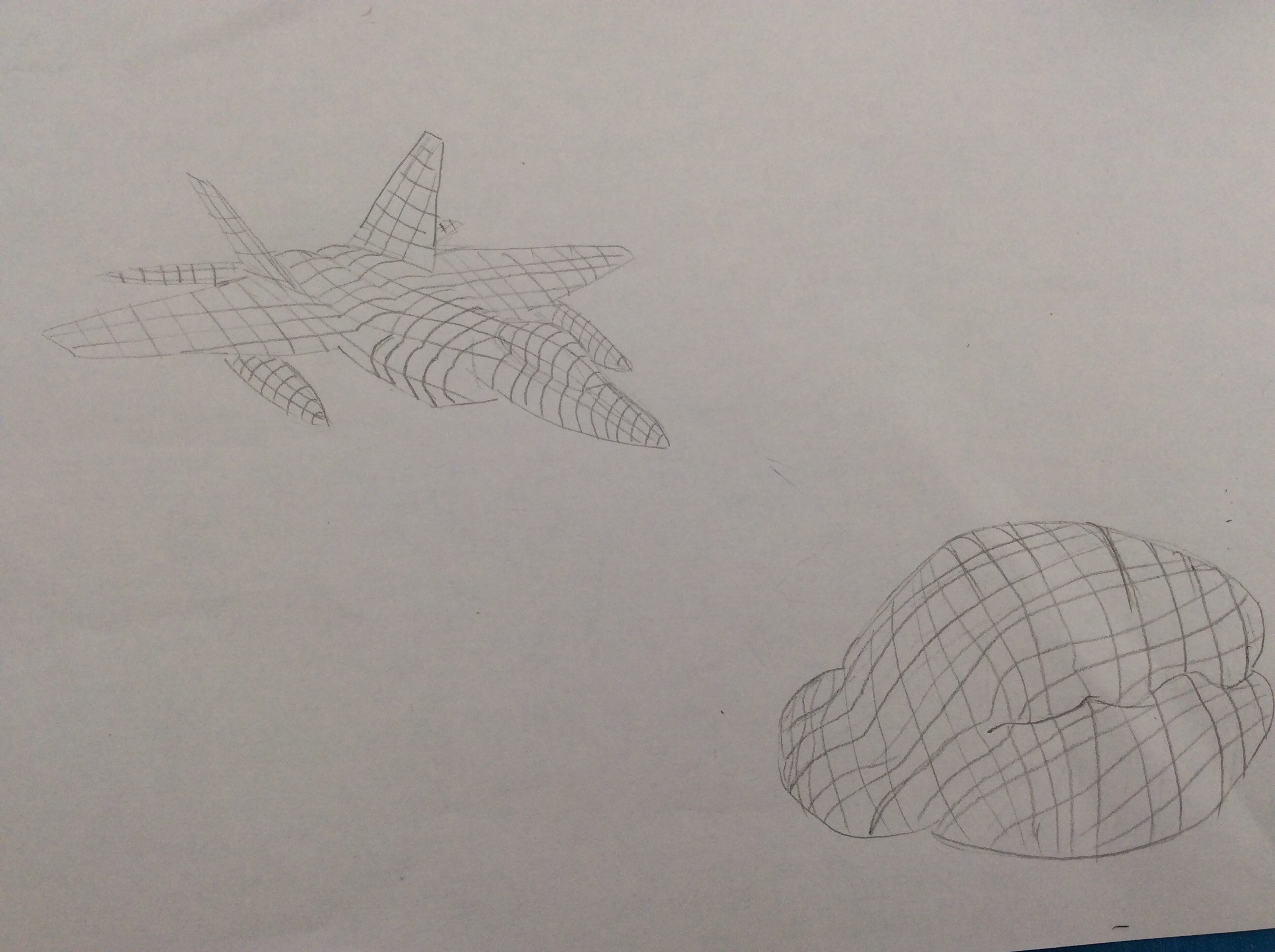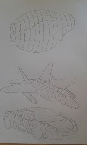 De hecho, Pasha, vemos que no entendiste el ejercicio. Permite comprender el volumen del objeto. Como si hubieras tomado algún objeto y rastreaste una cuadrícula. Le permite comprender formularios y volúmenes. Para un cubo es bastante simple, pero para formas más complejas como aquí, debe comprender el volumen para hacer algo coherente. Por ejemplo, dada la cuadrícula que hizo en las alas del avión, las líneas son un poco ondulantes, pero no en ambos lados simétricamente. Lo cual es extraño porque las alas de un avión son planas y rectas.