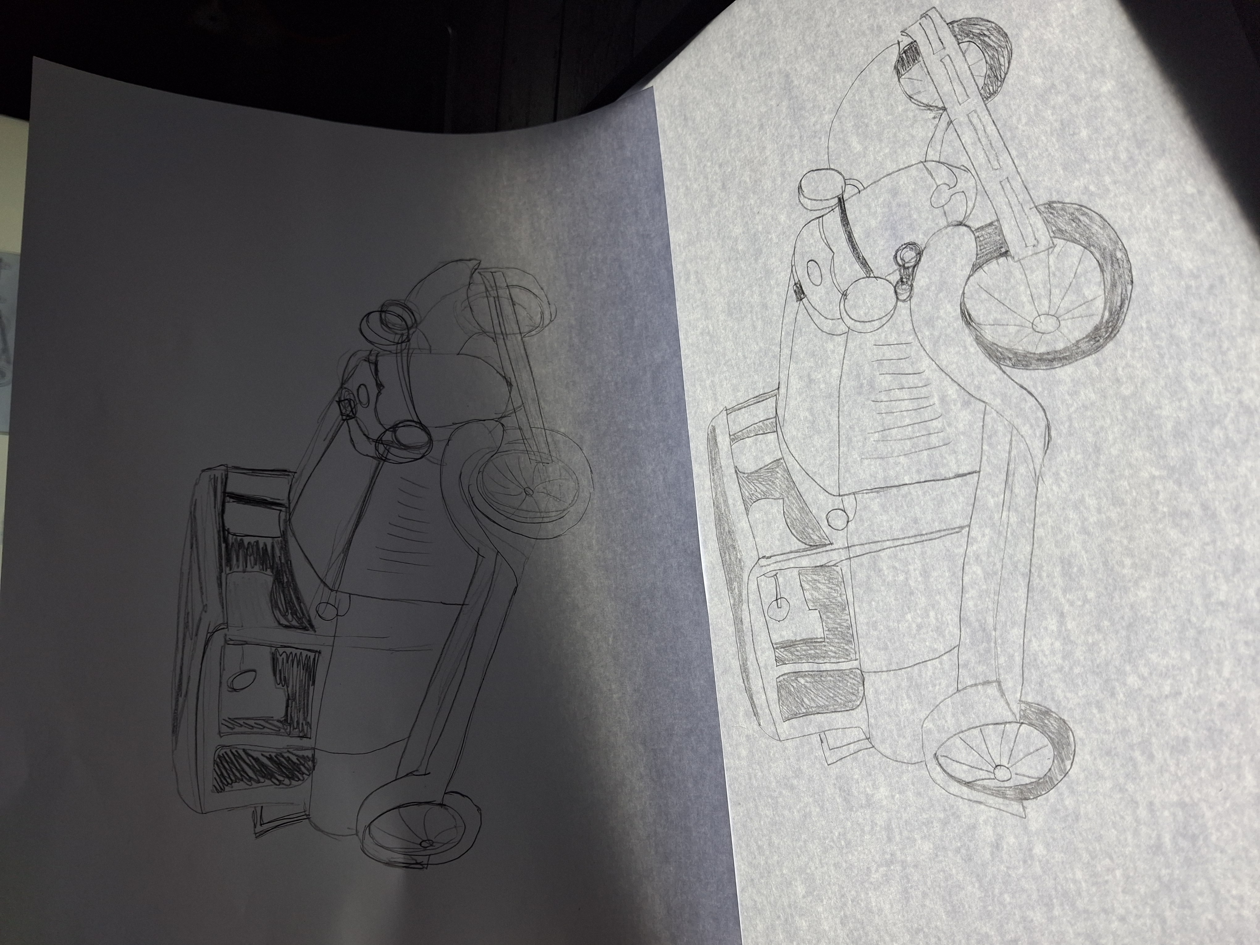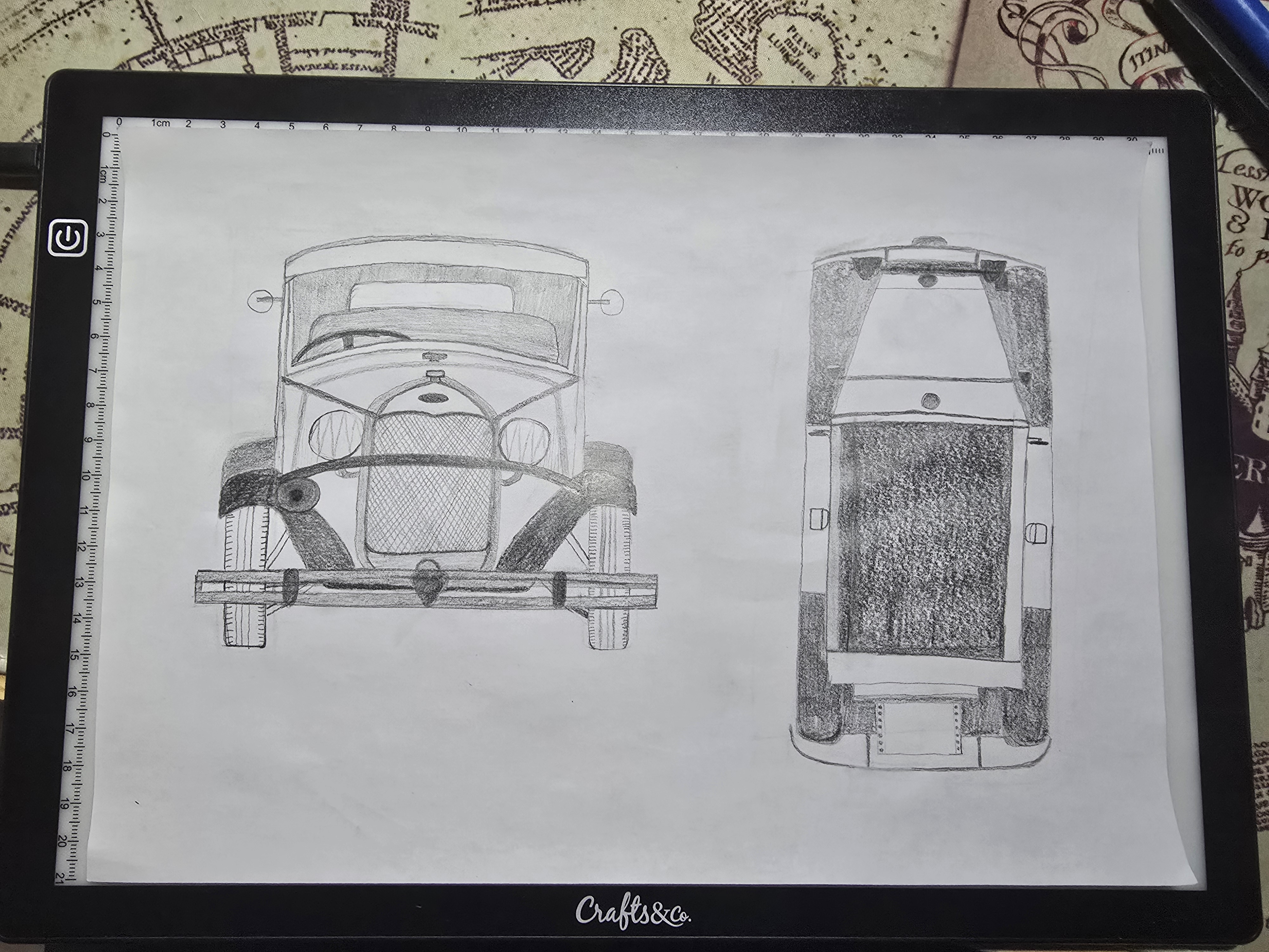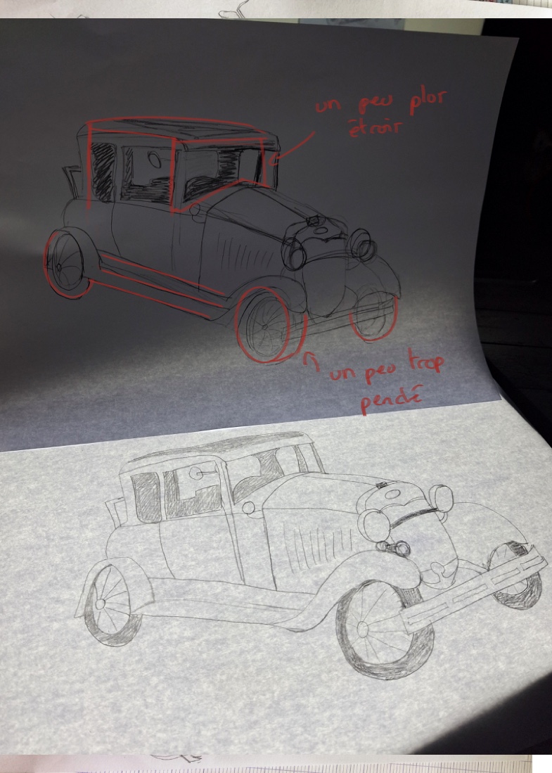 Aquí están mis primeros dibujos. Qué bofetada me resultó muy difícil. Simplemente no puedo imaginar el auto en 3D, tal vez porque tardé 6 años en tener mi licencia. Ciertamente podría haber perseverado, pero sentí que la ansiedad y el nerviosismo subían. Tendremos que aprender a administrar la mente además del lápiz.
