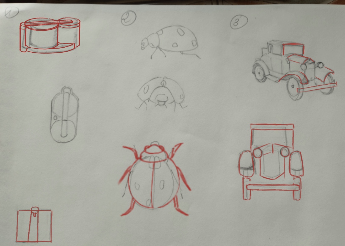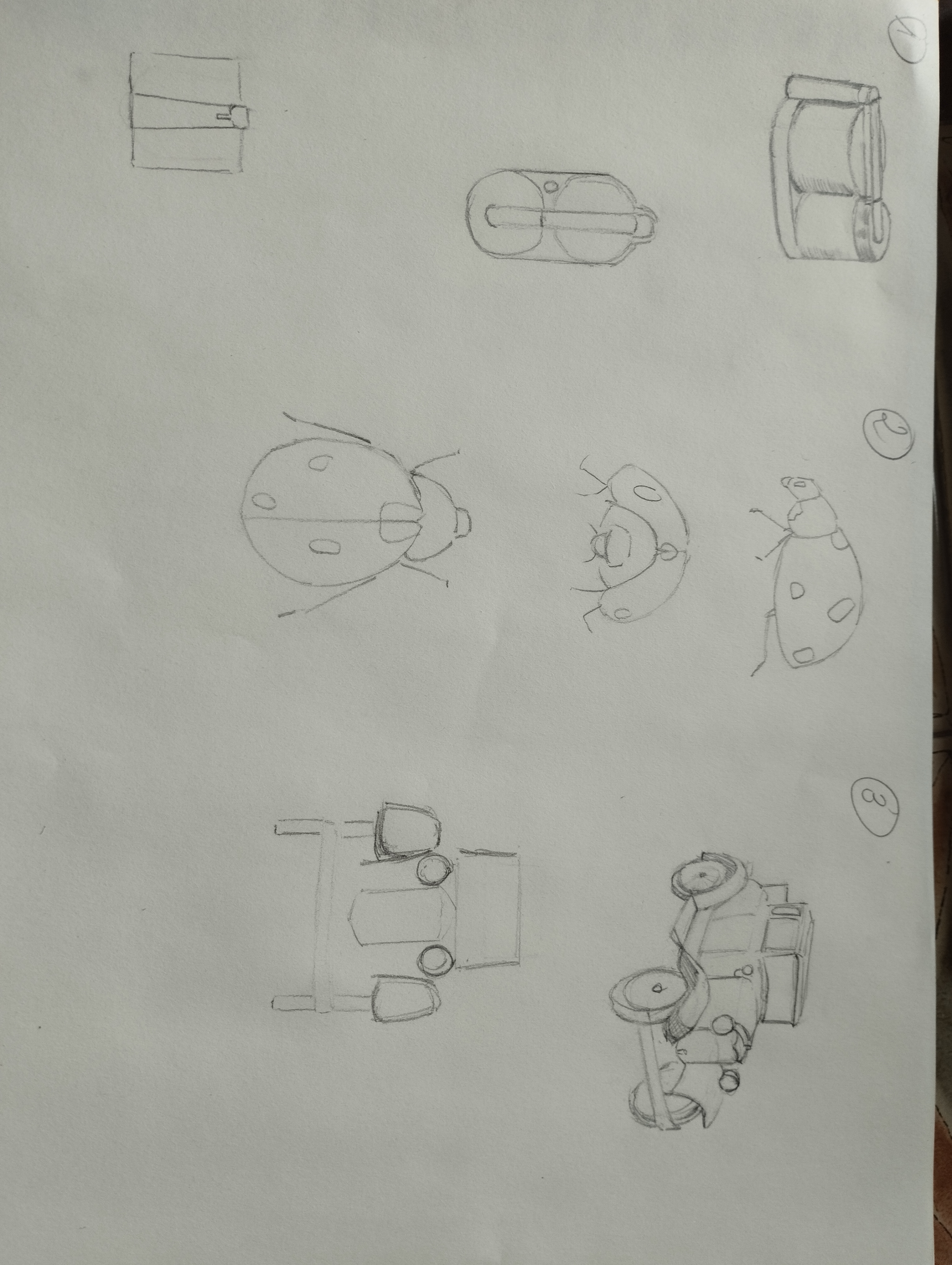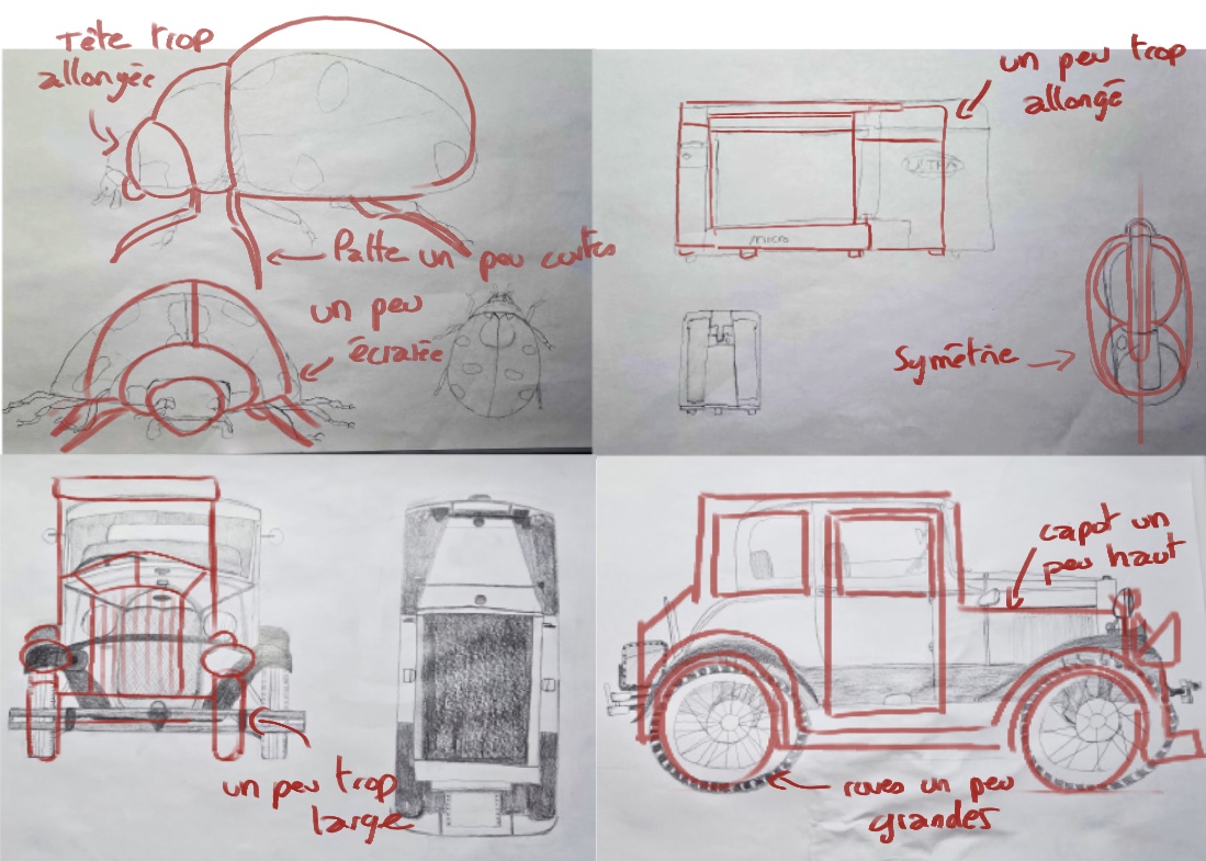 Para volver a sus dibujos, en general son muy buenos. Hay algunos detalles para revisar las proporciones, especialmente en el automóvil visto desde el frente, o la mariquita vista desde arriba, lo cual es demasiado agudo.
